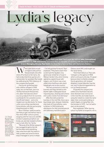 Having set up the business with a fellow refugee in 1949, Lydia, her son Kenneth, and now md Paul have built the business into Jakar International, which sources products from 12 countries worldwide for its customers across the UK and Ireland – and is the longest-serving distributor for Swiss colour and writing manufacturer Caran d’Ache, with the partnership stretching back to 1960.