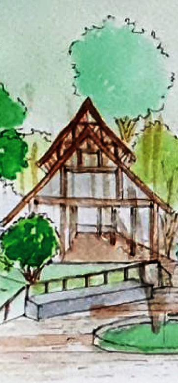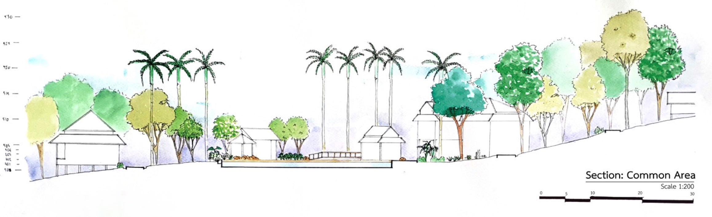 หลังนี โดยให�พื นที่ในตัวอาคีารมีองคี์ประกอบของโต๊ะ และที่นังเพื อใชี�สาหรับการที่ากิจกรรมต่างๆในระหว่าง วัน รวมถ่งระยะของหลังคีาที่มีการยืนให�คีรอบคีุมตัว อาคีารเพื อบังแดดและฝน