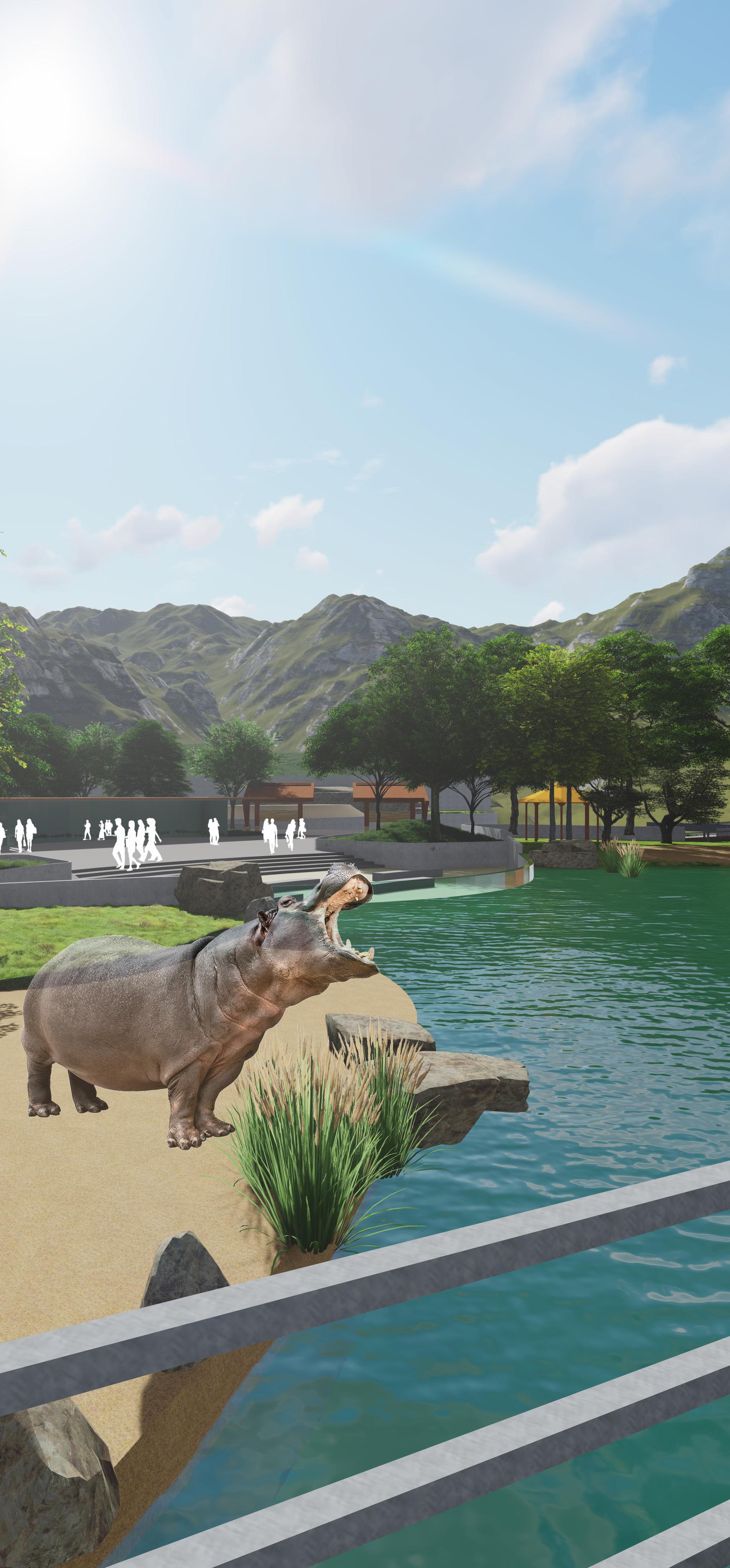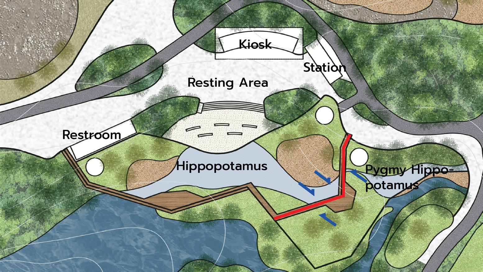 0 5 10 20 35 ตังอยู่ตาแหน่งเดิมแตมีการปรับ ที่างเข�าสาหรับที่างเดินลอยฟื้้า และปรับให�เป็นพื นที่พักผู้่อน สาหรับผู้�เข�าชีม รวมถ่งการกัน บ่อฮิิปโปโปเตมัสกับบ่อนาเดิม เพื อบาบัดนาและใชี�จัดแสดง บริเวณส่วนด�านหน�า