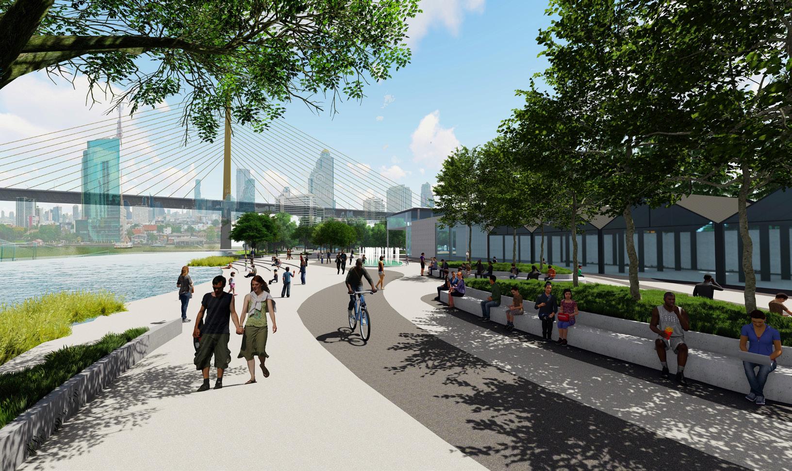 พื นที่ภายในสวนที่เปิดให�เข�าใชี�งานฟื้ร โดยในพื นที่ส่วนนีจะเป็นจุดเด่นของ โคีรงการเพื อด่งดูดผู้�ใชี�งานใหมด�วยจุดชีมวิวแมนาเจ�าพระยา ที่างเดินริมนาเพิ ม การมีปฏิิสัมพันธ์์กับนาและพื
