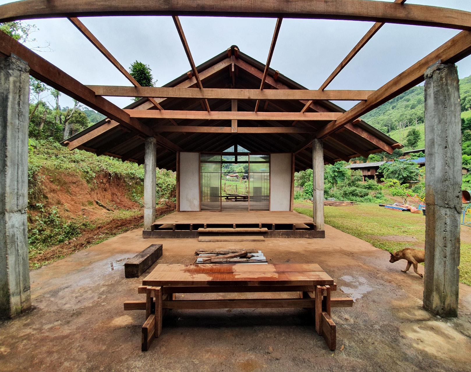 “โปรยฝนโรยเรือน” เลือกใชี�วัสดมคีวามเกียวเนือง กับวถีชีีวิตของคีนในชีุมชีน ที่ังการใชี�ไม�หรือการ เลือกมุงวัสดมุงหลังคีาด�วยกระเบืองลอนคีู่ที่ชีาว บ�านที่นีมคีวามชีานาญ่ในการก่อสร�าง ในส่วนของรูป ด�านอาคีารมีการกรุแผู้่นไฟื้เบอรซึ่ีเมนต์และแผู้่นโพล คีาร์บอเนตปิดไว�ในบางส่วน ซึ่่งไม�กระดานแผู้่นนีจะ เป็นเหมือนสมุดวาดเขียนขนาดใหญ่่ที่ให�เด็ก ๆ และ ชีาวบ�านทีุ่กคีนสามารถแต่งแต�มและร่วมกันบันที่่ก คีวามที่รงจาไว�ได�