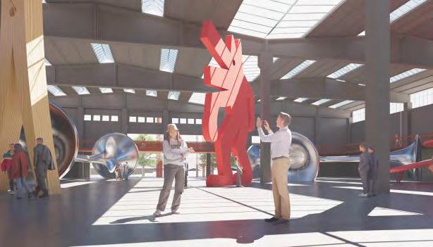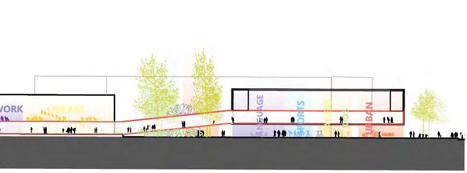 A large truss space frame links the new building to the existing structure. This integrated framework encloses a flexible arts installation plaza, while inside the bridge, a designated sculpture route guides visitors through an exhibition , showcasing art created by the inhabitants of Friedrichshain.