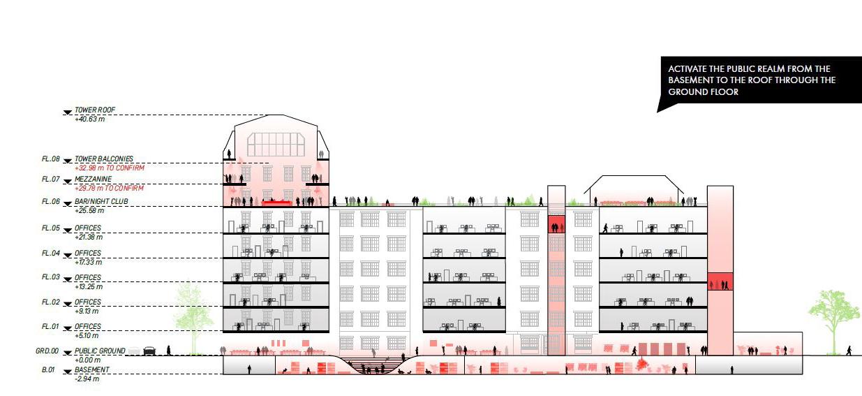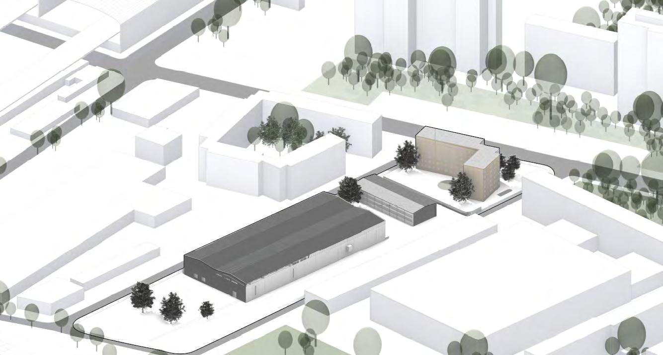 On the end of the plot, a subtle multi-functional square is designed to accommodate large events. The sculptural pole structures within this square serve multiple functions, providing electricity for markets, vehicle charging, and street lighting. Additionally, the square can be expanded by pulling up festival tents, thereby enlarging the dancing floor of Berghain, a renowned venue.