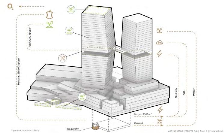 The design aims to achieve the highest level of sustainability by implementing closed loops that prevent any flow of energy, heat, waste, or water from escaping the building. All functions in the building enrich each other on the technical and the social aspect.