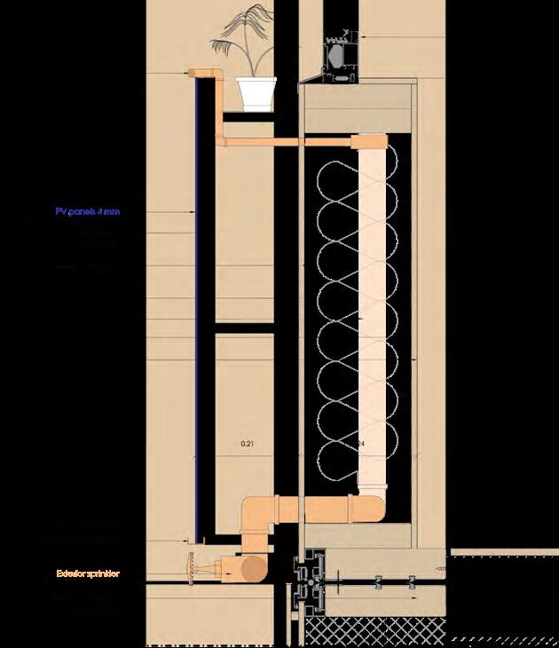 Wooden panelling for shading PV panels for energy generation. Sprinklers for fire safety, cleaning of PV panels and watering of plants.