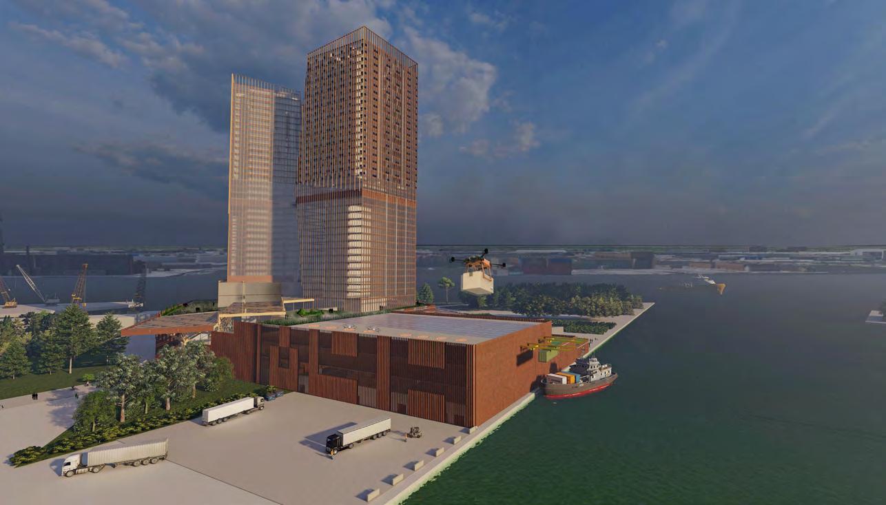 The program, arranged within two towers standing at almost 150 meters tall, along with a public open atrium, is strategically situated for optimal functionality. The distribution center is located at the ground floor along the water, ensuring excellent accessibility. Meanwhile, the hotel surrounds the data center, utilizing its excess heat, while also providing the best view and daylight exposure to the south. This thoughtful positioning and circular design approach result in a sustainable and eco-friendly architectural design.