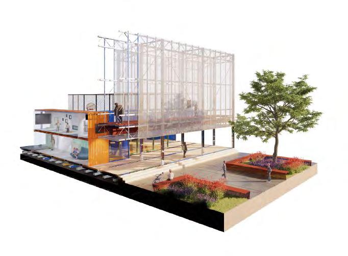 Constructed with a slim steel structure and cladded with a modest cohesive mesh of expanded metal, the screen houses installations to ensure the removable functions and activities that can be plugged-in.