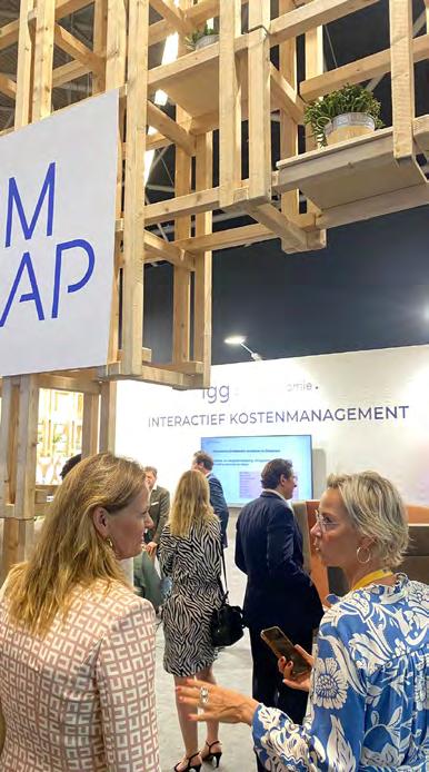 Re-design of the Provada stand of igg. Bouweconomie. The wooden module structure of the existing stand is re-used in a more open and inviting configuration. The new design is folded inwards to create a low treshold presentation area. A clear plan allows to give presentations while chats at the bar and the product counter can go on.