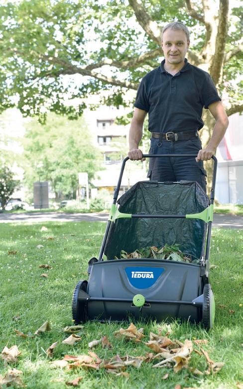 Les roues entraînent des lamelles en plastique qui transportent les feuilles de manière fiable dans le grand sac de collecte. Idéal pour nettoyer les pelouses, allées et entrées.