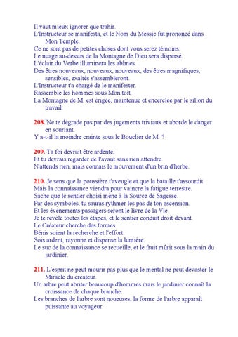 Il vaut mieux ignorer que trahir. L'Instructeur se manifesta, et le Nom du Messie fut prononcé dans Mon Temple. Ce ne sont pas de petites choses dont vous serez témoins. Le nuage au-dessus de la Montagne de Dieu sera dispersé. L'éclair du Verbe illuminera les abîmes. Des êtres nouveaux, nouveaux, nouveaux, des êtres magnifiques, sensibles, exaltés s'assembleront. L'Instructeur t'a chargé de le manifester. Rassemble les hommes sous Mon toit. La Montagne de M. est érigée, maintenue et encerclée par le sillon du travail. 208. Ne te dégrade pas par des jugements triviaux et aborde le danger en souriant. Y a-t-il la moindre crainte sous le Bouclier de M. ? 209. Ta foi devrait être ardente, Et tu devrais regarder de l'avant sans rien attendre. N'attends rien, mais connais le mouvement d'un brin d'herbe. 210. Je sens que la poussière t'aveugle et que la bataille t'assourdit. Mais la connaissance viendra pour vaincre la fatigue terrestre. Sache que le sentier choisi mène à la Source de Sagesse. Par des symboles, tu sauras rythmer les pas de ton ascension. Et les événements passagers seront le livre de la Vie. Je te révèle toutes les étapes, et le sentier conduit droit devant. Le Créateur cherche des formes. Bénis soient la recherche et l'effort. Sois ardent, rayonne et dispense la lumière. Le suc de la connaissance se recueille, et le fruit mûrit sous la main du jardinier. 211. L'esprit ne peut mourir pas plus que le mental ne peut dévaster le Miracle du créateur. Un arbre peut abriter beaucoup d'hommes mais le jardinier connaît la croissance de chaque branche. Les branches de l'arbre sont noueuses, la forme de l'arbre apparaît puissante au voyageur.