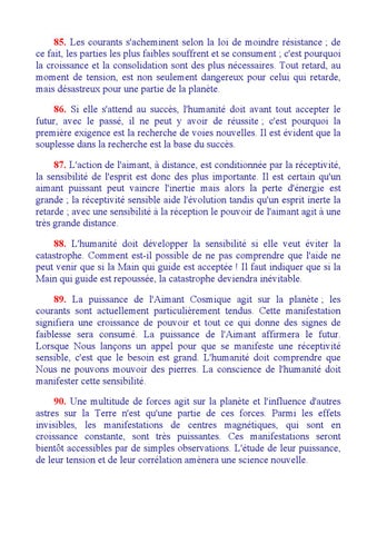 85. Les courants s'acheminent selon la loi de moindre résistance ; de ce fait, les parties les plus faibles souffrent et se consument ; c'est pourquoi la croissance et la consolidation sont des plus nécessaires. Tout retard, au moment de tension, est non seulement dangereux pour celui qui retarde, mais désastreux pour une partie de la planète. 86. Si elle s'attend au succès, l'humanité doit avant tout accepter le futur, avec le passé, il ne peut y avoir de réussite ; c'est pourquoi la première exigence est la recherche de voies nouvelles. Il est évident que la souplesse dans la recherche est la base du succès. 87. L'action de l'aimant, à distance, est conditionnée par la réceptivité, la sensibilité de l'esprit est donc des plus importante. Il est certain qu'un aimant puissant peut vaincre l'inertie mais alors la perte d'énergie est grande ; la réceptivité sensible aide l'évolution tandis qu'un esprit inerte la retarde ; avec une sensibilité à la réception le pouvoir de l'aimant agit à une très grande distance. 88. L'humanité doit développer la sensibilité si elle veut éviter la catastrophe. Comment est-il possible de ne pas comprendre que l'aide ne peut venir que si la Main qui guide est acceptée ! Il faut indiquer que si la Main qui guide est repoussée, la catastrophe deviendra inévitable. 89. La puissance de l'Aimant Cosmique agit sur la planète ; les courants sont actuellement particulièrement tendus. Cette manifestation signifiera une croissance de pouvoir et tout ce qui donne des signes de faiblesse sera consumé. La puissance de l'Aimant affirmera le futur. Lorsque Nous lançons un appel pour que se manifeste une réceptivité sensible, c'est que le besoin est grand. L'humanité doit comprendre que Nous ne pouvons mouvoir des pierres. La conscience de l'humanité doit manifester cette sensibilité. 90. Une multitude de forces agit sur la planète et l'influence d'autres astres sur la Terre n'est qu'une partie de ces forces. Parmi les effets invisibles, les manifestations de centres magnétiques, qui sont en croissance constante, sont très puissantes. Ces manifestations seront bientôt accessibles par de simples observations. L'étude de leur puissance, de leur tension et de leur corrélation amènera une science nouvelle.