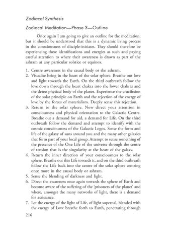 Zodiacal Synthesis Zodiacal Meditation—Phase 3—Outline Once again I am going to give an outline for the meditation, but it should be understood that this is a dynamic living process in the consciousness of disciple-initiates. They should therefore be experiencing these identifications and energies as such and paying careful attention to where their awareness is drawn as part of the ashram at any particular solstice or equinox. 1. Centre awareness in the causal body or the ashram. 2. Visualise being in the heart of the solar sphere. Breathe out love and light towards the Earth. On the third outbreath follow the love down through the heart chakra into the lower chakras and the dense physical body of the planet. Experience the crucifixion of the solar principle on Earth and the rejection of the energy of love by the forces of materialism. Deeply sense this rejection. 3. Return to the solar sphere. Now direct your attention in consciousness and physical orientation to the Galactic Centre. Breathe out a demand for aid, a demand for Life. On the third outbreath follow the demand and attempt to identify with the cosmic consciousness of the Galactic Logos. Sense the form and life of the galaxy of suns around you and the many other galaxies that form part of your local group. Attempt to sense something of the presence of the One Life of the universe through the centre of tension that is the singularity at the heart of the galaxy. 4. Return the inner direction of your consciousness to the solar sphere. Breathe out this Life towards it, and on the third outbreath follow the Life back into the centre of the solar sphere centring once more in the causal body or ashram. 5. Sense the blending of darkness and light. 6. Direct the awareness once again towards the sphere of Earth and become aware of the suffering of the ‘prisoners of the planet’ and where, amongst the many networks of light, there is a demand for assistance. 7. Let the energy of the light of Life, of light supernal, blended with the energy of Love breathe forth to Earth, penetrating through 216