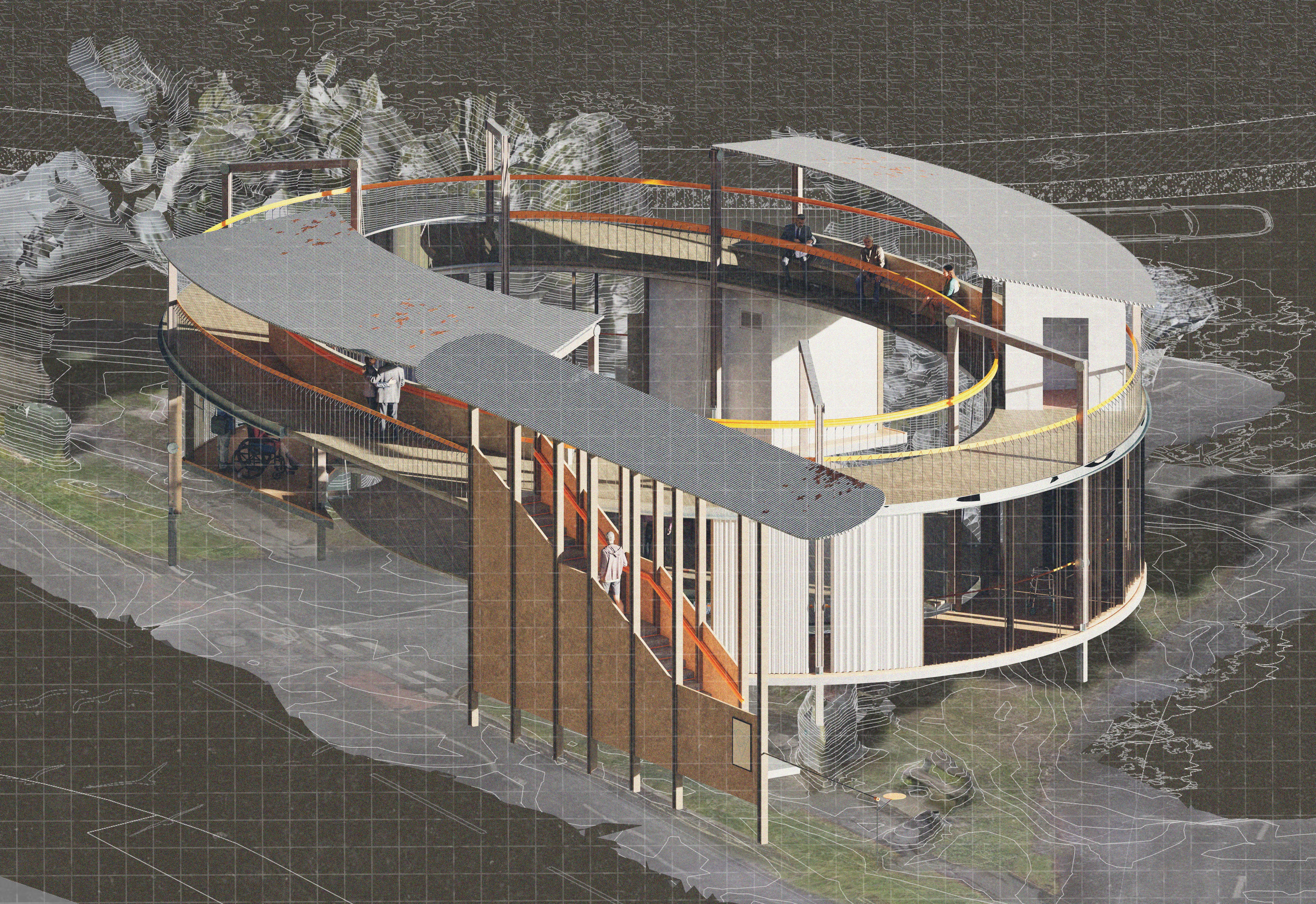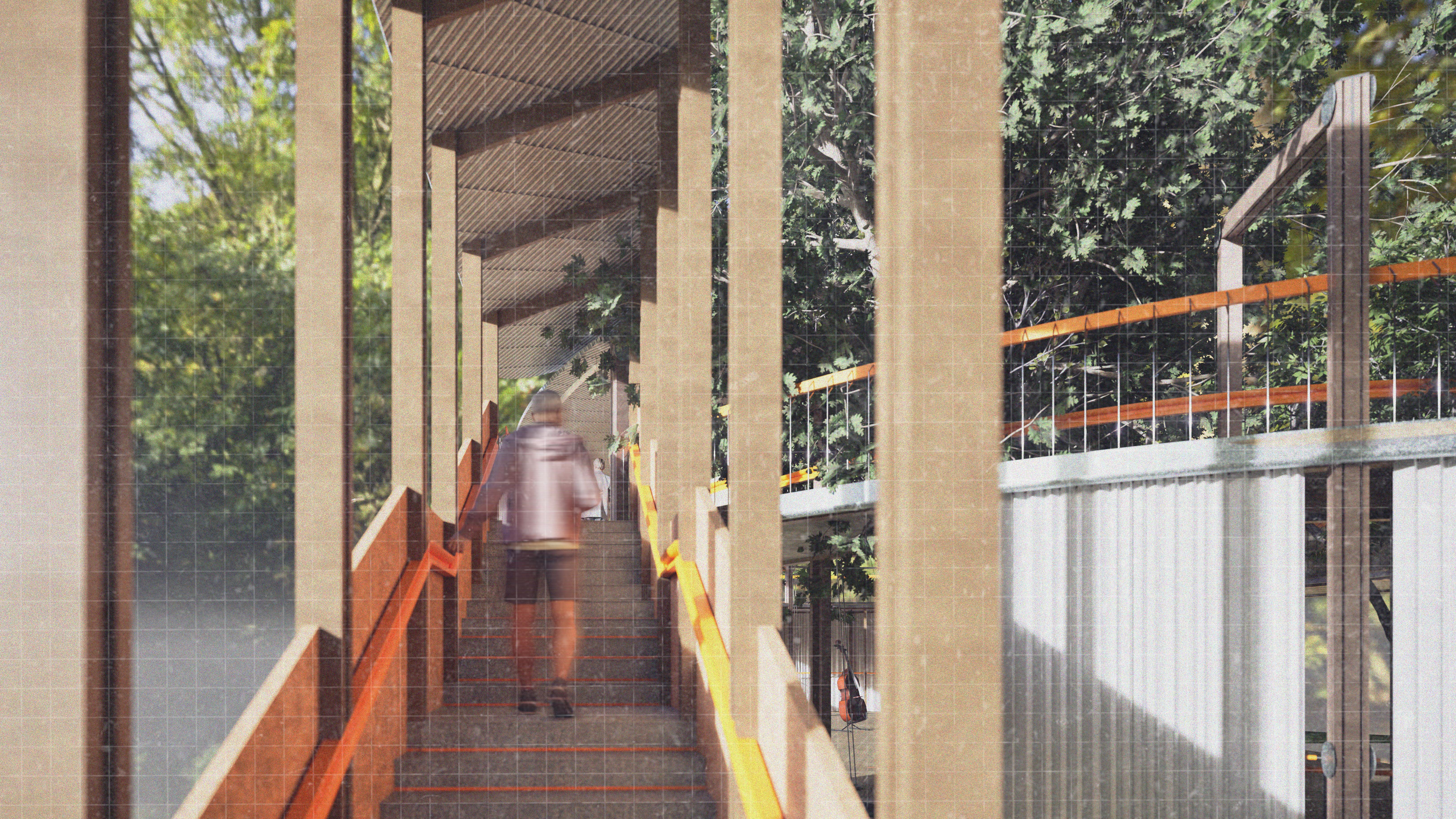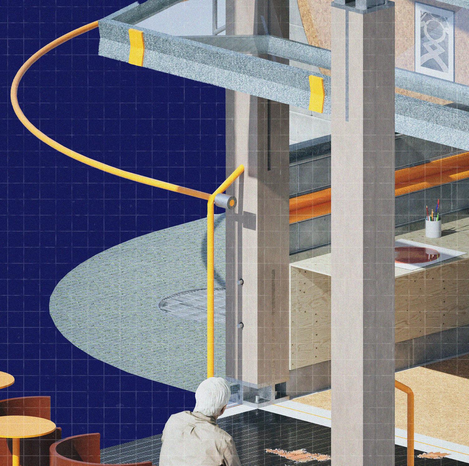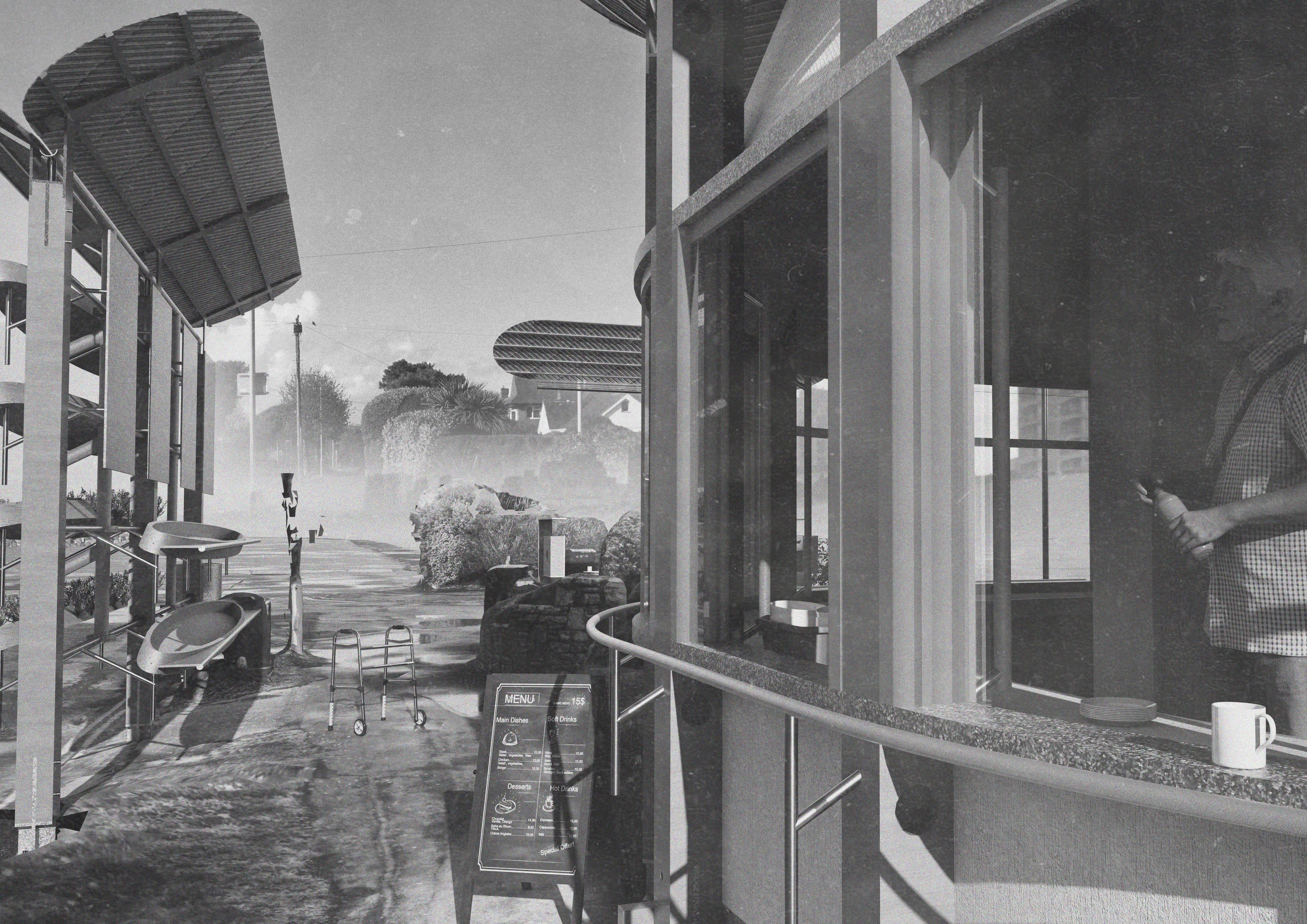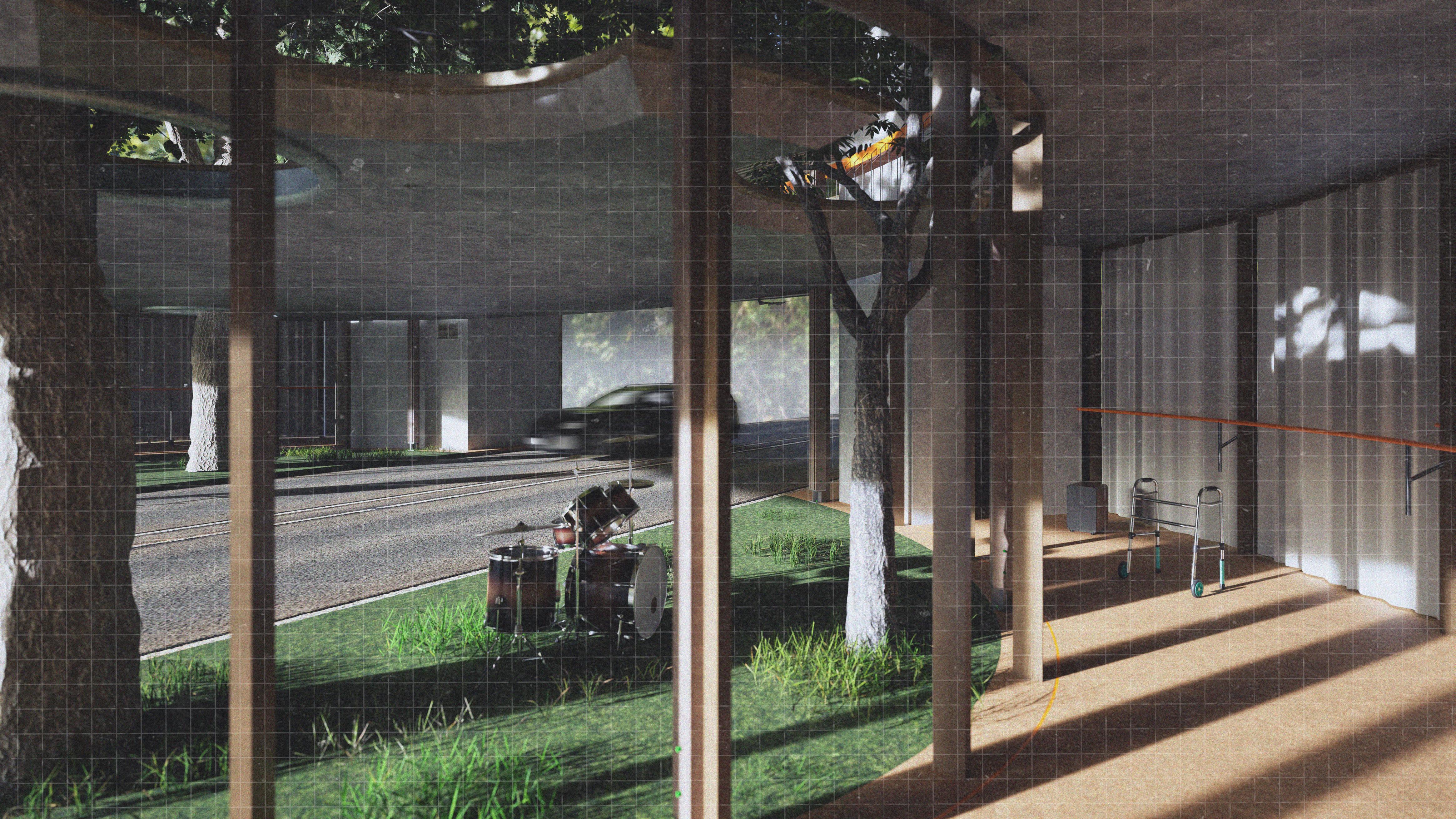 A music folly/ sound garden a structure for group singing, performance or listening. A flexible stage and listening space that can shift vertically up and down to allow for cars to move underneath, facilitating musical play, quiet listening and social connection. Music therapy is typically used in care homes as a communal activity that improves mood, social interaction, and memory recall. The intervention uses acoustic forms, storage for musical instruments and equipment and hanging, tactile instruments where the building becomes something that is playable. The intervention will be roofed with corrugated iron, catching rain sounds. Structural framing will include places to attach instruments and resonant materials, creating a connection with the workshop intervention and facilitating collaboration.