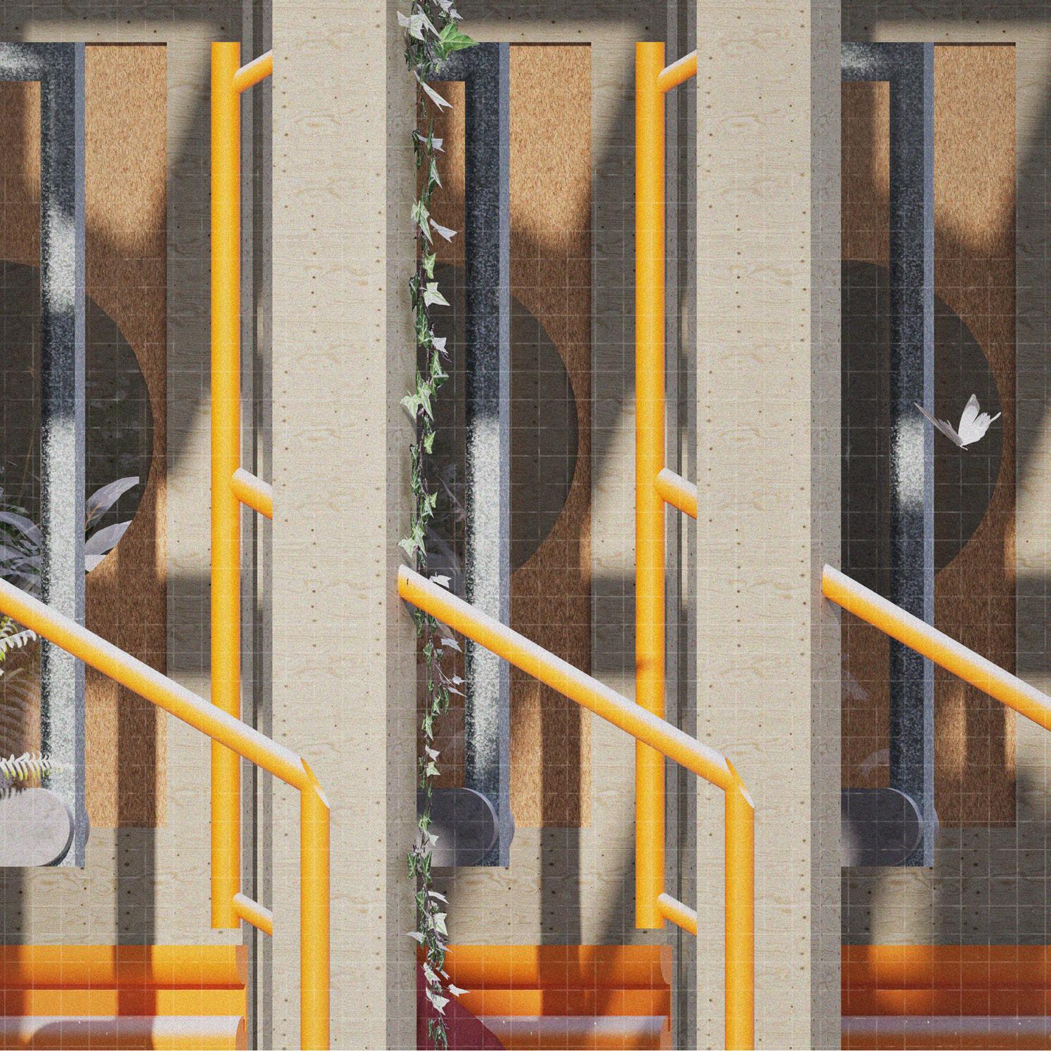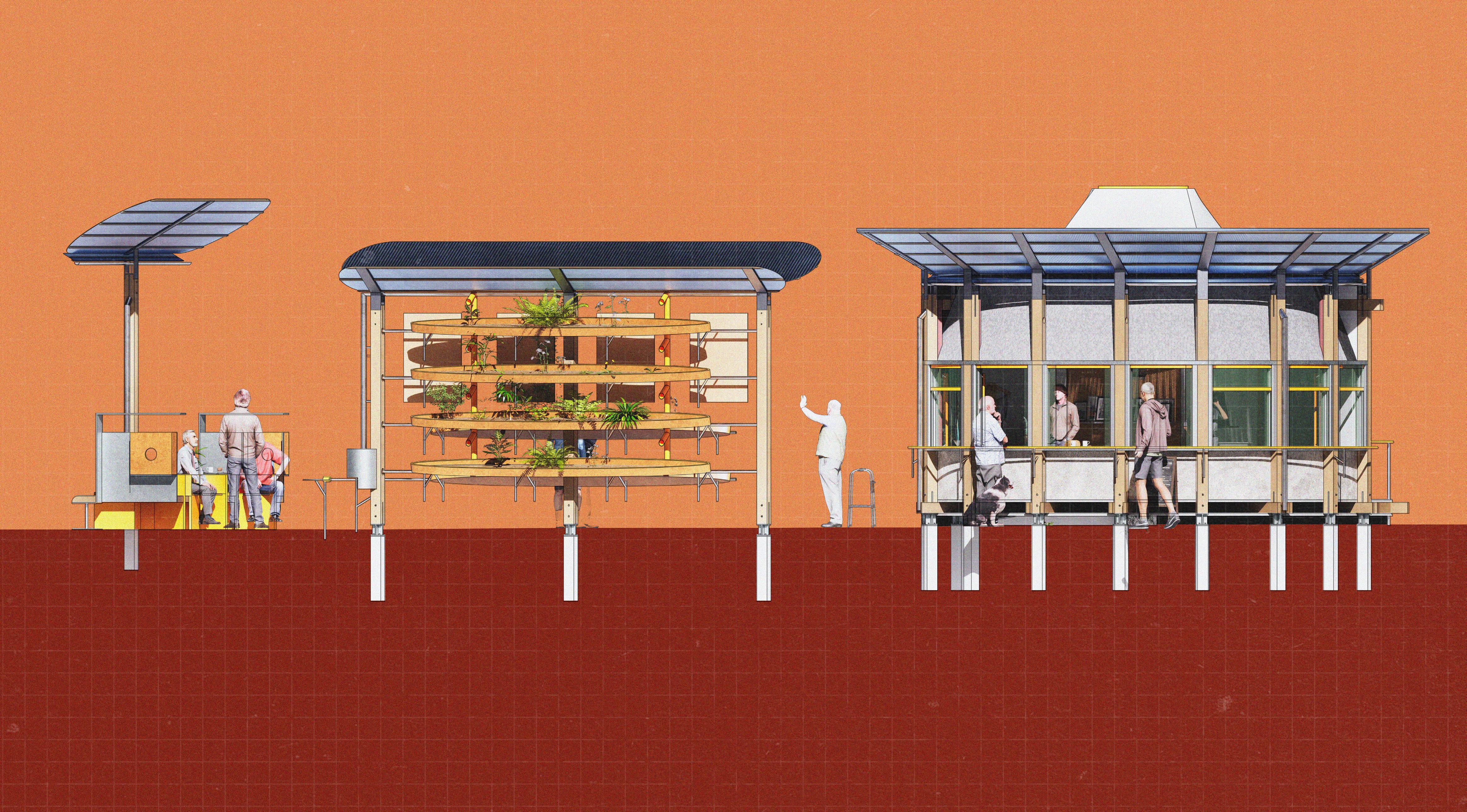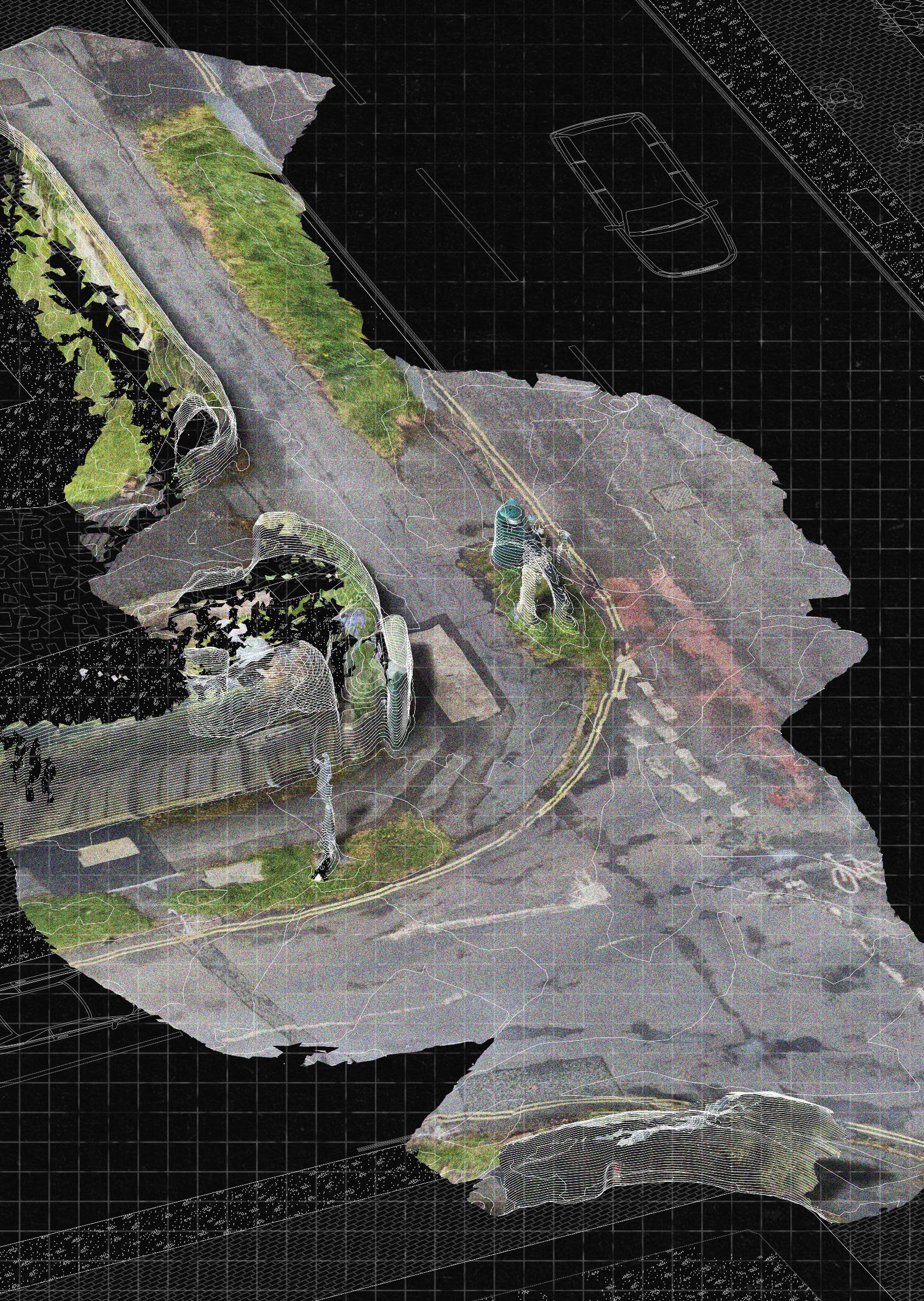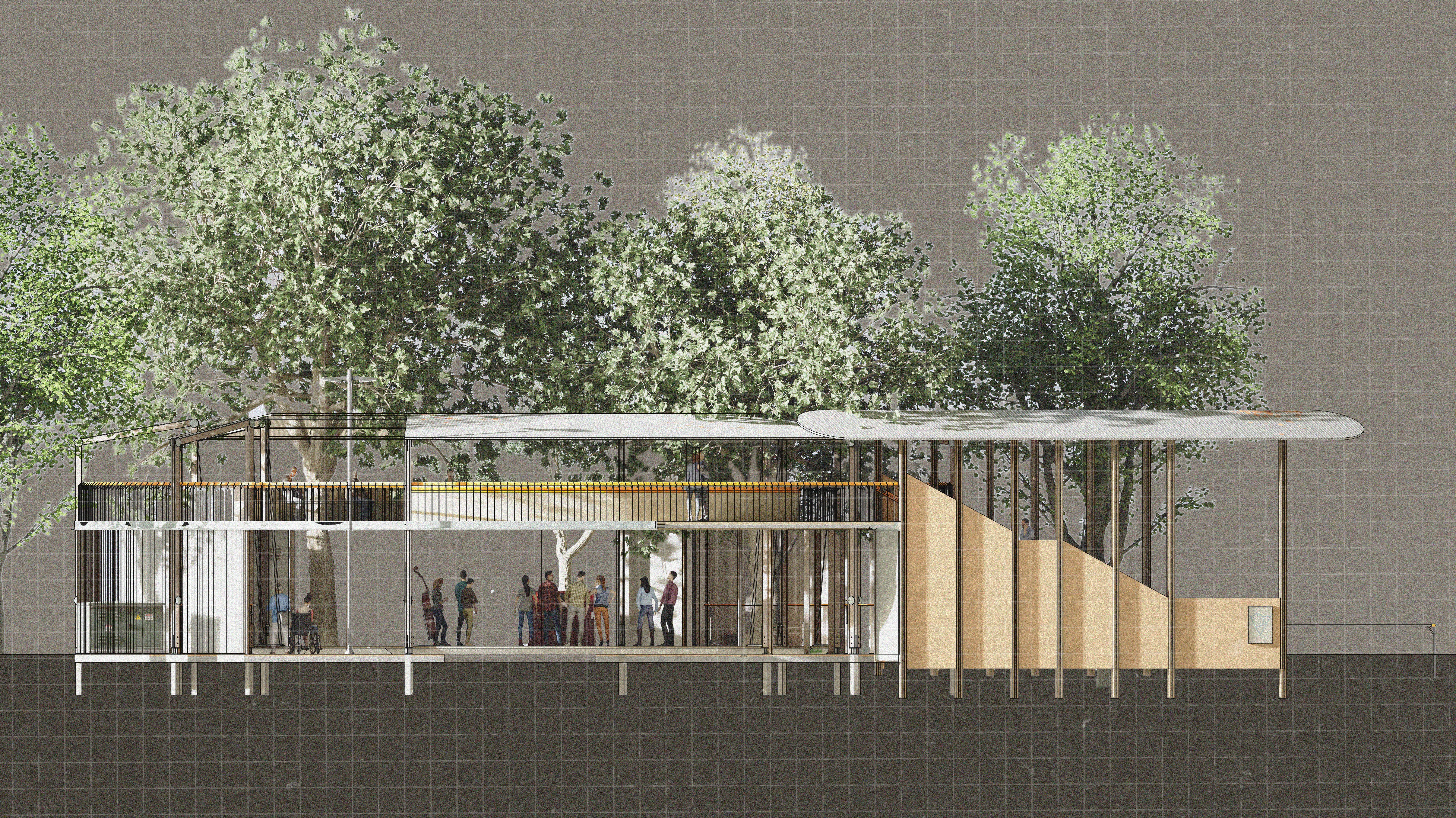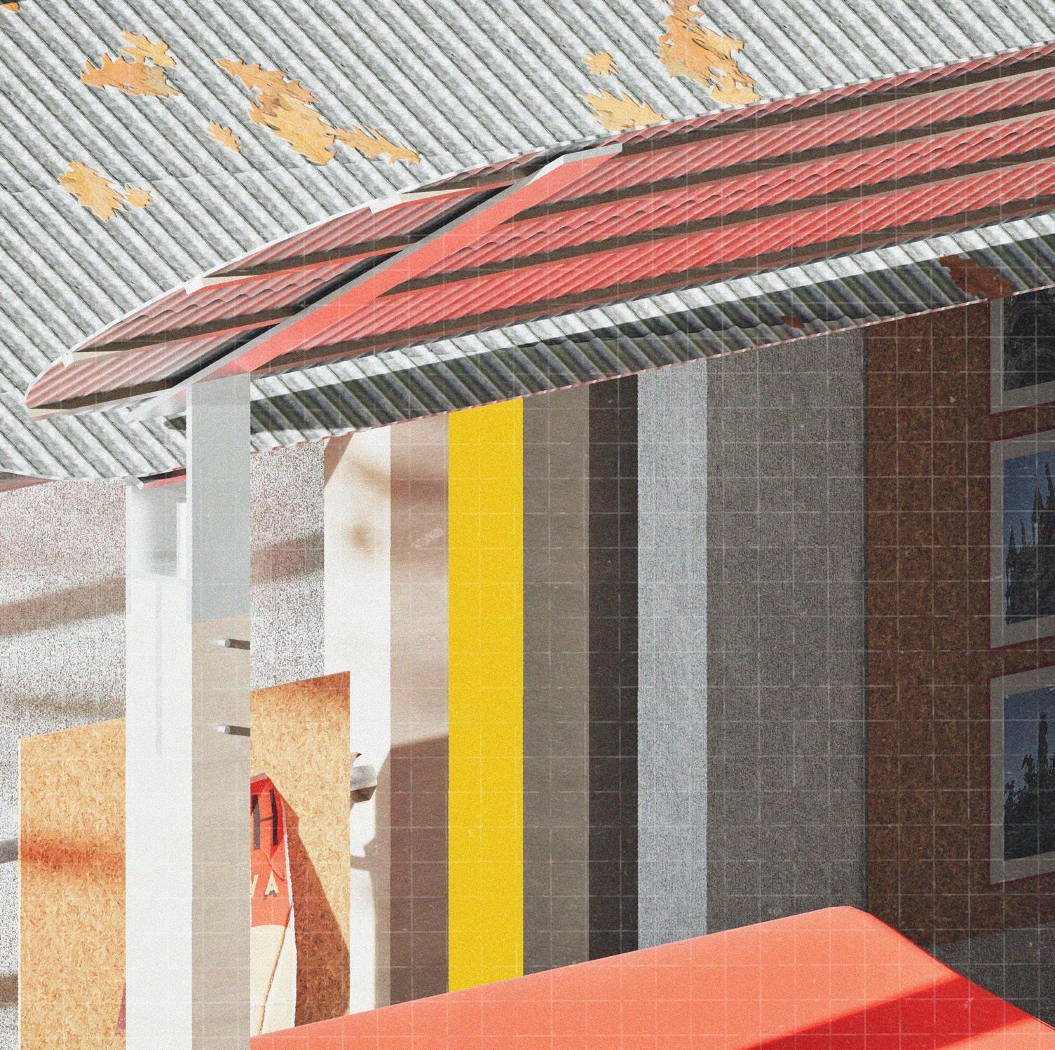 A music folly/ sound garden a structure for group singing, performance or listening. A flexible stage and listening space that can shift vertically up and down to allow for cars to move underneath, facilitating musical play, quiet listening and social connection. Music therapy is typically used in care homes as a communal activity that improves mood, social interaction, and memory recall. The intervention uses acoustic forms, storage for musical instruments and equipment and hanging, tactile instruments where the building becomes something that is playable. The intervention will be roofed with corrugated iron, catching rain sounds. Structural framing will include places to attach instruments and resonant materials, creating a connection with the workshop intervention and facilitating collaboration.