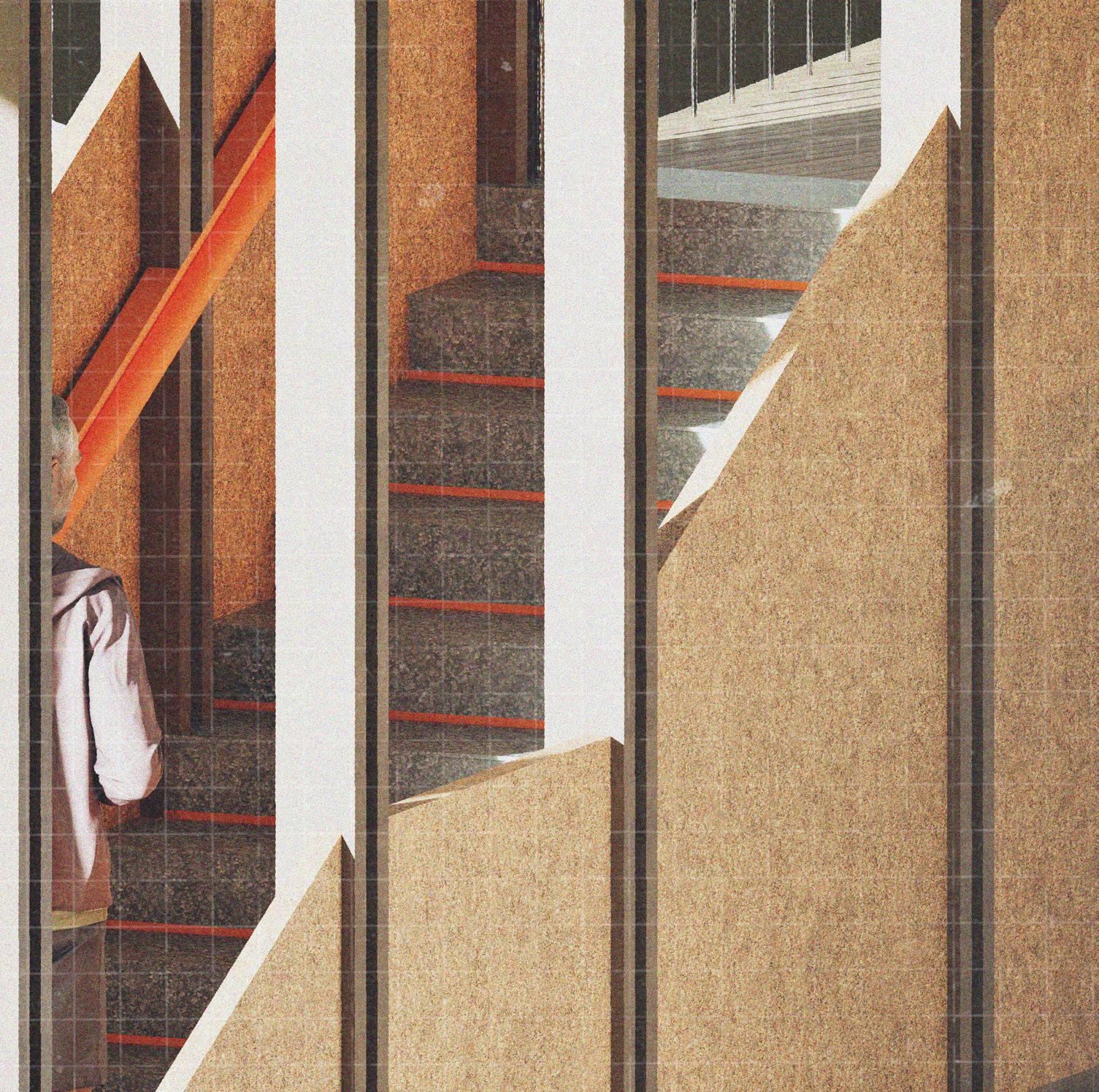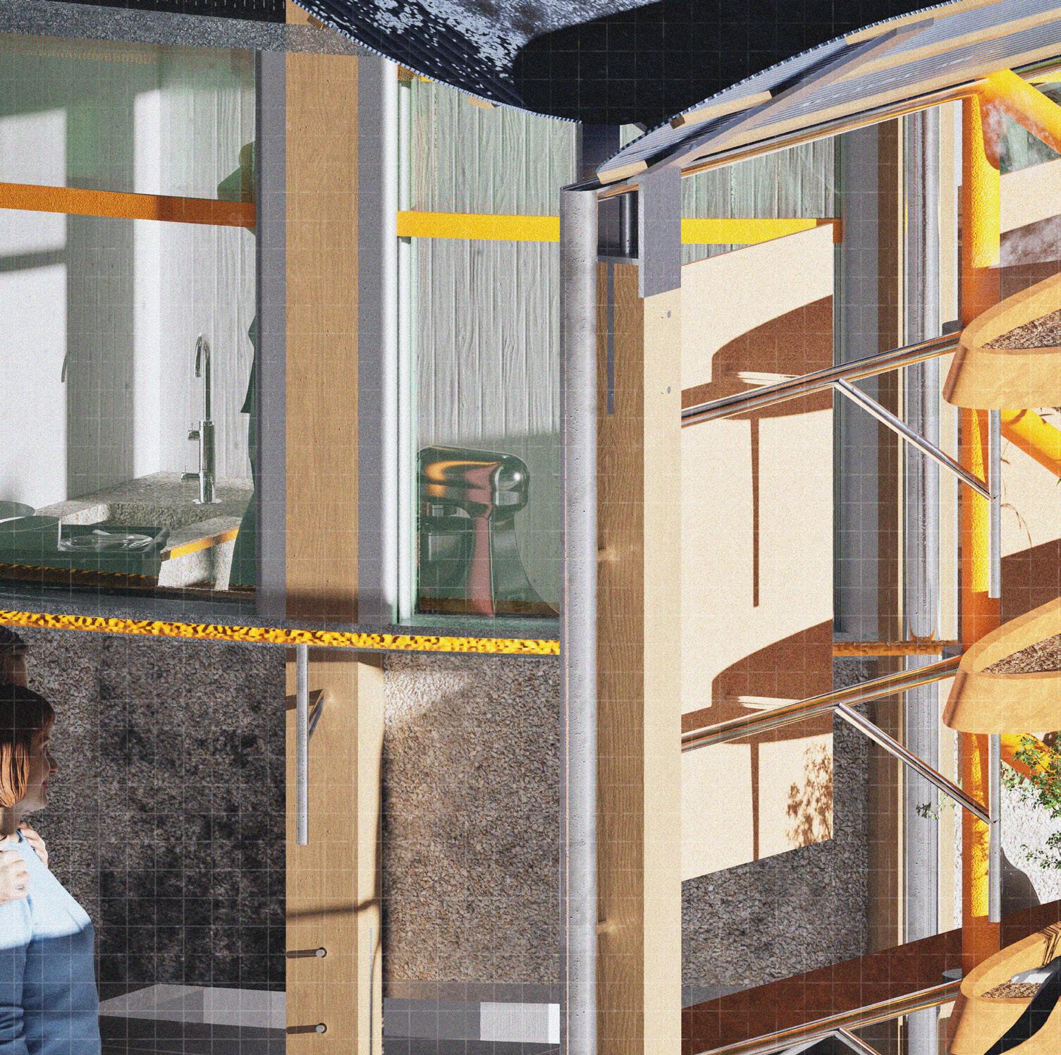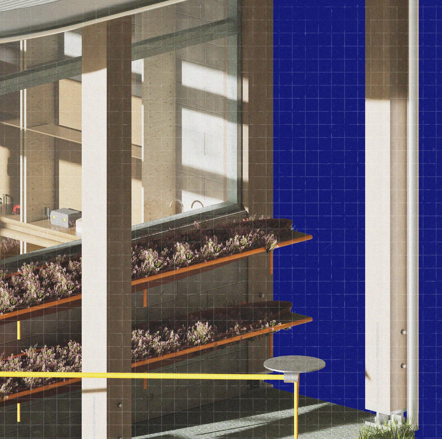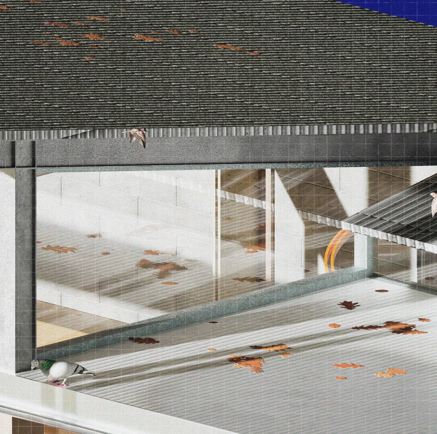 A music folly/ sound garden a structure for group singing, performance or listening. A flexible stage and listening space that can shift vertically up and down to allow for cars to move underneath, facilitating musical play, quiet listening and social connection. Music therapy is typically used in care homes as a communal activity that improves mood, social interaction, and memory recall. The intervention uses acoustic forms, storage for musical instruments and equipment and hanging, tactile instruments where the building becomes something that is playable. The intervention will be roofed with corrugated iron, catching rain sounds. Structural framing will include places to attach instruments and resonant materials, creating a connection with the workshop intervention and facilitating collaboration.