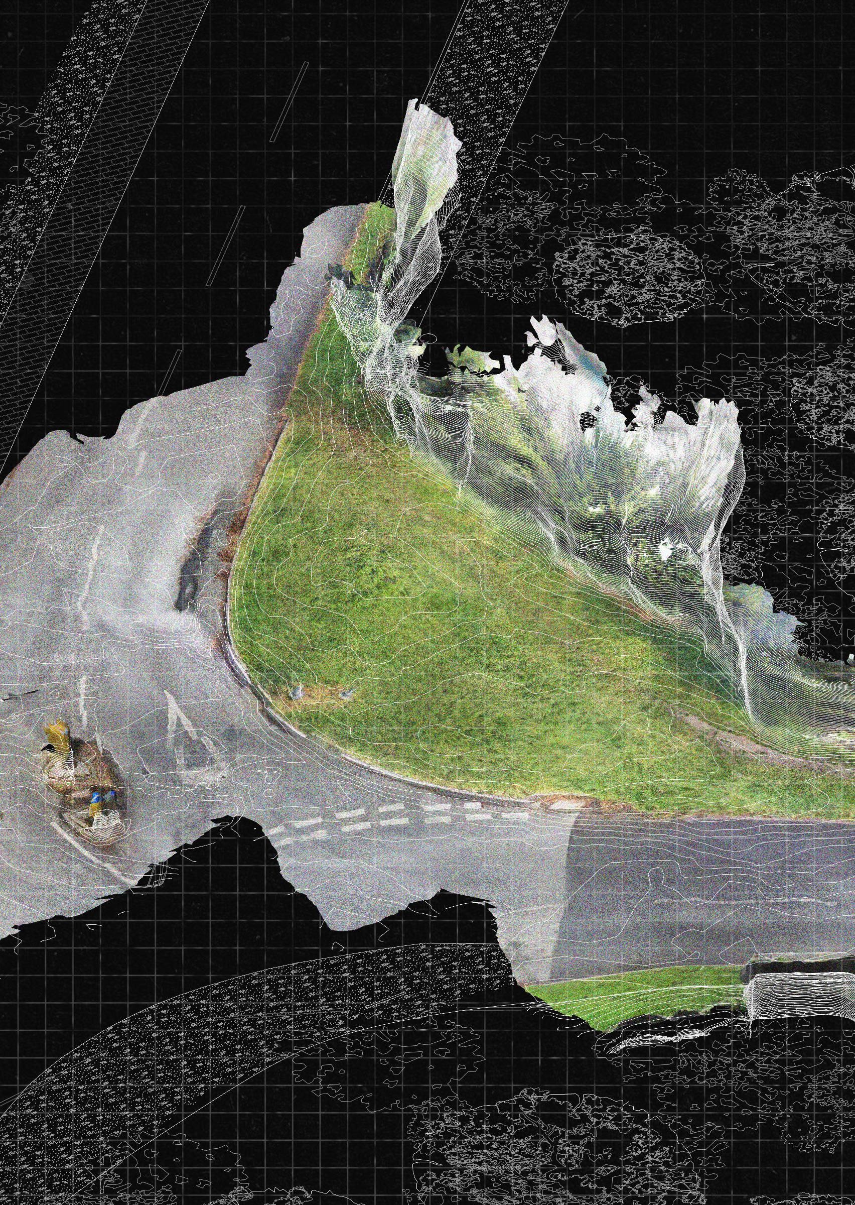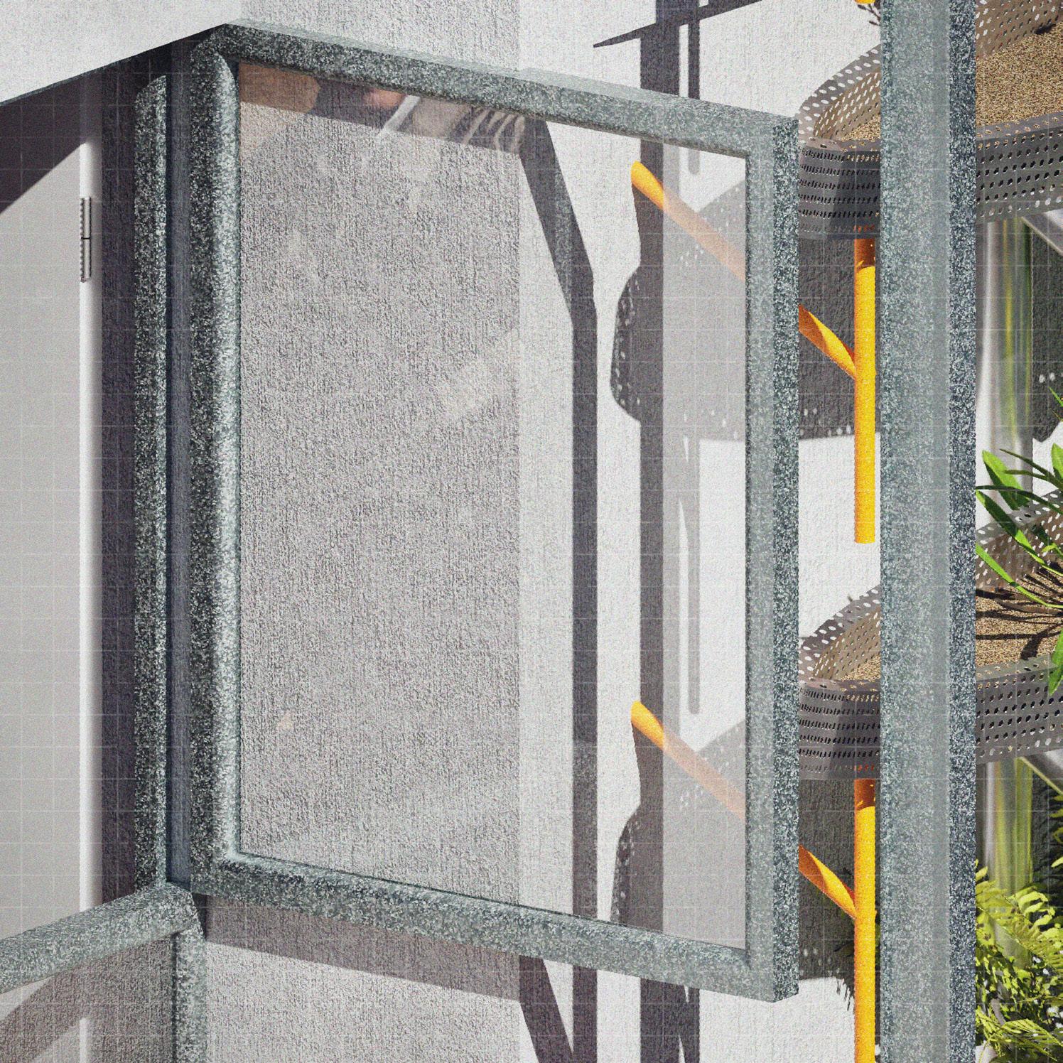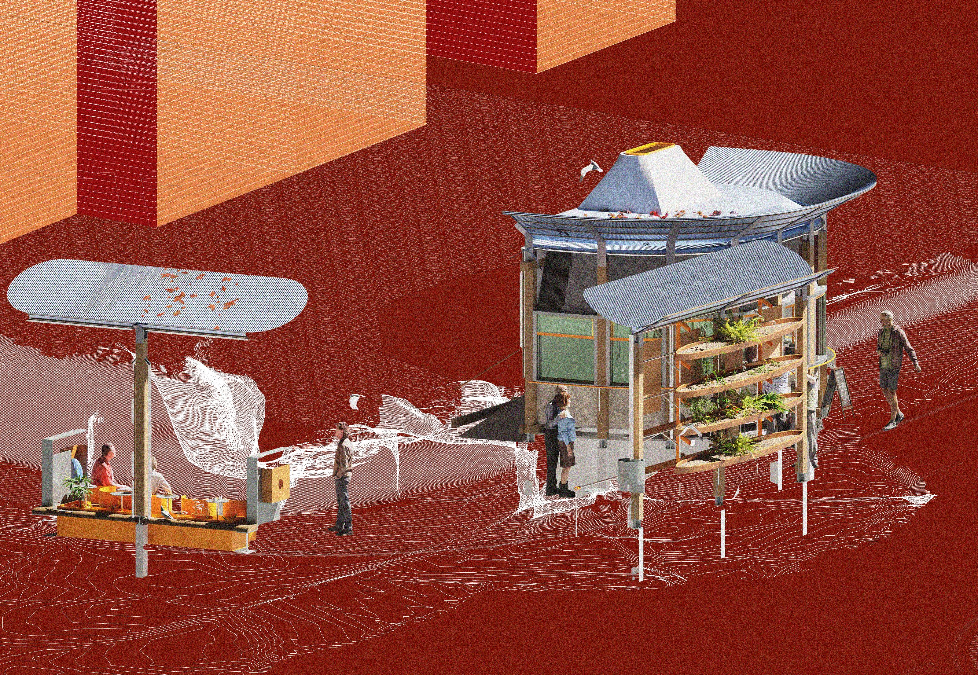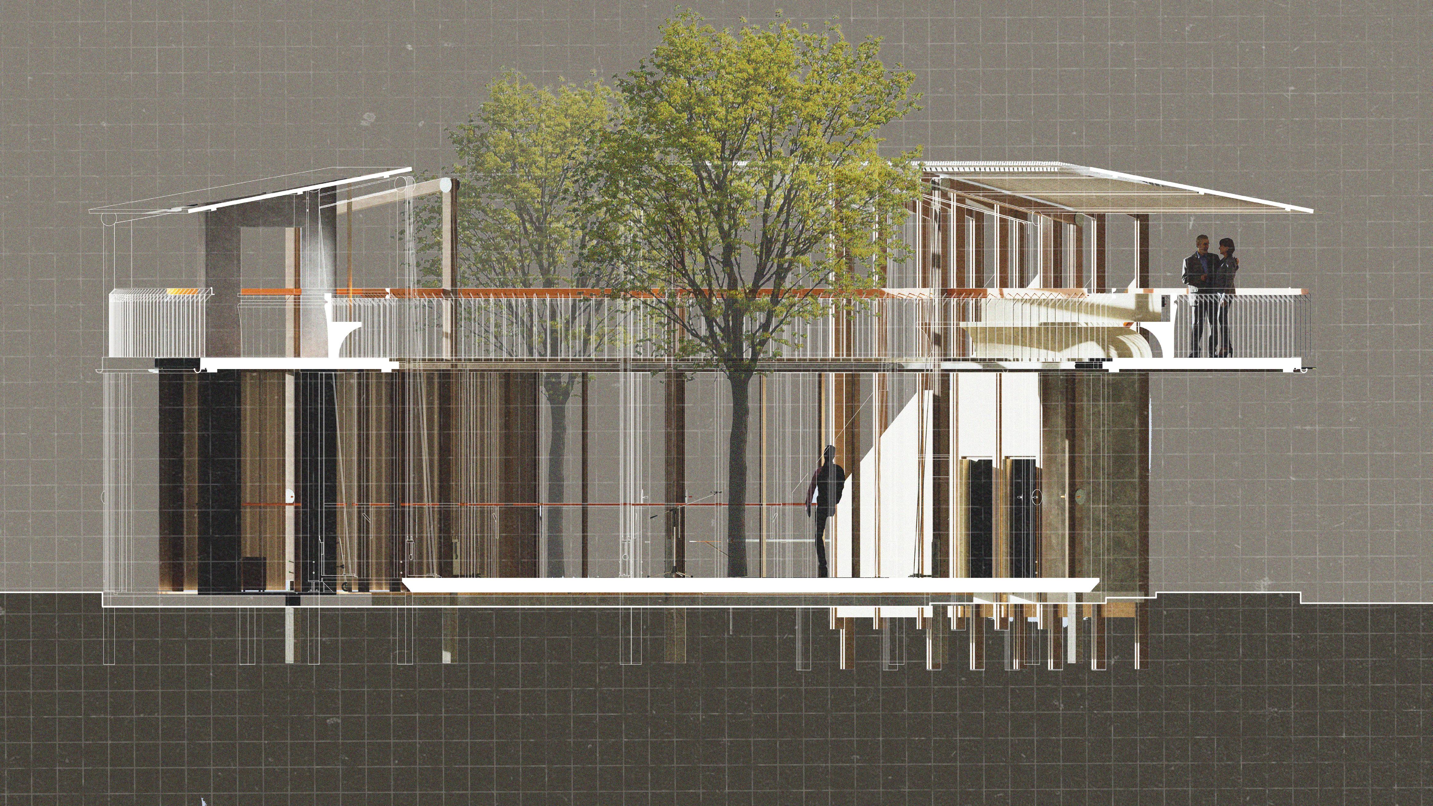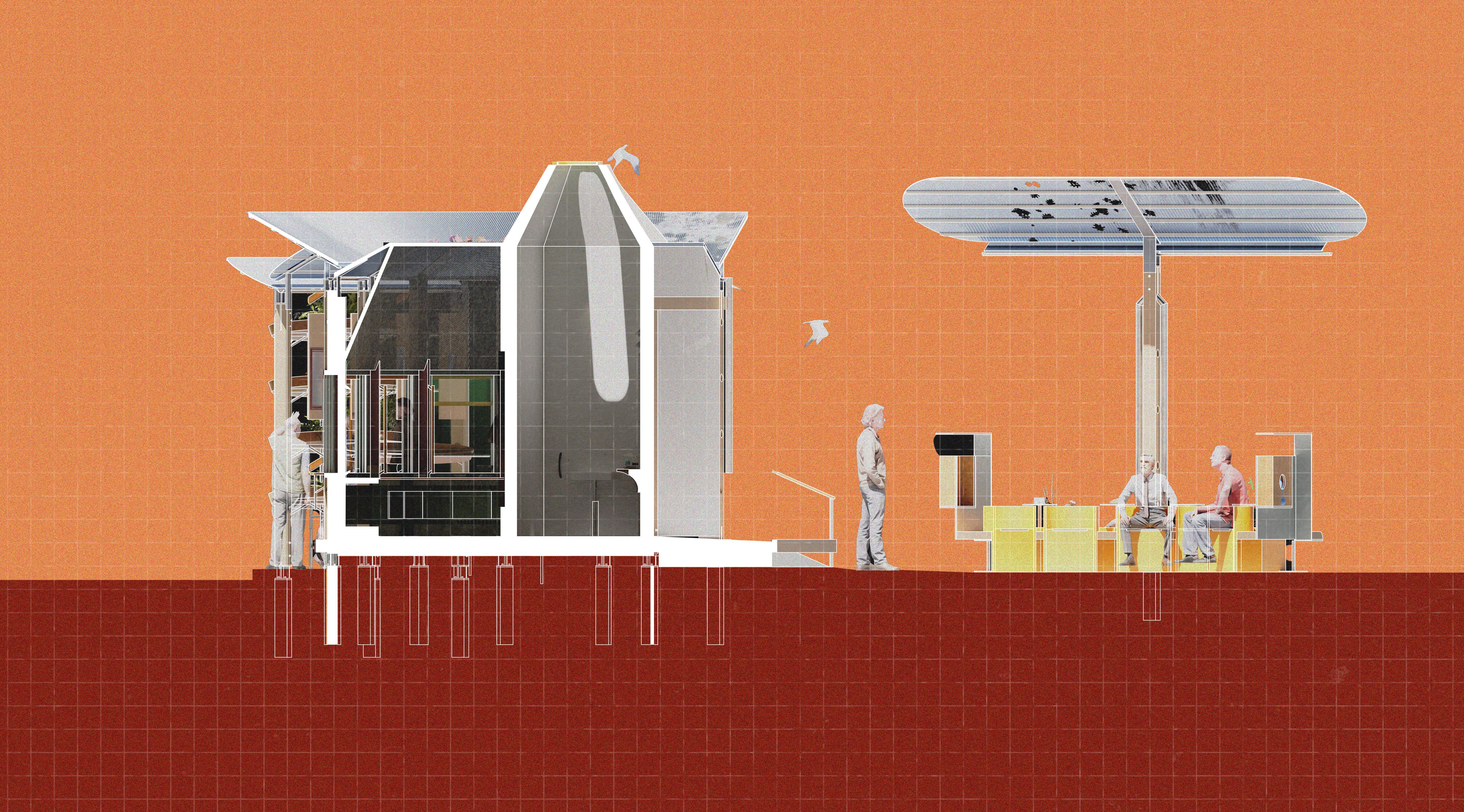 A music folly/ sound garden a structure for group singing, performance or listening. A flexible stage and listening space that can shift vertically up and down to allow for cars to move underneath, facilitating musical play, quiet listening and social connection. Music therapy is typically used in care homes as a communal activity that improves mood, social interaction, and memory recall. The intervention uses acoustic forms, storage for musical instruments and equipment and hanging, tactile instruments where the building becomes something that is playable. The intervention will be roofed with corrugated iron, catching rain sounds. Structural framing will include places to attach instruments and resonant materials, creating a connection with the workshop intervention and facilitating collaboration.