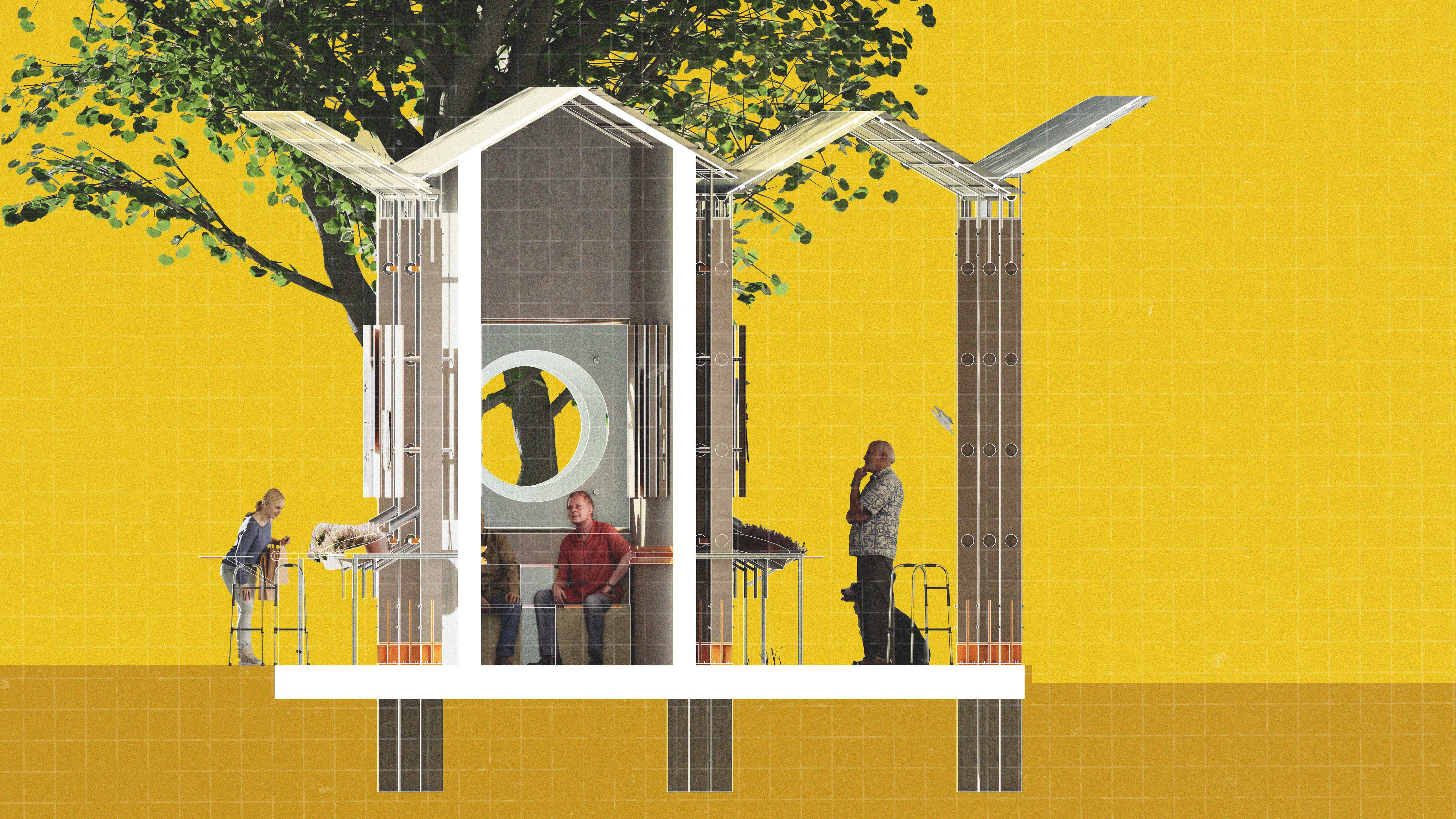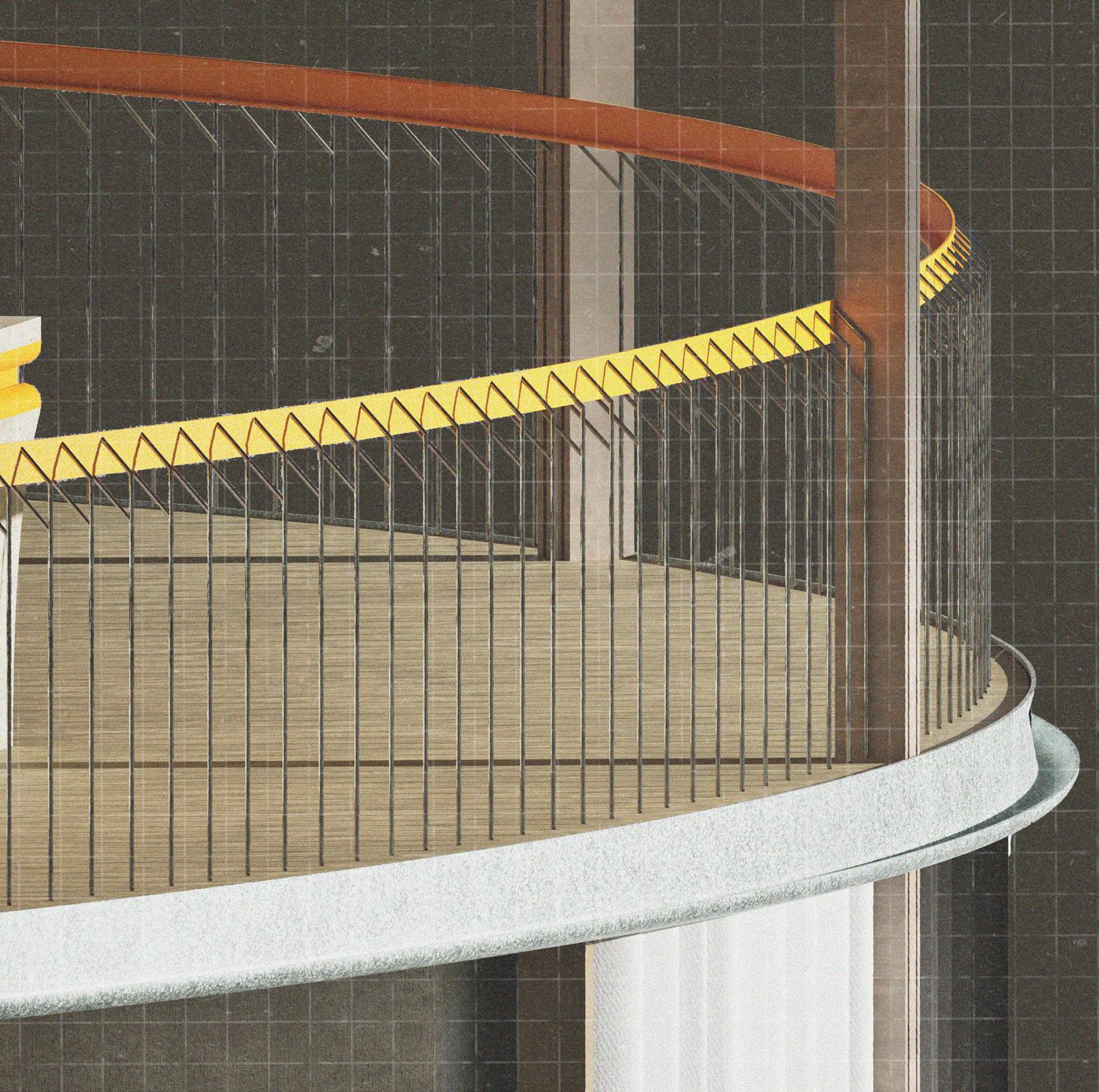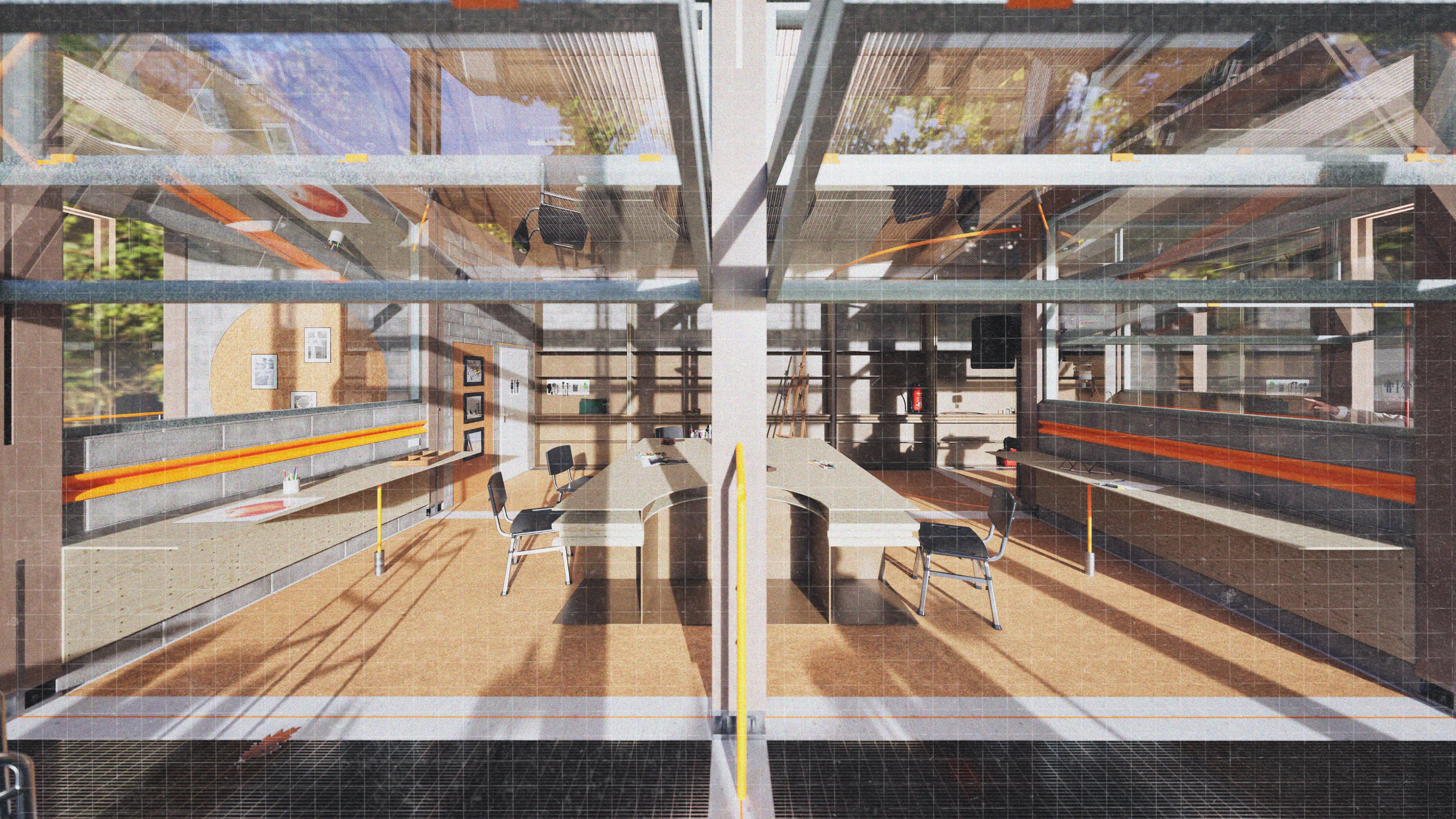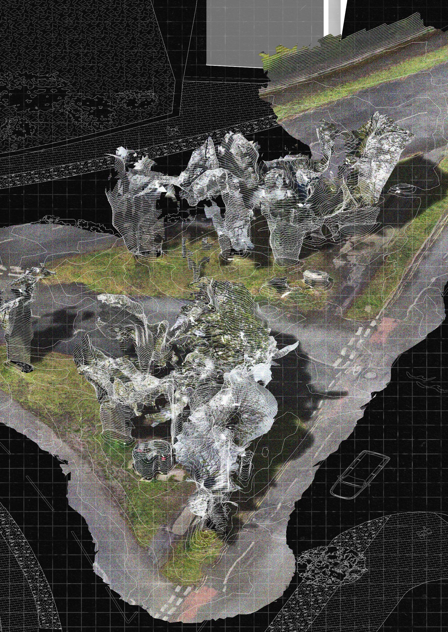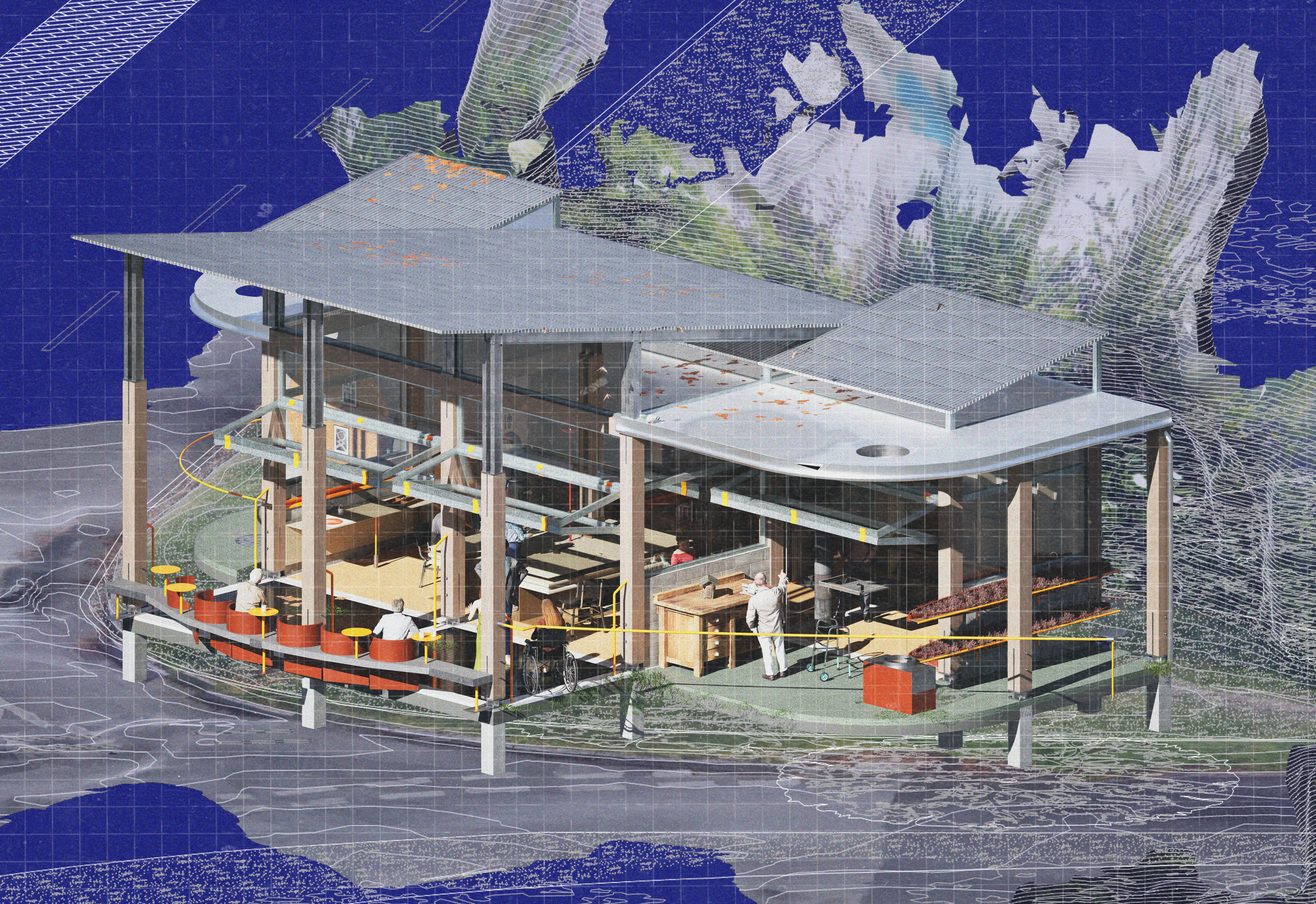 A music folly/ sound garden a structure for group singing, performance or listening. A flexible stage and listening space that can shift vertically up and down to allow for cars to move underneath, facilitating musical play, quiet listening and social connection. Music therapy is typically used in care homes as a communal activity that improves mood, social interaction, and memory recall. The intervention uses acoustic forms, storage for musical instruments and equipment and hanging, tactile instruments where the building becomes something that is playable. The intervention will be roofed with corrugated iron, catching rain sounds. Structural framing will include places to attach instruments and resonant materials, creating a connection with the workshop intervention and facilitating collaboration.