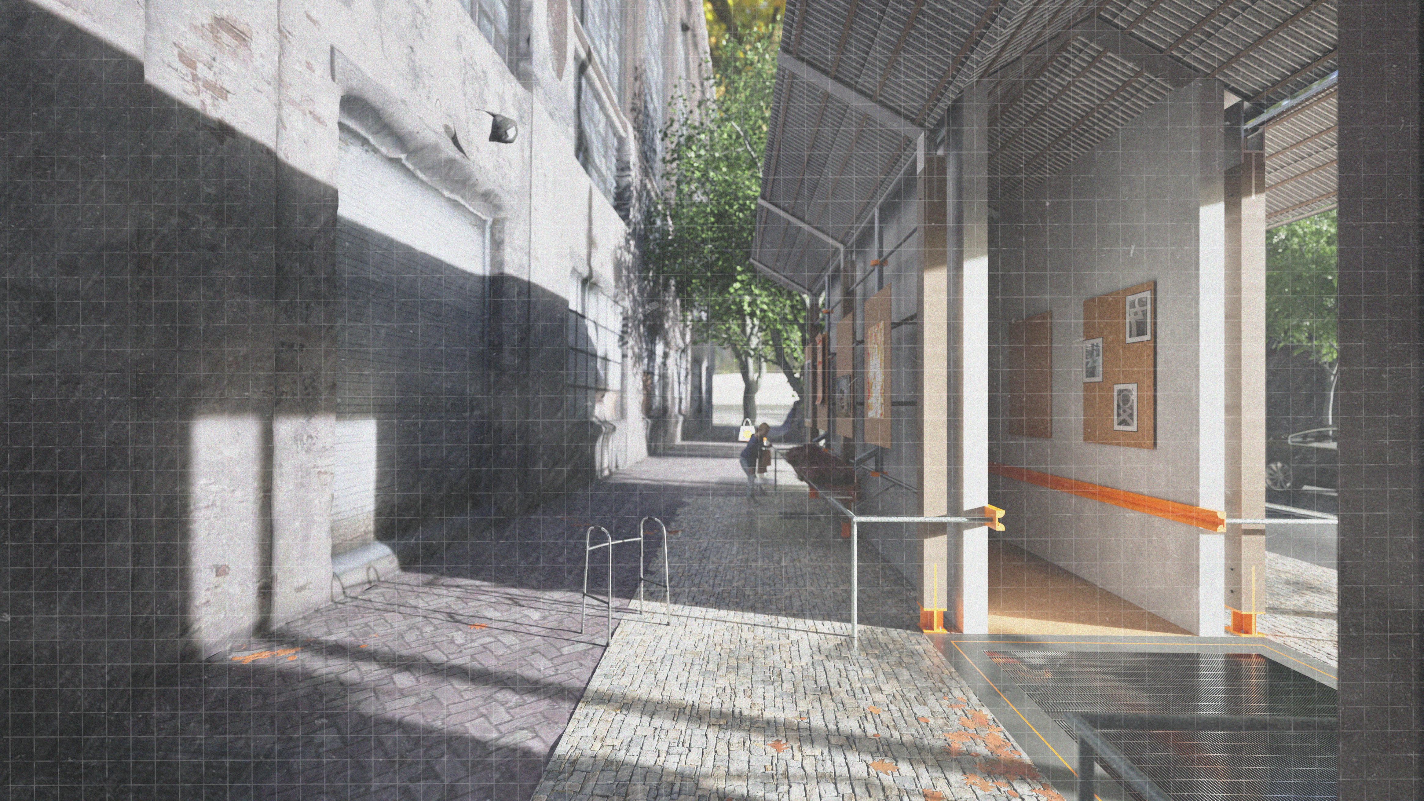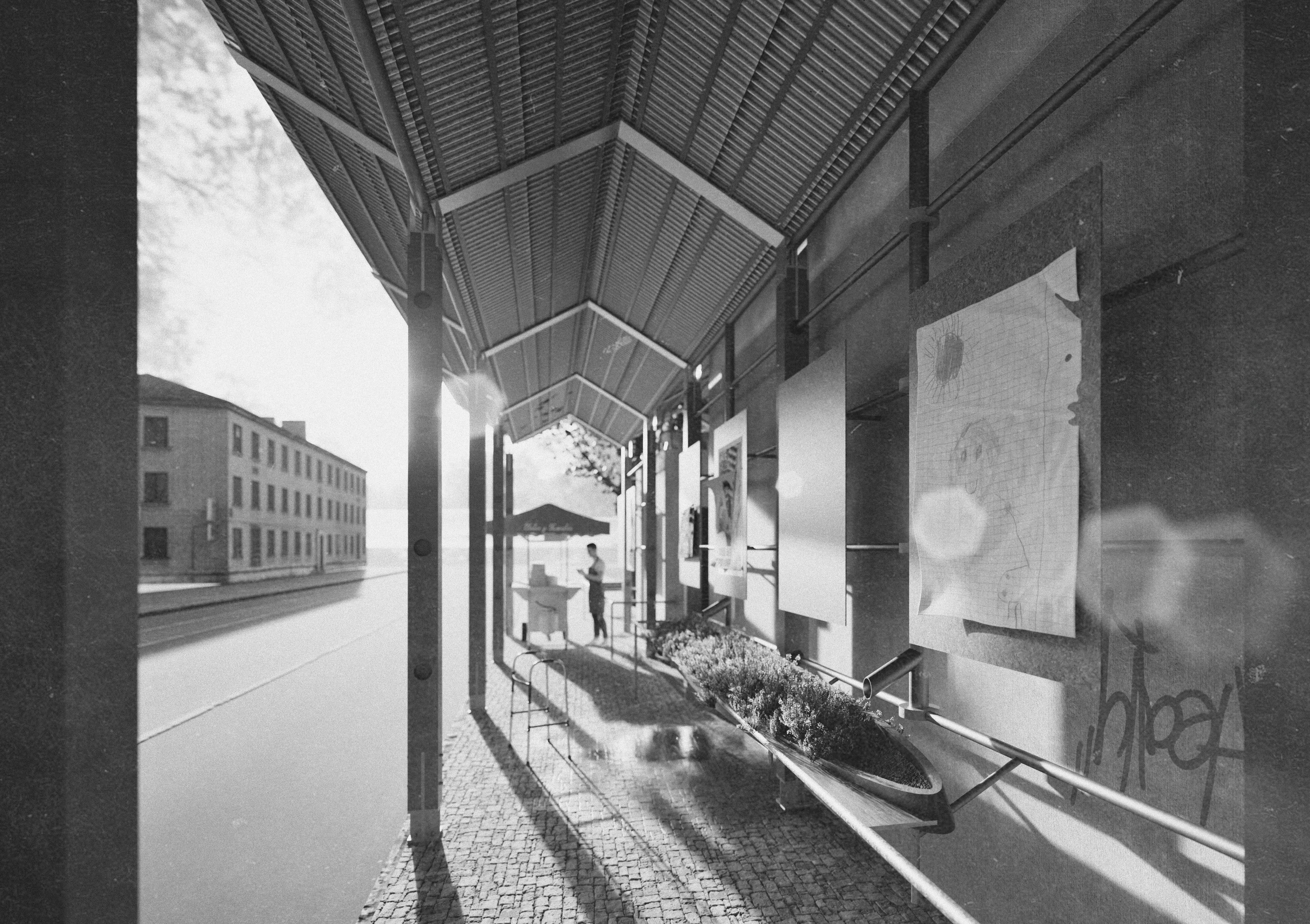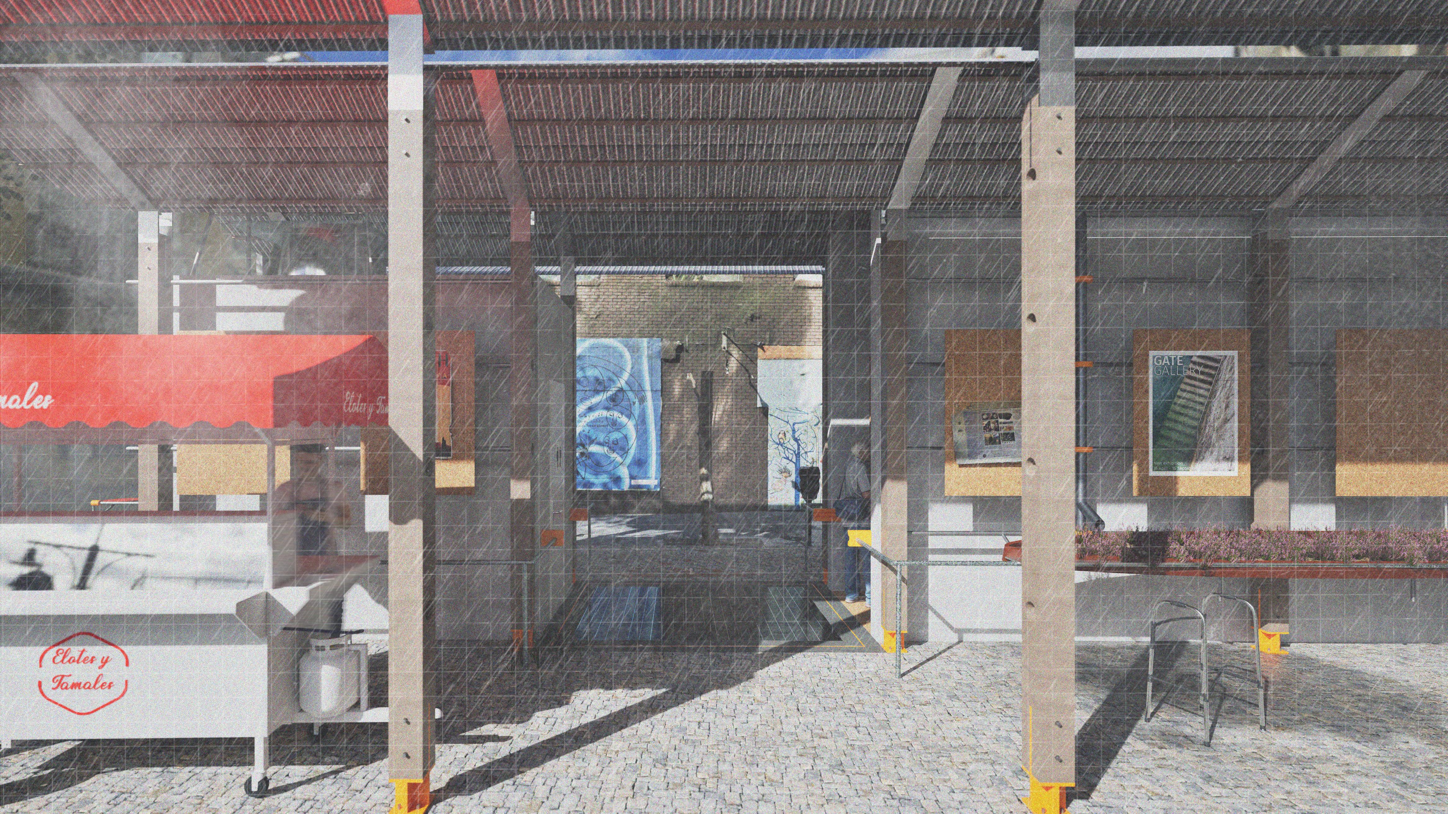The intervention occupies a main public street, often used for markets. It provides a covered shelter for kiosks and stalls, with the WC being accessible by anybody. It replaces the previous public noticeboard and provides greater flexibility and space to display public news.