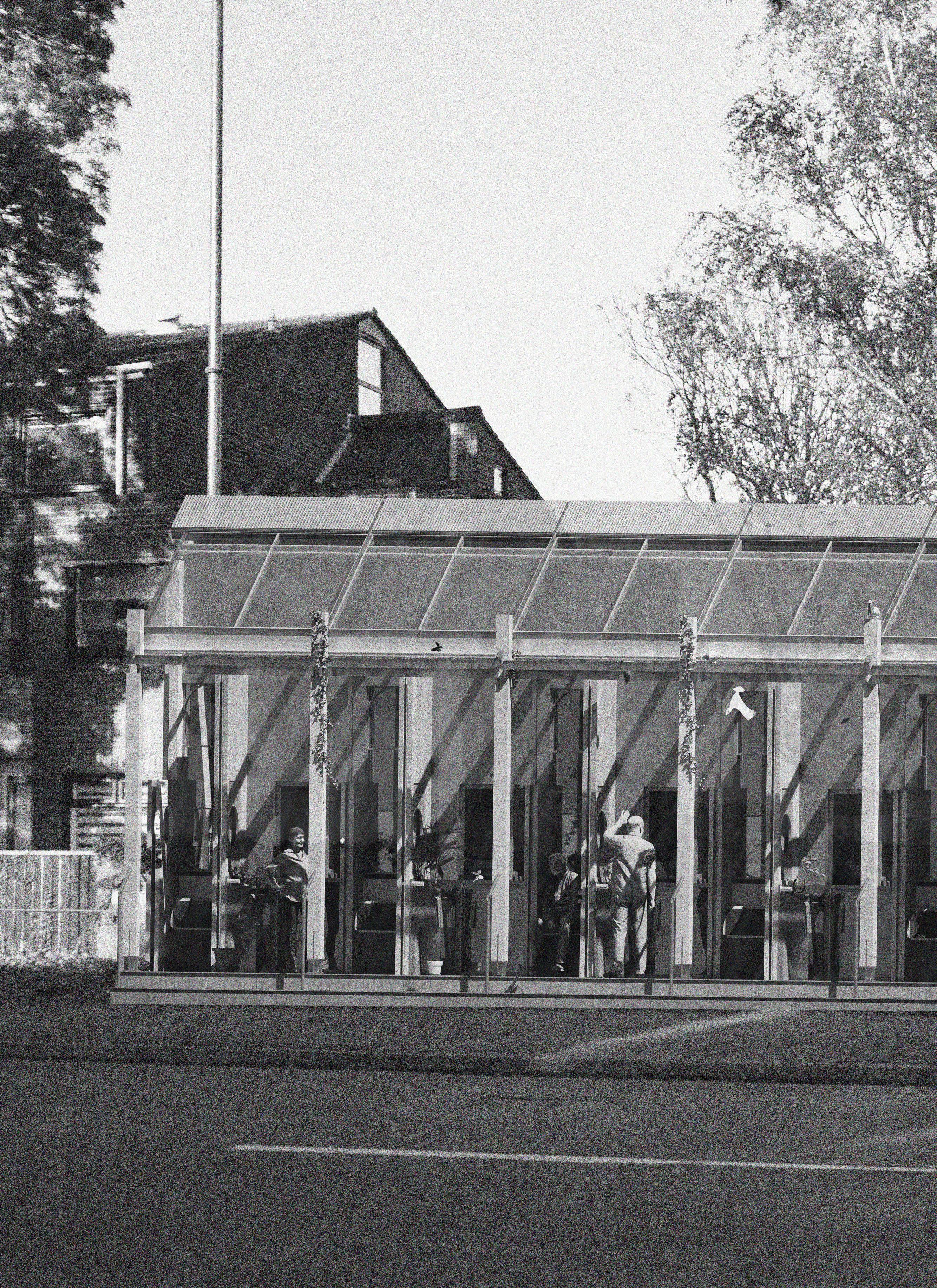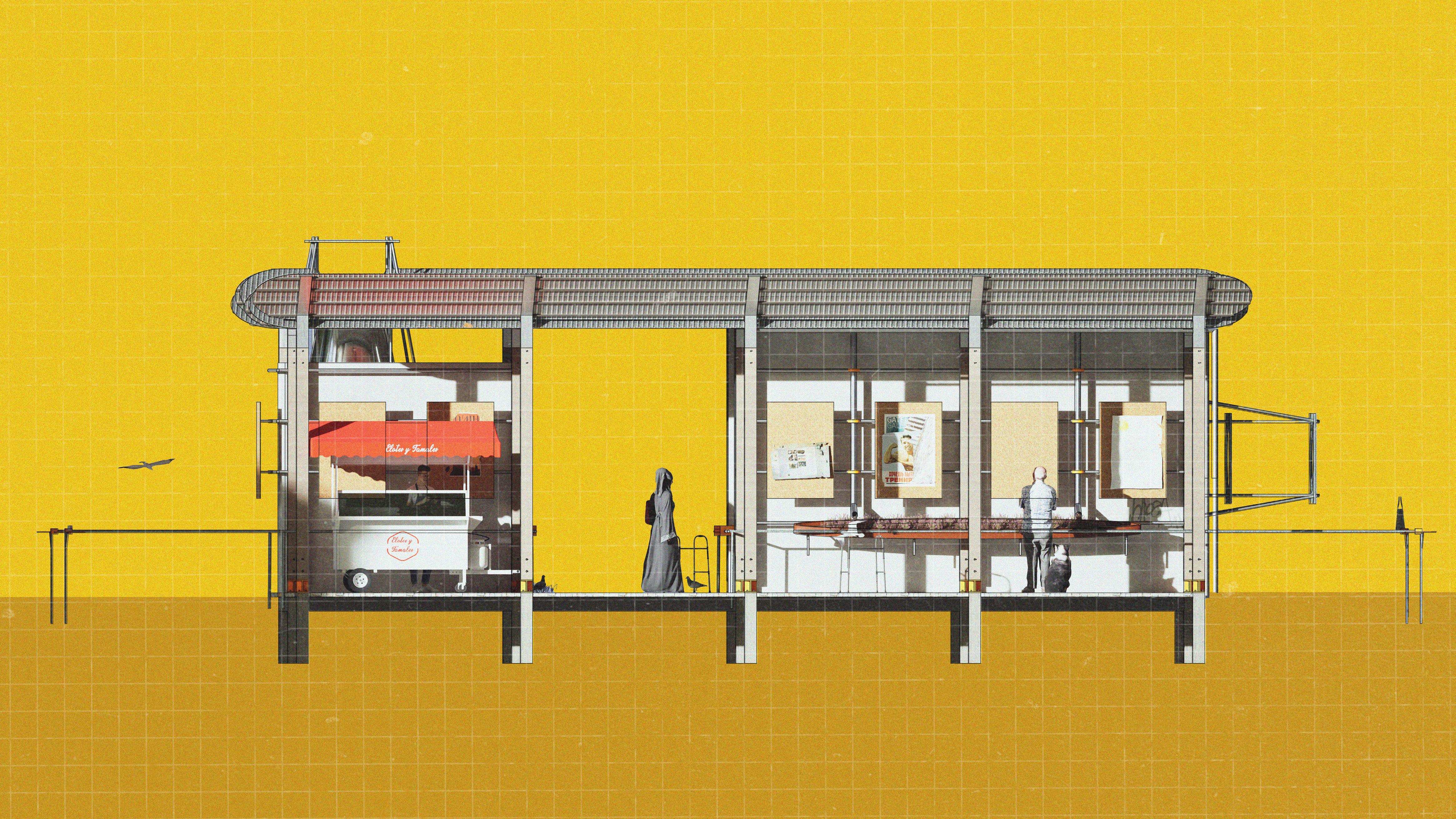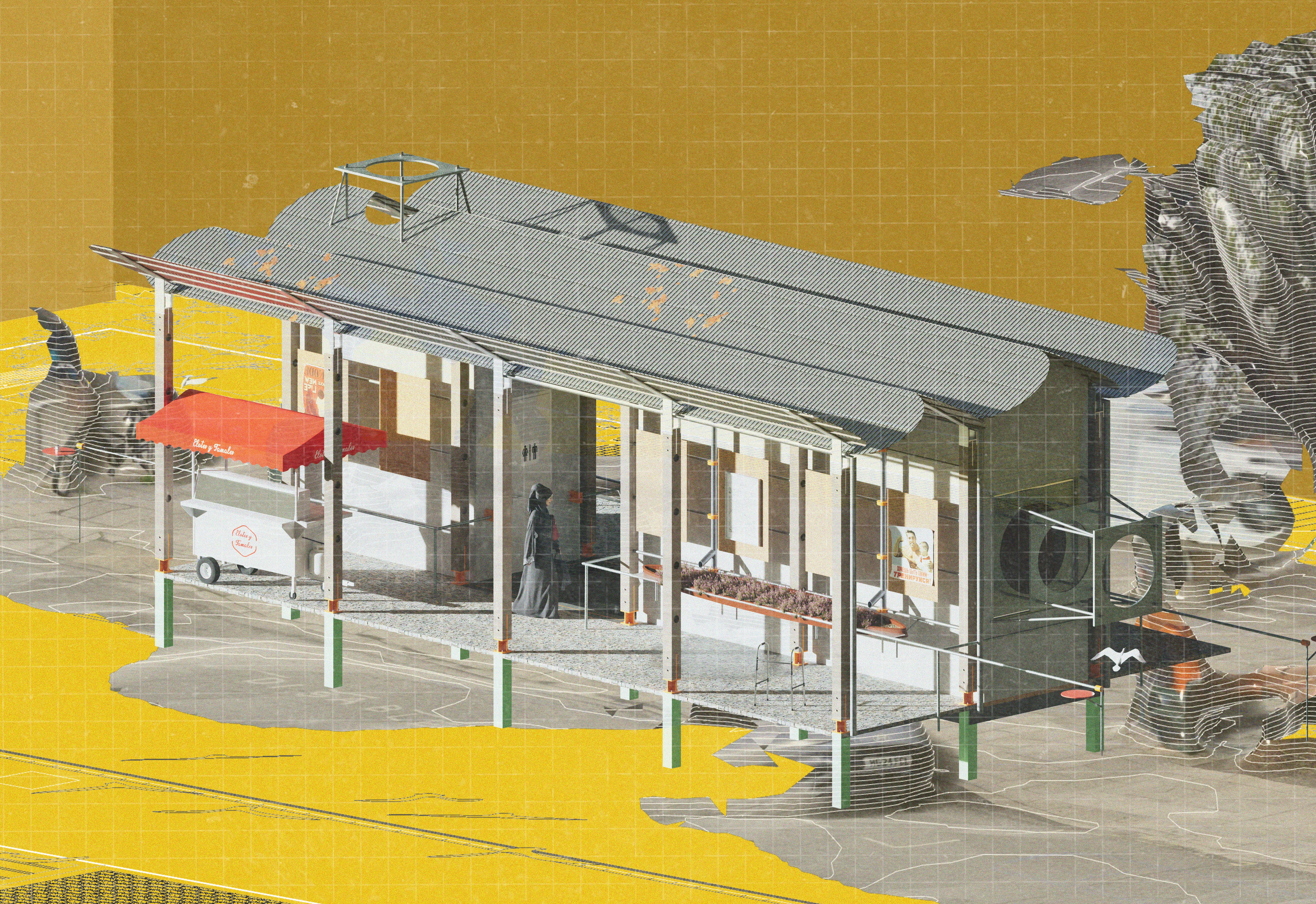 The intervention occupies a main public street, often used for markets. It provides a covered shelter for kiosks and stalls, with the WC being accessible by anybody. It replaces the previous public noticeboard and provides greater flexibility and space to display public news.