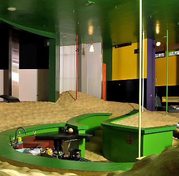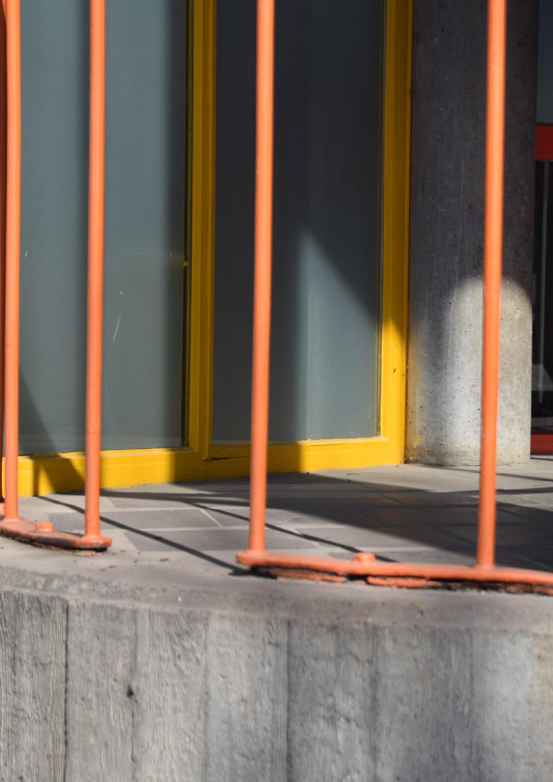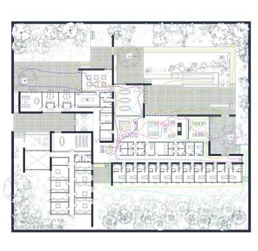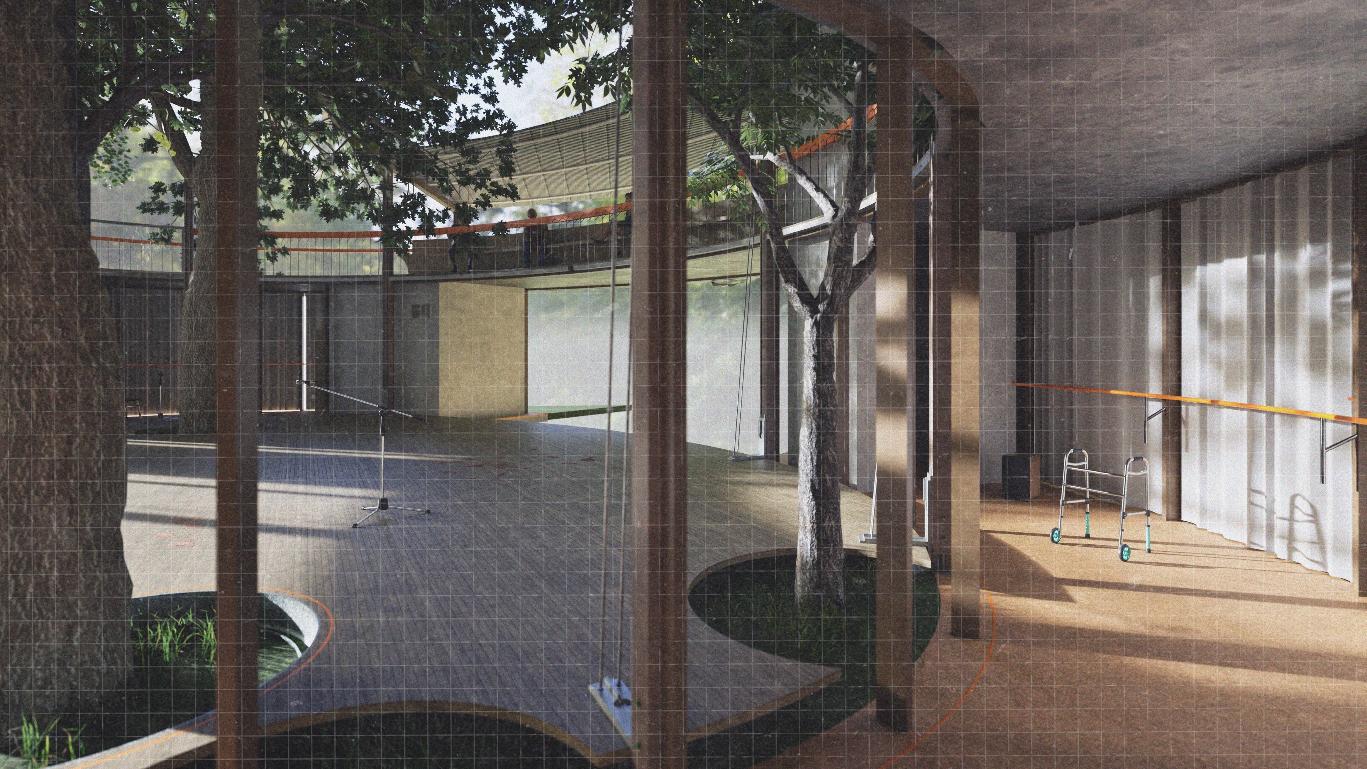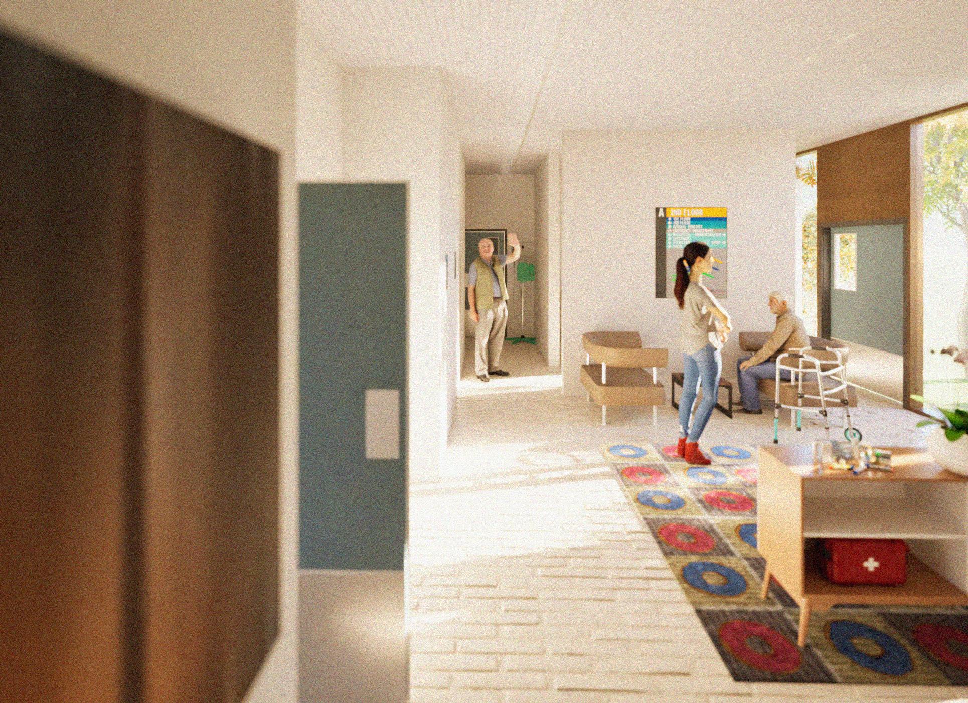 A material language of brightly coloured plastic accents provide a visual cue. Curtains that provide porosity and hint to a subtle medical language. Soft cork floor finish to allow for falls.