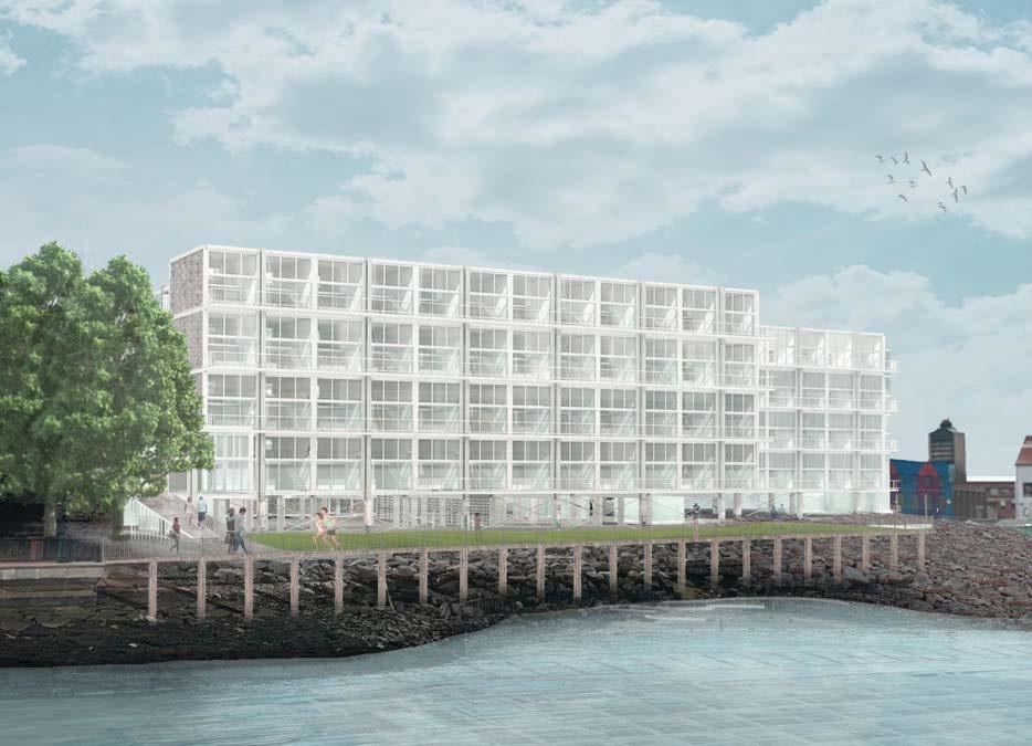 Focusing on the widespread issue of flexible affordable housing, this project attempts to provide a solution through modular steel construction, developed and proven on the coast in Boston, thereby generating an archetype to be deployed across the country. It is important to note is that while the project must be flexible in its capability and uses for the residents, it also must engage with the public, while still respecting the residents privacy. Through the different levels of the project, we aimed to create a filtering effect both through the quality of light and opacity as you ascend through the layers of housing and shared program. This layering allowed for us to generate an engaged ground plane, while also creating a sense of privacy for residents on the levels above. The grid system that formed the projects superstructure creates the ability to capture alternative income sources for the housing project by way of its retail pop up shops on the ground floor along Marginal Street, and a restaurant flanked by larger at market rate units on the first floor facing the water.