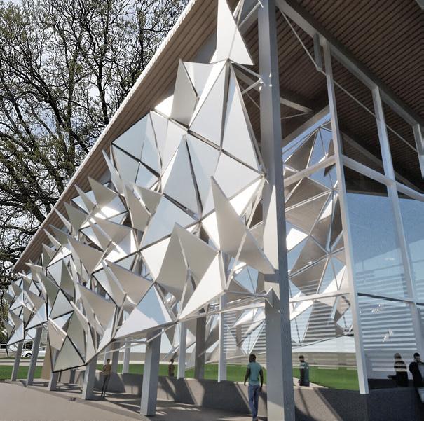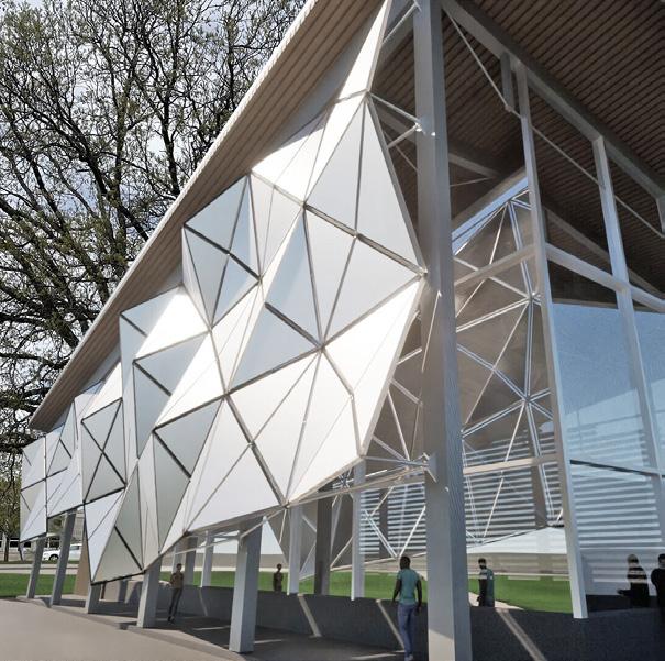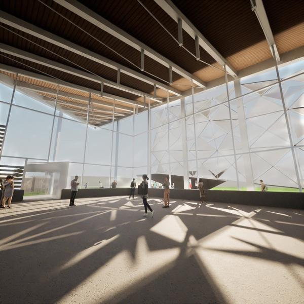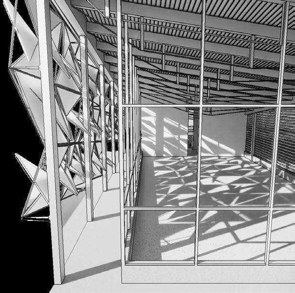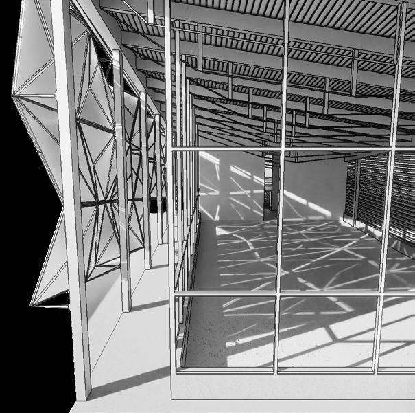 The largest building houses the multi-use and spritual space. The steel structure holding the roof utilizes tension members to reduce the load over the long span. The tension members move diagonally across the building following a datum that leads to the peak of the roof on the outside. A screen with rotating aluminum panels is located on the south facing wall which is entirely glass. This screen filters the light into the spiritual space and is able to be adjusted to let more or less light in adding to the spiritual feeling in the space.