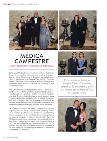 25 años de atención profesional y calidad humana. El Hospital Médica Campestre ofreció un Baile de Gala en honor de los médicos con motivo de su día y de la celebración de su 25 aniversario. El evento se realizó el pasado 21 de octubre en la Casa de Piedra. El Lic. Francisco Garnica Zamudio, director general de Médica Campestre, dio la bienvenida a los 220 médicos con sus esposas, que acudieron al lugar. El Ing. Norberto Roque Díaz de León durante su mensaje, recordó los inicios del Hospital hace 25 años: “Con 8 habitaciones, 2 quirófanos y un equipo portátil de rayos X”. Nació con una idea: Crear un hospital donde se pueda operar a gusto y felices… y esa sigue siendo la razón de Médica Campestre. Refrendó la misión: “Ser una empresa comprometida en ofrecer al cuerpo médico las condiciones óptimas para su ejercicio profesional y la mejor atención de los pacientes”. “A 25 años de su creación, Médica Campestre es un gran orgullo para León por su productividad, calidad y calidez en la atención que brinda a los pacientes”, expresó el Ing. Roque. Agradeció a los médicos, enfermeras, personal de apoyo y proveedores que han contribuido a hacer de Médica Campestre una historia de éxito, especialmente a Don Andrés Medina, por su apoyo en la construcción de la Torre MC y el nuevo hospital. También agradeció a las esposas y familias: “Que muchas veces tuvieron que esperar un viaje o renovar el coche porque cada mes la aportación del hospital era primero”.