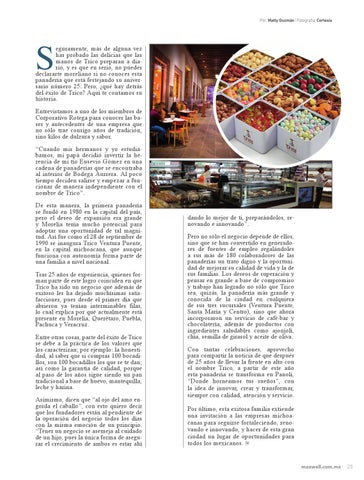 eguramente, más de alguna vez has probado las delicias que las manos de Trico preparan a diario, y es que en serio, no puedes declararte moreliano si no conoces esta panadería que está festejando su aniversario número 25. Pero, ¿qué hay detrás del éxito de Trico? Aquí te contamos su historia. Entrevistamos a uno de los miembros de Corporativo Rotega para conocer las bases y antecedentes de una empresa que no sólo trae consigo años de tradición, sino kilos de dulzura y sabor. “Cuando mis hermanos y yo estudiábamos, mi papá decidió invertir la herencia de mi tío Eusevio Gómez en una cadena de panaderías que se encontraba al interior de Bodega Aurrera. Al poco tiempo deciden salirse y empezar a funcionar de manera independiente con el nombre de Trico”. De esta manera, la primera panadería se fundó en 1980 en la capital del país, pero el deseo de expansión era grande y Morelia tenía mucho potencial para adoptar una oportunidad de tal magnitud. Así fue como el 28 de septiembre de 1990 se inaugura Trico Ventura Puente, en la capital michoacana, que aunque funciona con autonomía forma parte de una familia a nivel nacional. Tras 25 años de experiencia, quienes forman parte de este logro coinciden en que Trico ha sido un negocio que además de exitoso les ha dejado muchísimas satisfacciones, pues desde el primer día que abrieron ya tenían interminables filas, lo cual explica por qué actualmente está presente en Morelia, Querétaro, Puebla, Pachuca y Veracruz. Entre otras cosas, parte del éxito de Trico se debe a la práctica de los valores que los caracterizan; por ejemplo: la honestidad, al saber que si compras 100 bocadillos, son 100 bocadillos los que se te dan; así como la garantía de calidad, porque al paso de los años sigue siendo un pan tradicional a base de huevo, mantequilla, leche y harina. Asimismo, dicen que “al ojo del amo engorda el caballo”, con esto quiero decir que los fundadores están al pendiente de la operación del negocio todos los días con la misma emoción de un principio. “Tener un negocio se asemeja al cuidado de un hijo, pues la única forma de asegurar el crecimiento de ambos es estar ahí