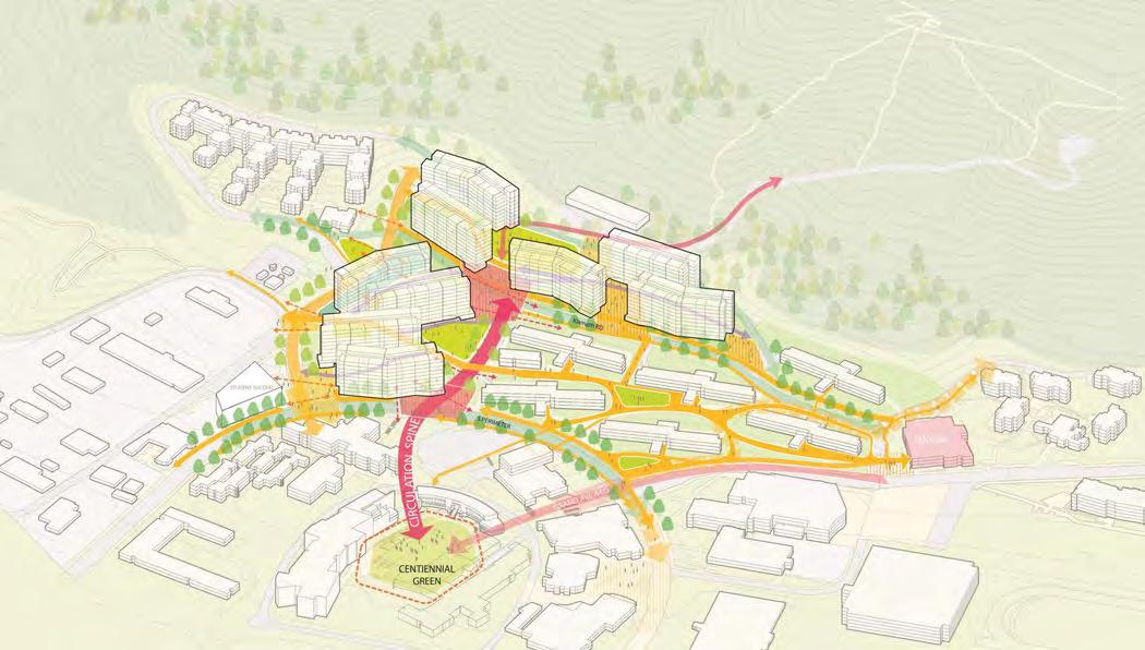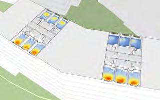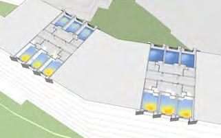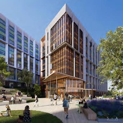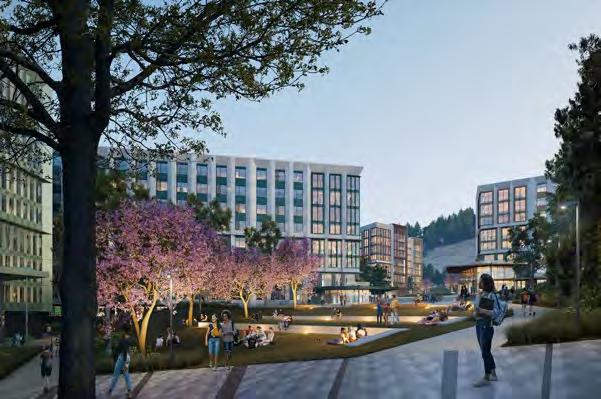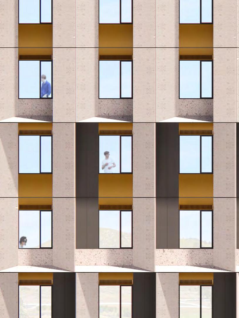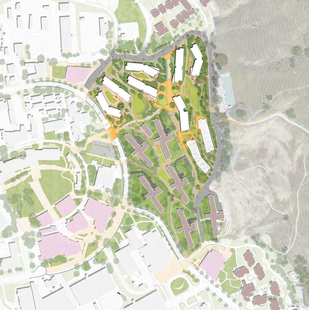 The site plan (left) encompasses nine buildings, strategically positioned throughout the site, with each between eight to nine stories in height. Careful consideration has been given to optimize outdoor space, addressing circulation, and harmonizing with the topography and surrounding landscape. In total, the Student Housing Program includes about 4,100 beds, catering to the campus community’s diverse needs.