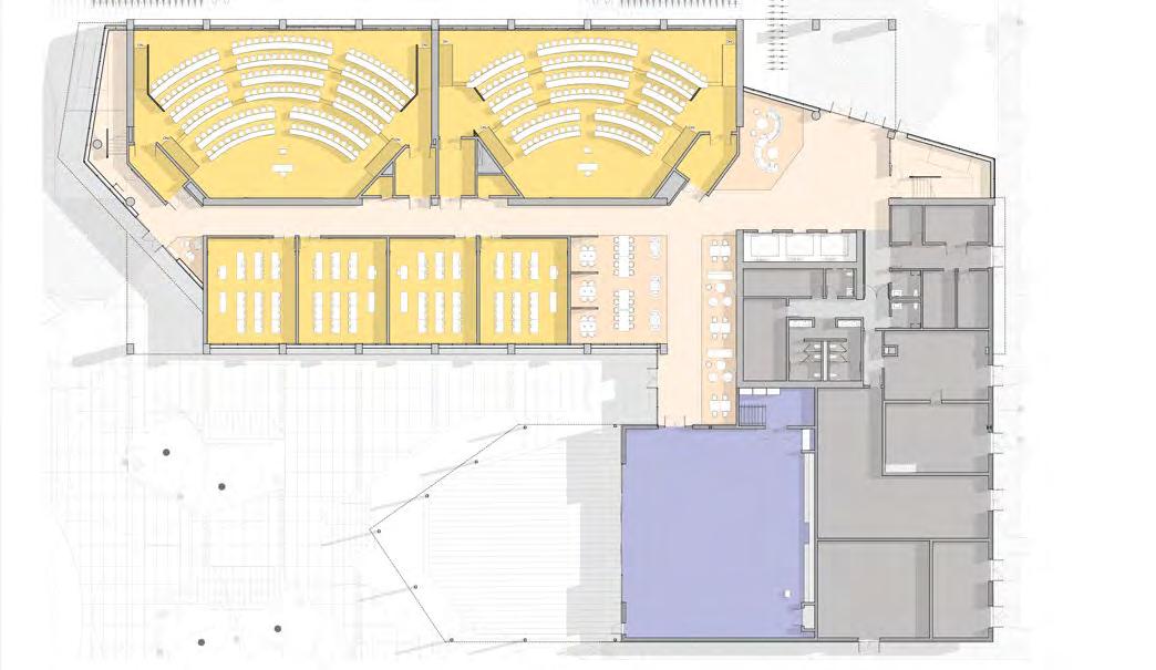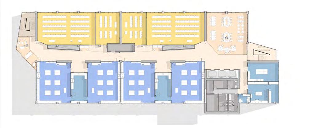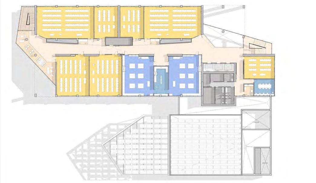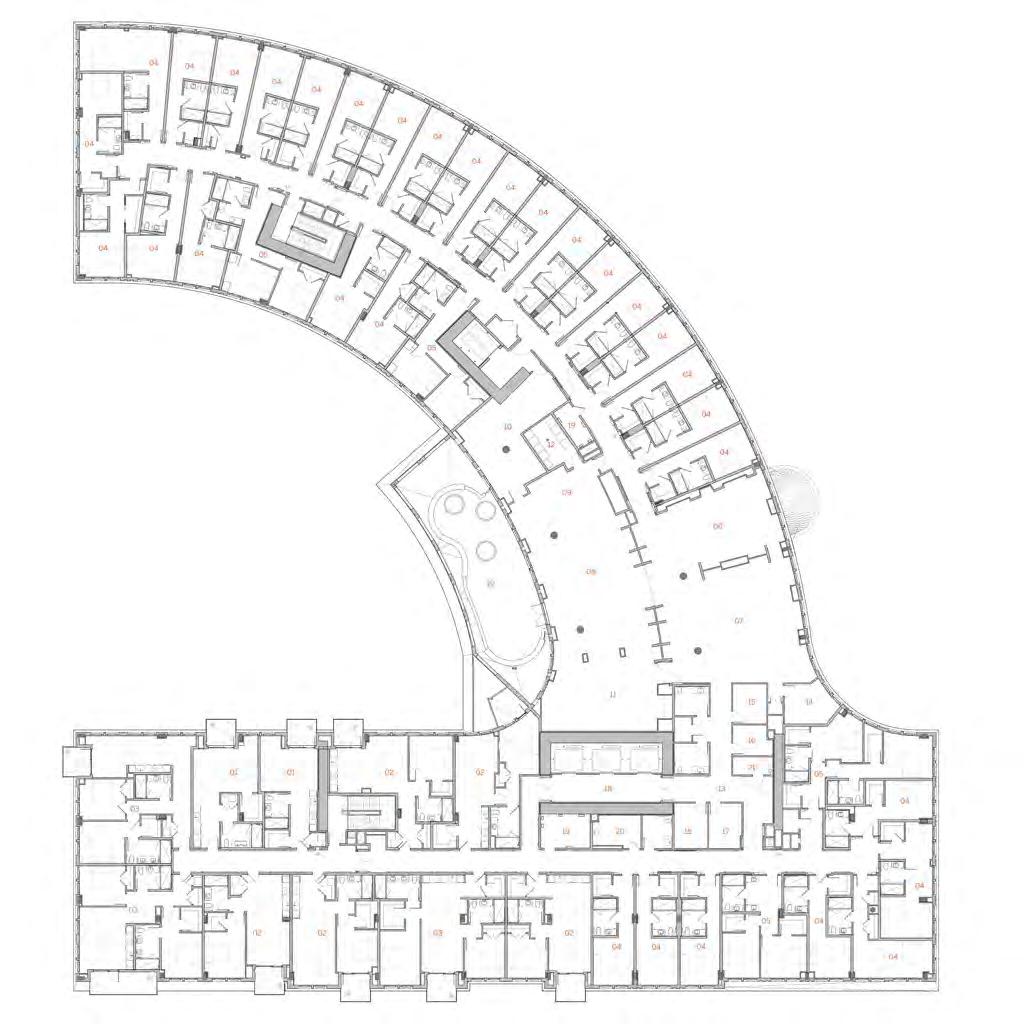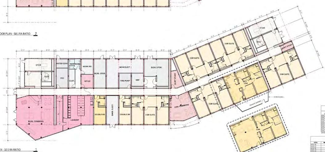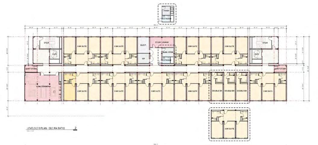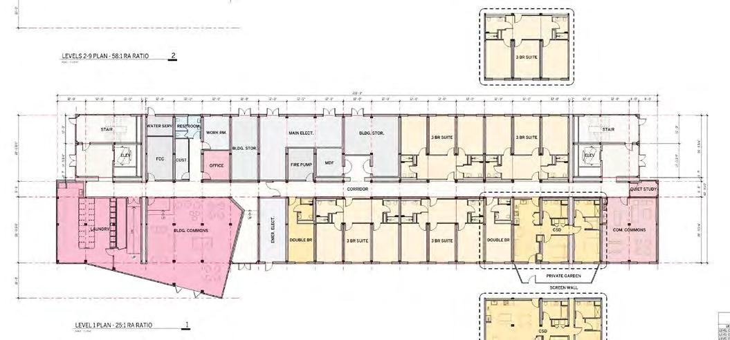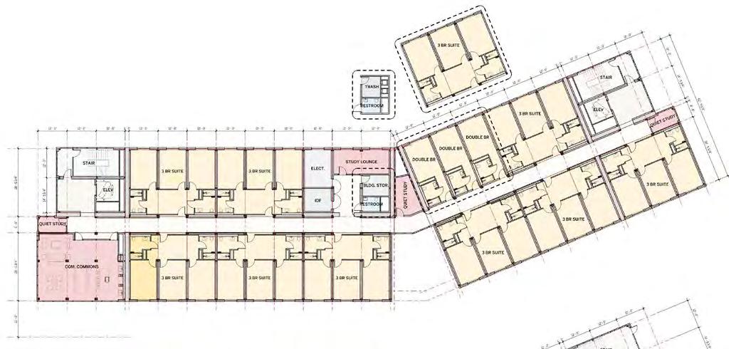 To achieve the desired number of beds per the CPSHP, the beds are grouped into 3-bedroom suites that are distributed on the typical floors from levels 2 and above. Each floor consists of a “community” with a maximum 60:1 student to RA ratio with commons and study spaces located on each typical floor. Building amenities are located on the ground level allowing for more flexibility of the architectural expression. This creates an interdisciplinary building plan where students can establish their own communities on their respective floors.