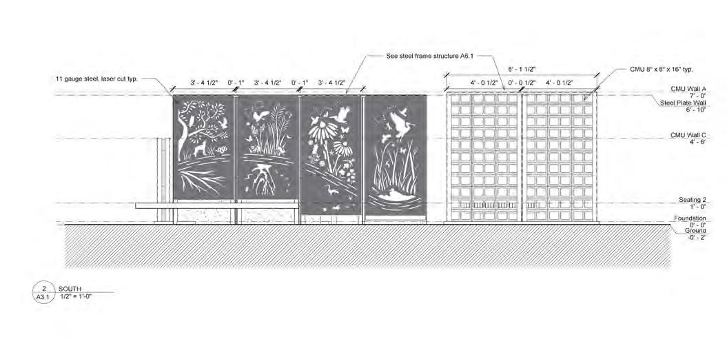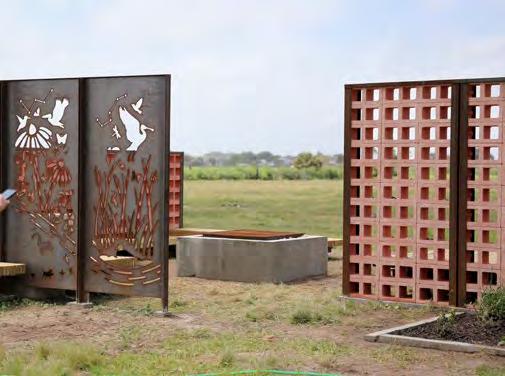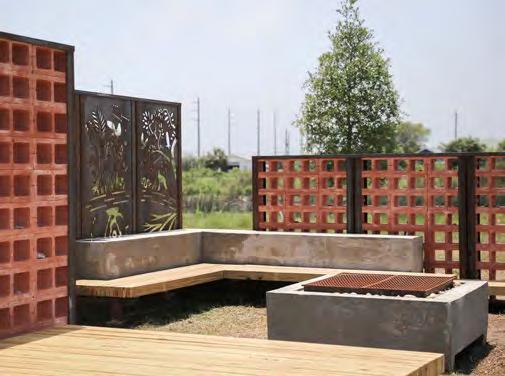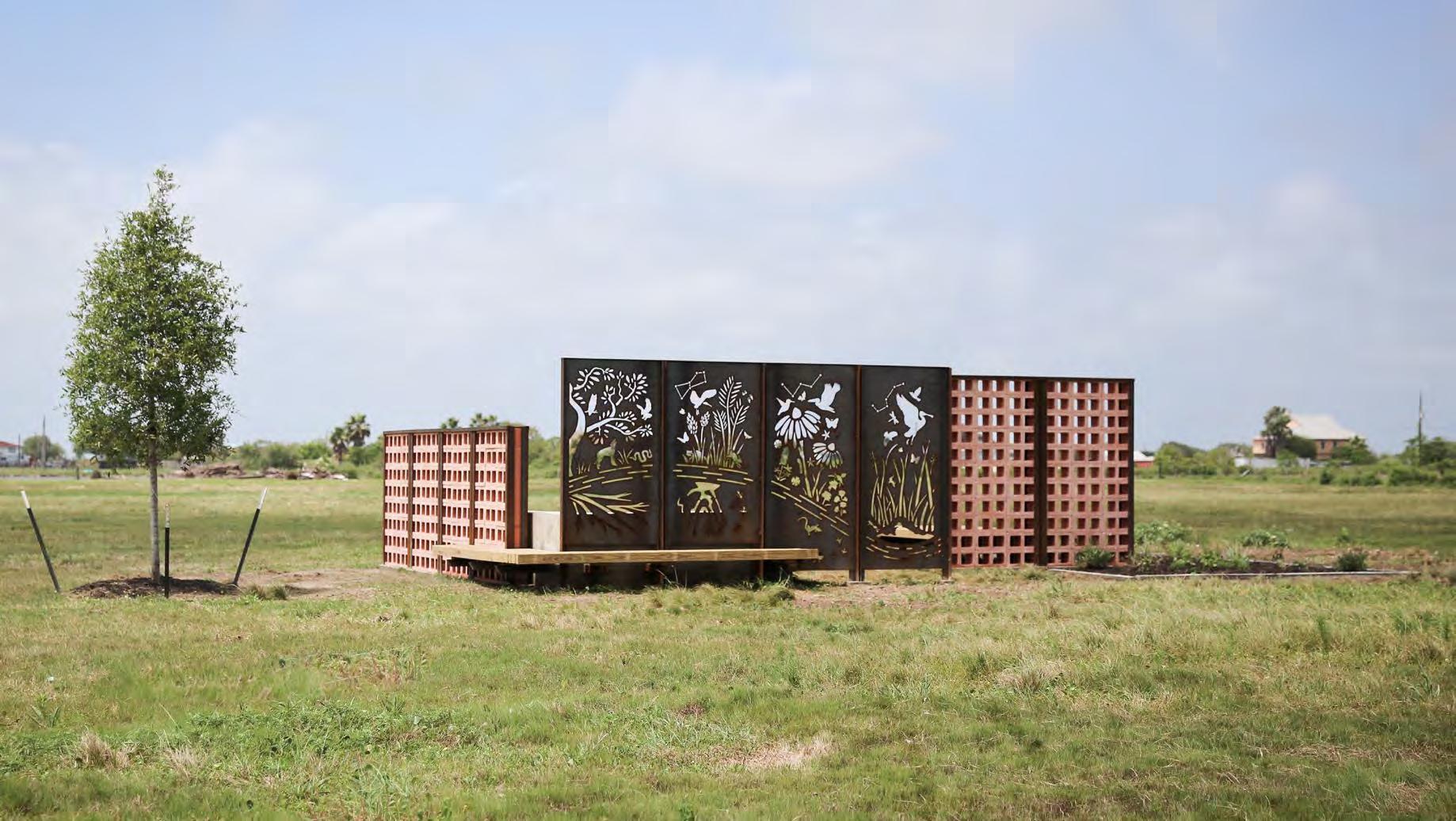 A plasma cut steel art wall (left) featuring specific flora and fauna of Galveston provides a visual aid to the girls and promotes ecological literacy.