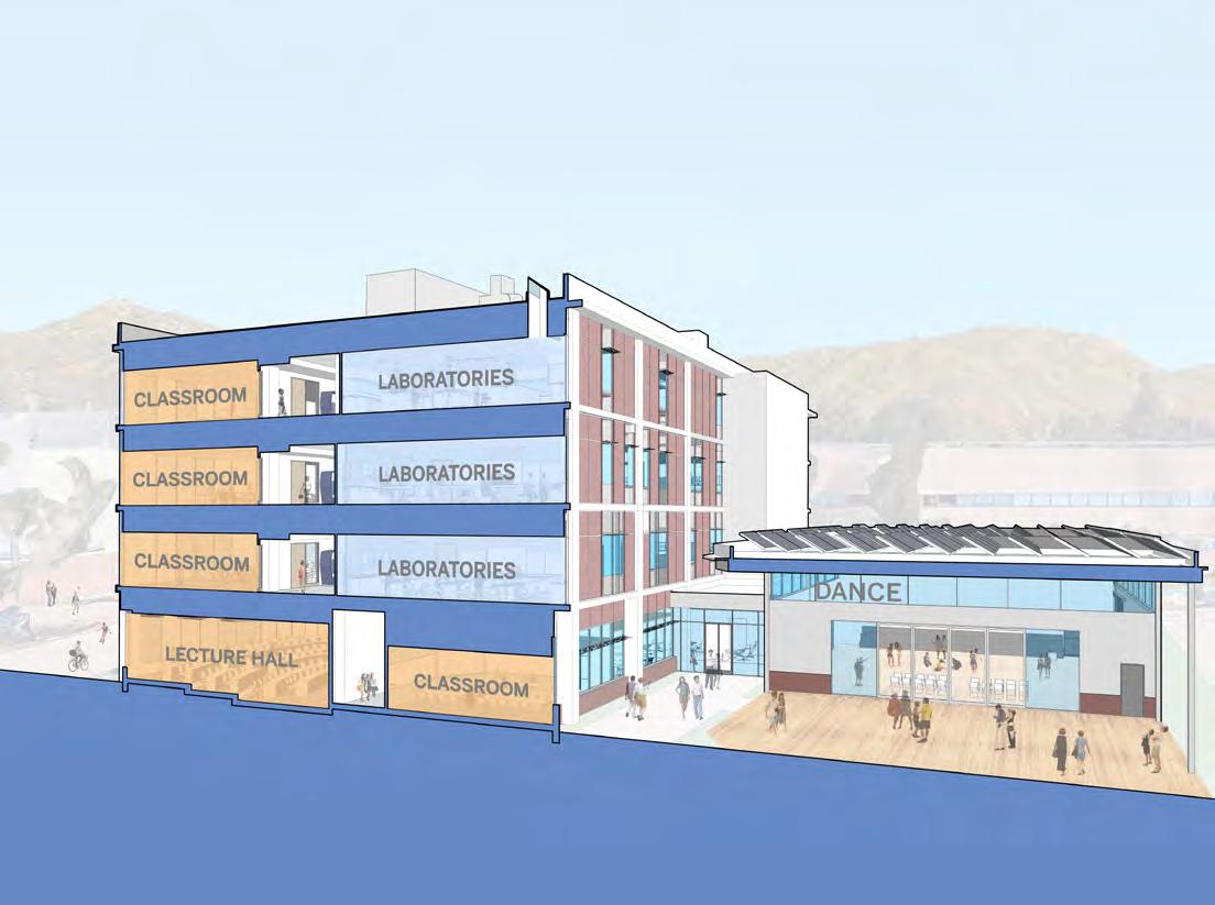 Our design concept distributes laboratory, classroom, and dance space across the building to create an interdisciplinary culture that actively exposes students to other schools of thought. Our strategy was inspired by Associate Provost and Chief of Staff Ken Baerenklau’s ambition that the building encourage “science students to take a dance class, and dance students to take a science class.”