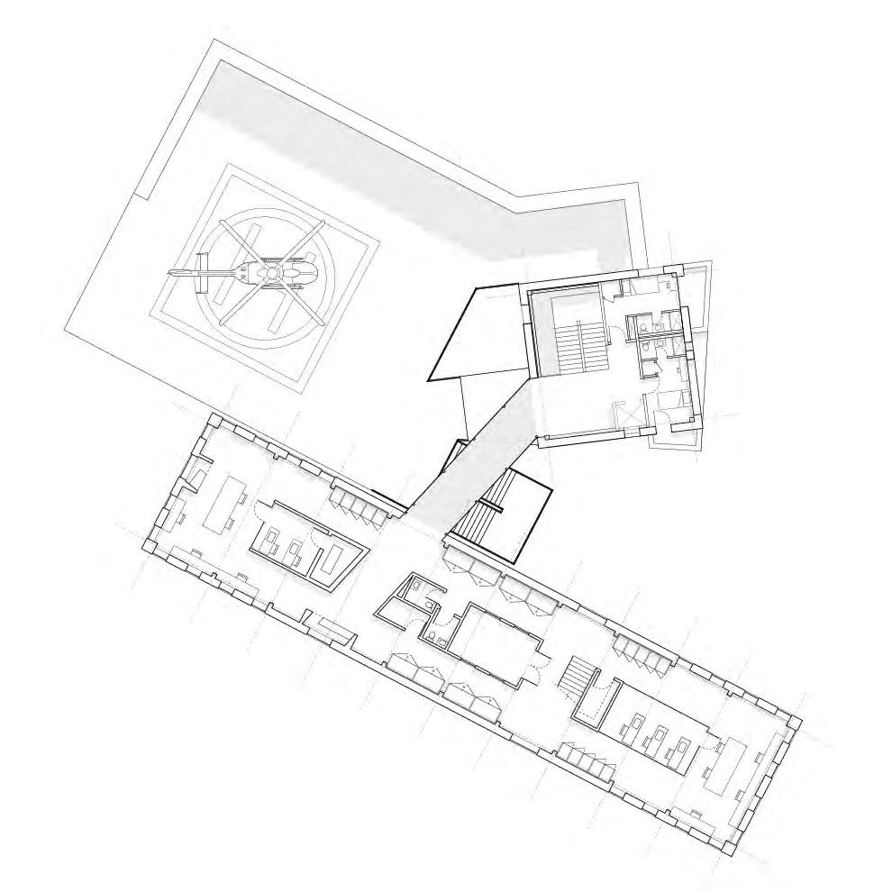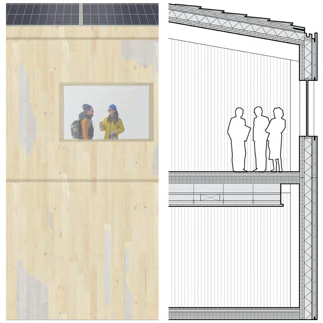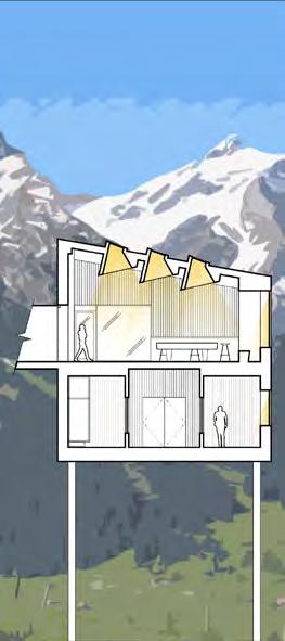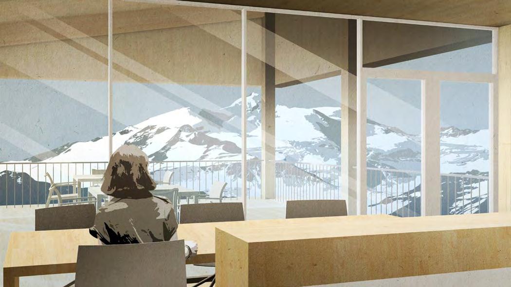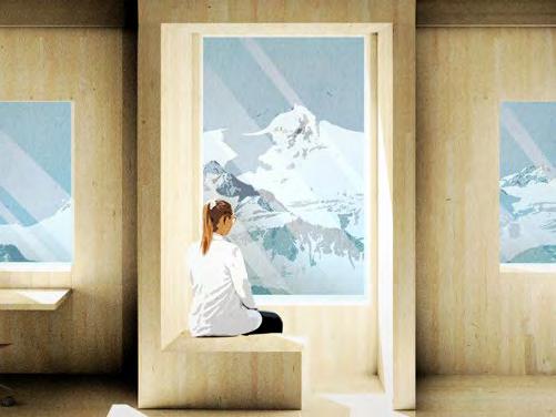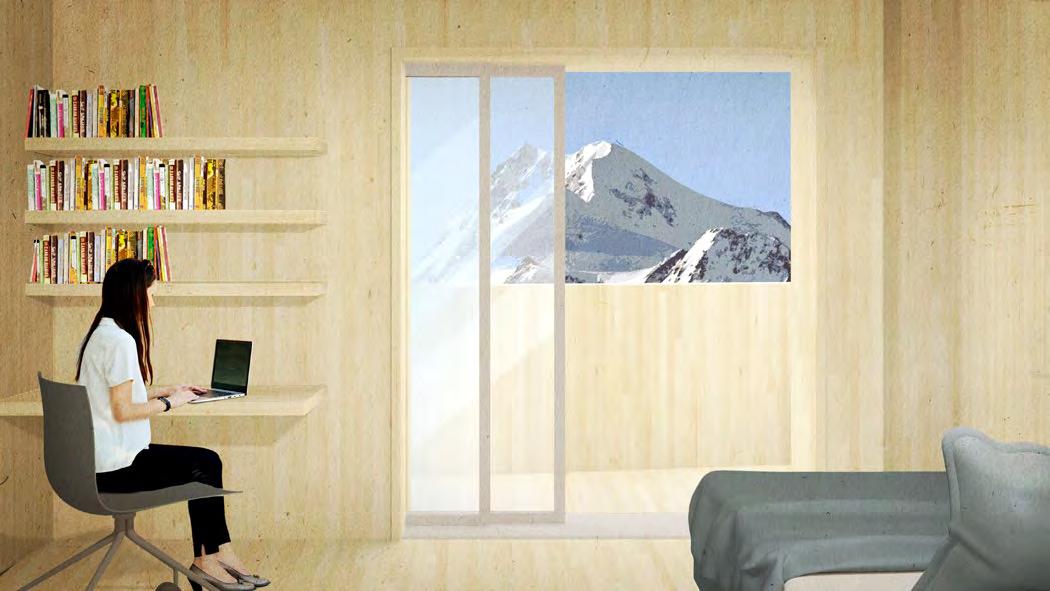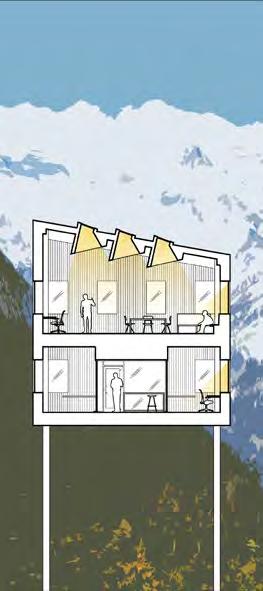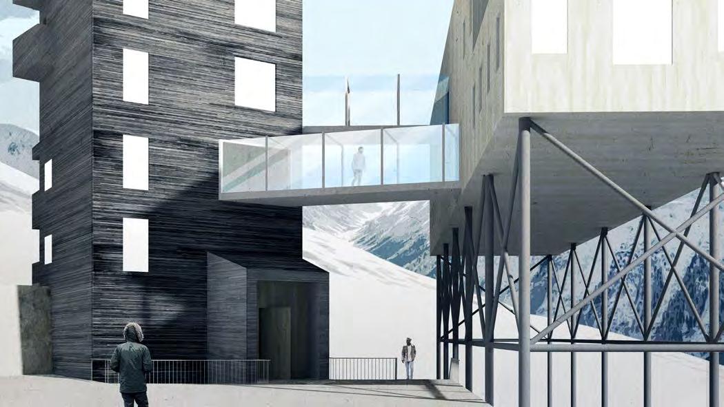 Untreated larch wood on the “horizontal bar” fades into gray as it reacts to the harsh climactic conditions, allowing the building to blend into the landscape over time. Locally sourced stone is used to clad the facade of the tower, establishing a visual dialogue with the surrounding rocky terrain. Both material selections reinforce the building’s relationship with the site. Glass bridges serve as transportation spaces, linking the “bar” and the “tower.” These brief moments of de-materialization immerse the occupant in their environment, re-emphasizing the significance of the site.