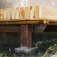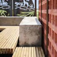 A concrete bench (right) anchors the structure and provides opportunities for seating and interaction. Steel supports protrude from the concrete to create a floating effect for each bench.