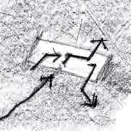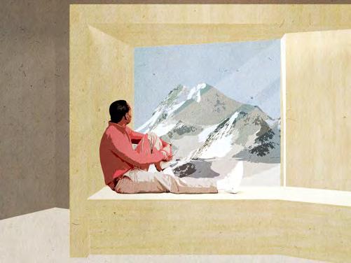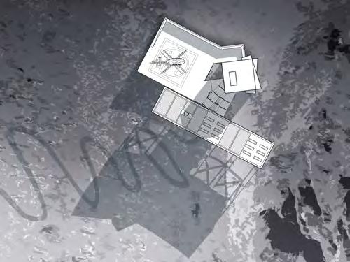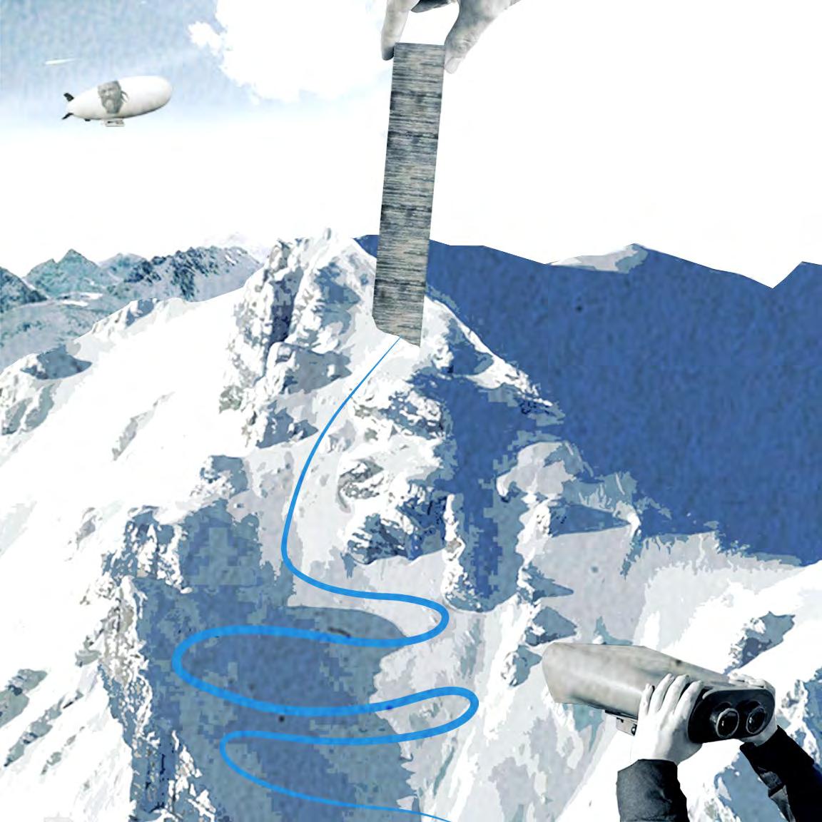 An atmospheric study (left) abstractly expressing ideas of site, circulation, and views on our given site in the Otzal Alps. Intentionally placing our building in response to aspects of the site, our building aims to be a termination of a procession as a reference to the journey of Otzi as it frames views to landmarks on the site and of the natural landscape.