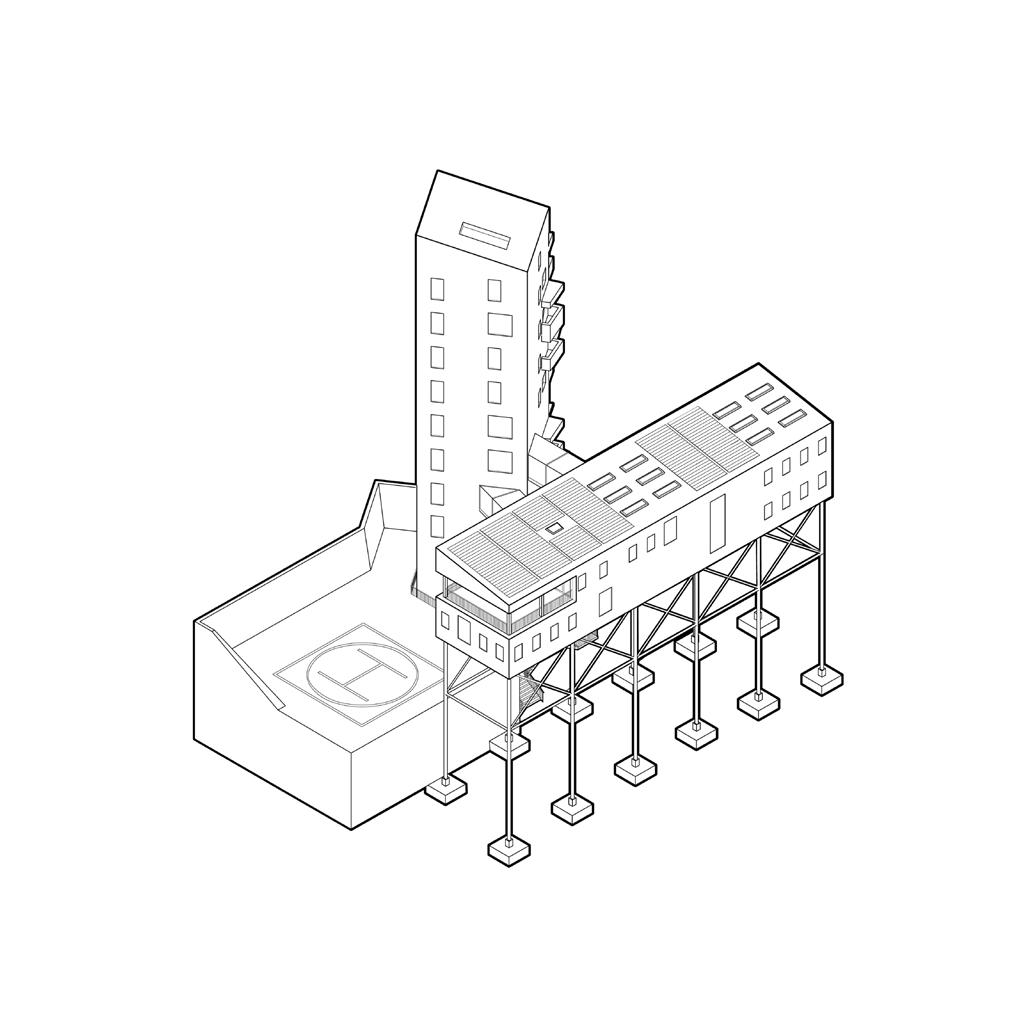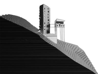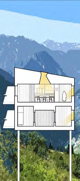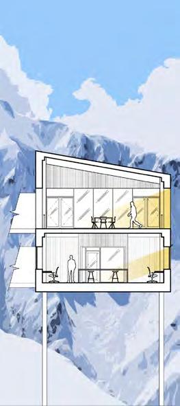 Designed to house the researchers using the facility, personal rooms were placed in a “vertical tower” rising from the landscape. All social and research based program were placed within a “horizontal bar” that is elevated off the ground. The path to the building runs below the bar and marks the beginning of the building’s circulation, acting as an extension of the trail. This leads occupants to a threshold condition at the base of the tower marking the transition from the perilous mountainside into the refuge of the tower.