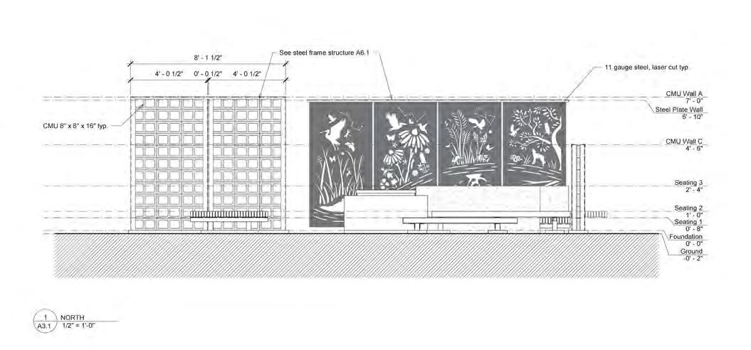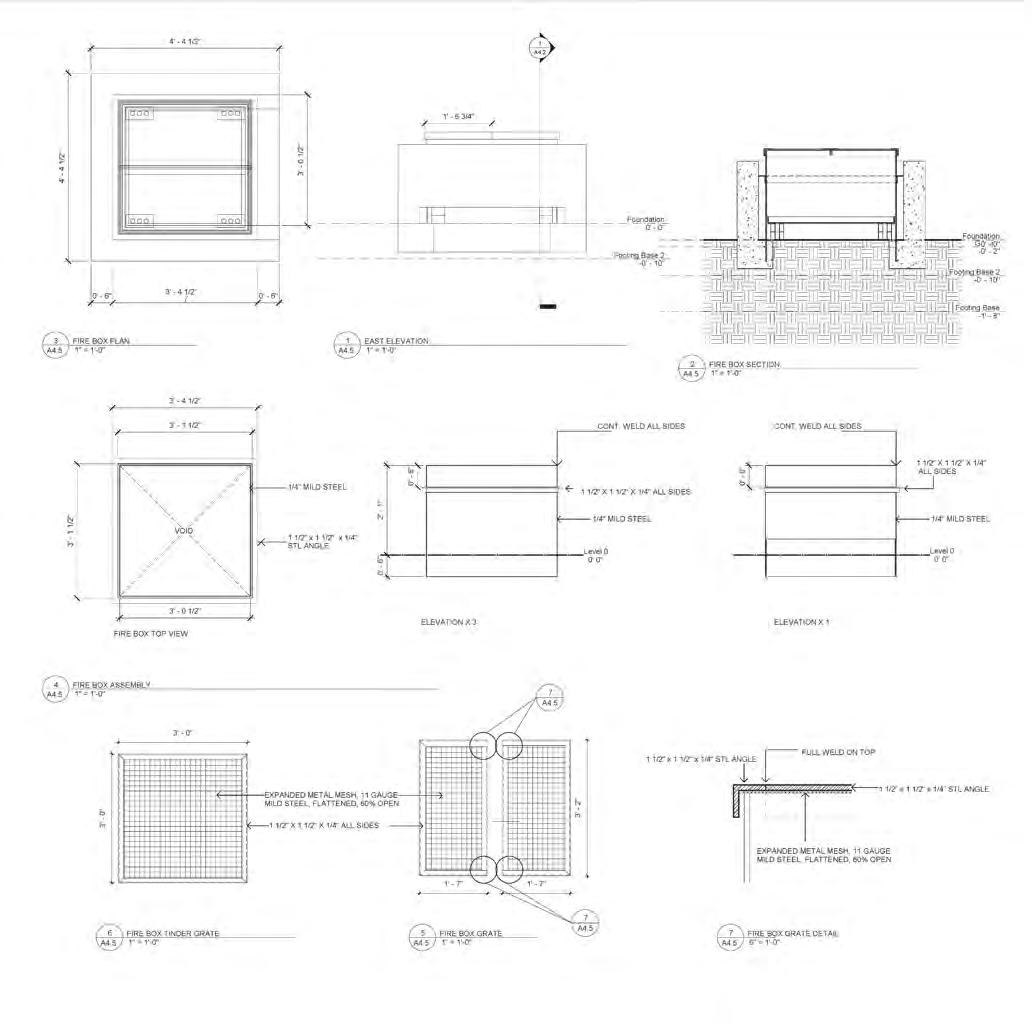 Colored CMU screen walls on the South and West provide additional shade and enclosure. The seating has variable heights, adapting to the age range from Daisies to Ambassadors. The seating also varies in distance from the fire box and allows moments to look inward to users, outward to the site, or up to the stars.