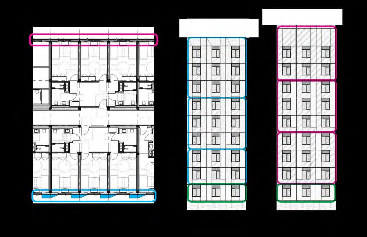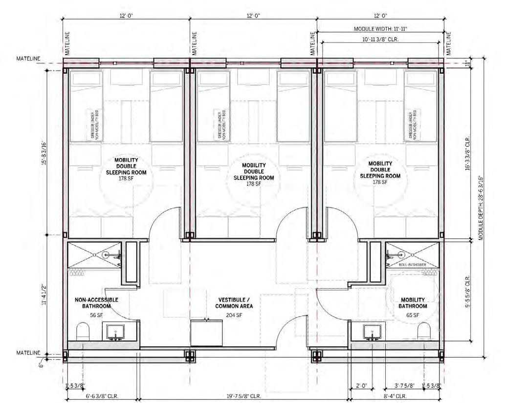 The design of the 3-bedroom suites (left) takes into account the minimum space needed for students to live comfortably and the maximum dimensions that the modular fabrication cannot exceed per the project budget. The combination of a “dry” mod and two “wet” mods creates this 3-bedroom suite configuration allowing for ease of off-site fabrication in the factory and transportation to the site.