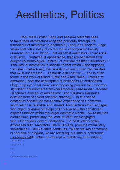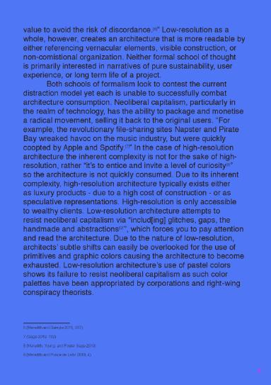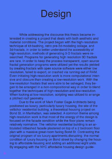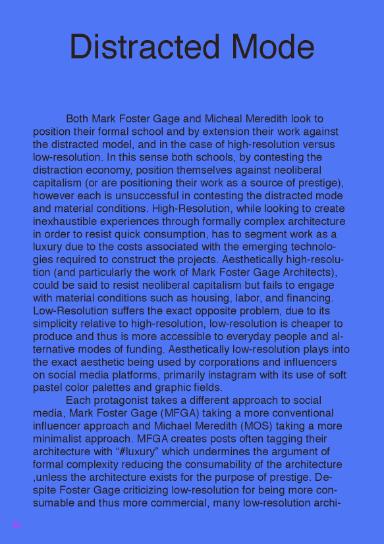High-Low-Resolution seeks to dissect an aesthetic discourse which was happening over the course of my undergraduate education. This discourse primarily included Michael Meredith and Mark Foster Gage seeking answers to the field of architecture’s atomization, and architecture’s inherent inability to cope with social media. While there was a flurry of articles, lectures, and exhibitions, the aesthetic debate failed to produce any field of unification among the aesthetics or produce a successful response to the core issue of architecture in a world dominated by social media. After these stylistic terms had run their course within American East-Coast architecture, the debate simply faded away. The thesis comprises an academic paper, a design response, and a book.