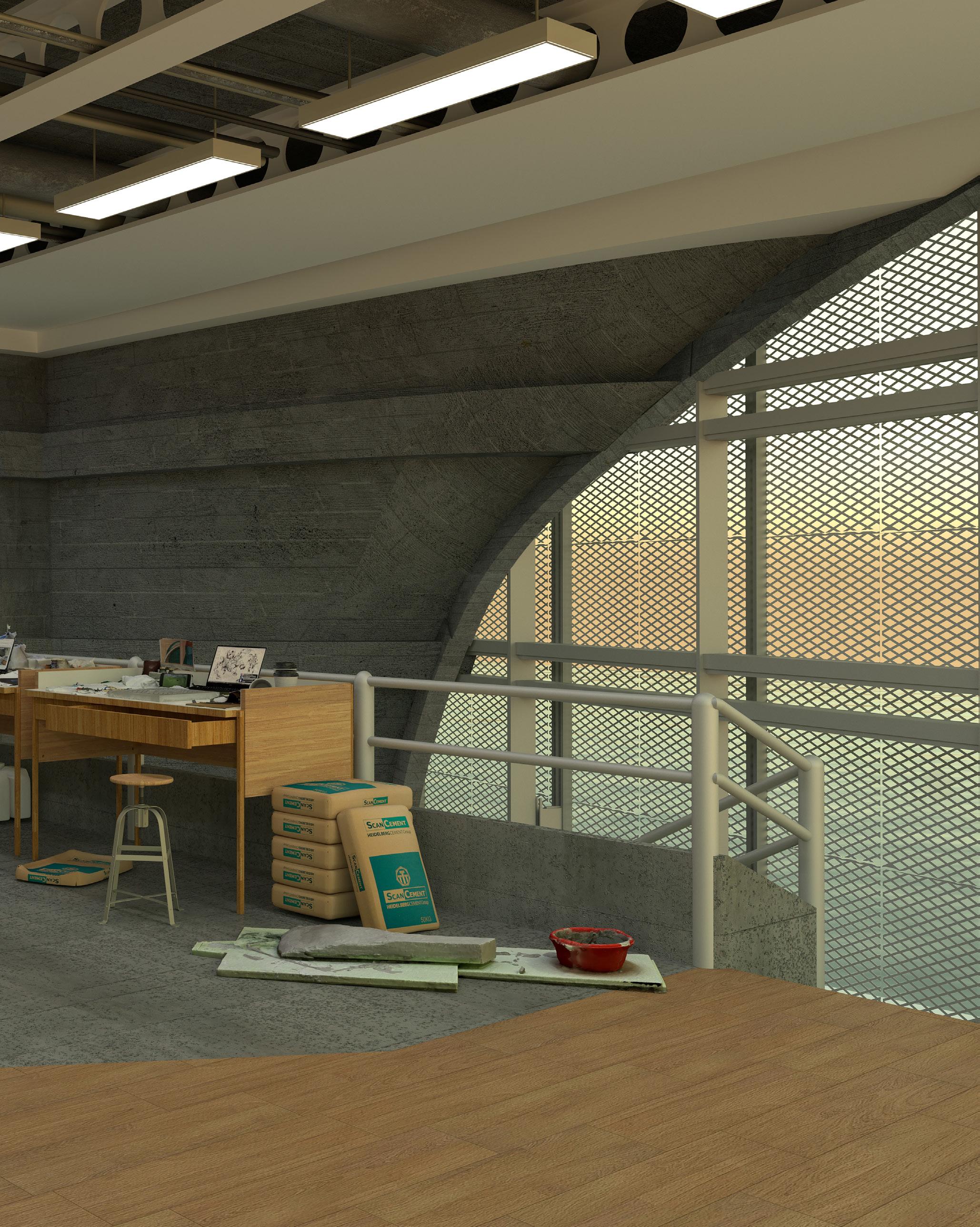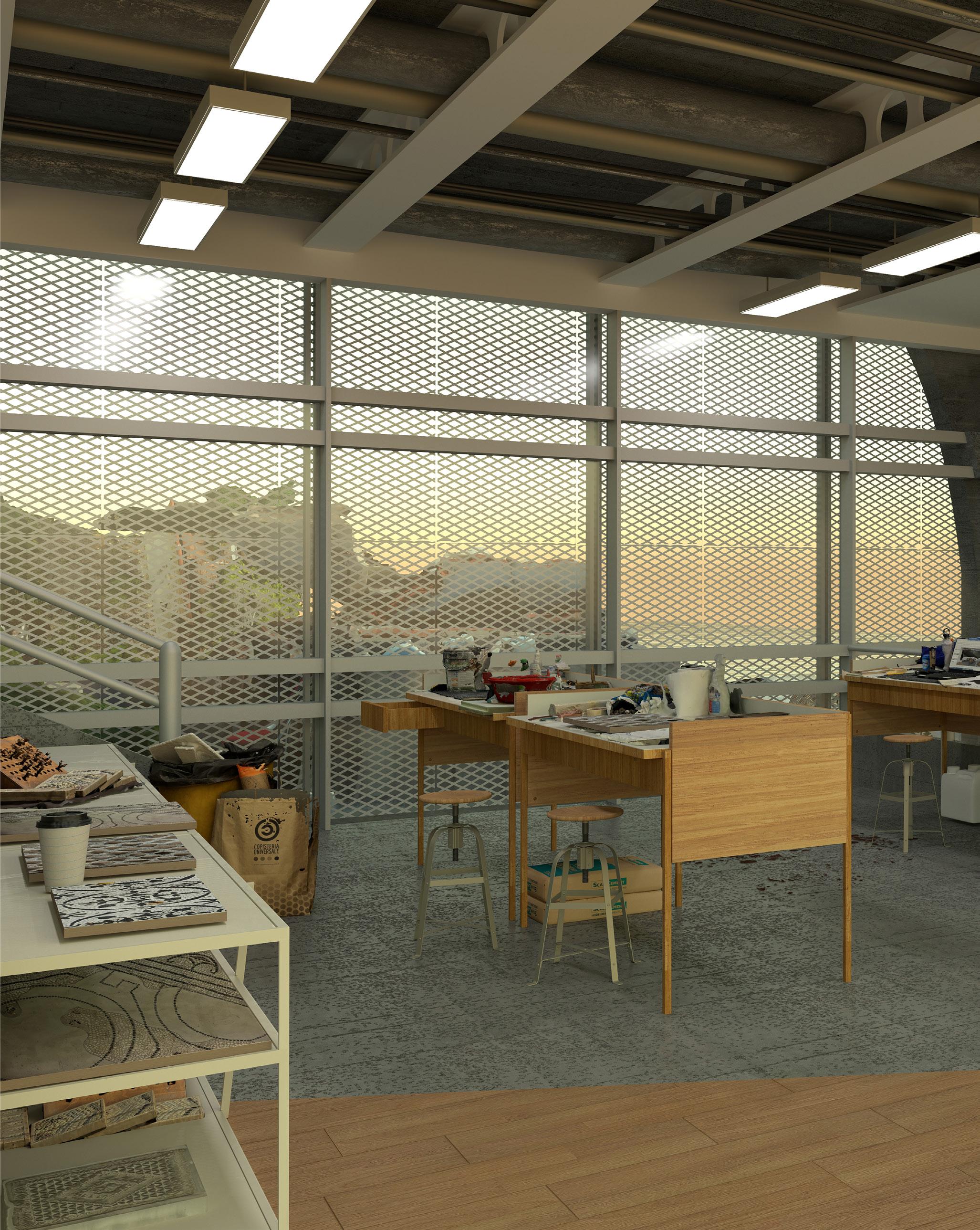 The real studio desks of students in Syracuse Architecture were scanned using photogrammetry and imported into the final render in order to better imagine what the studio space could be like in the peak of an artist’s visit.