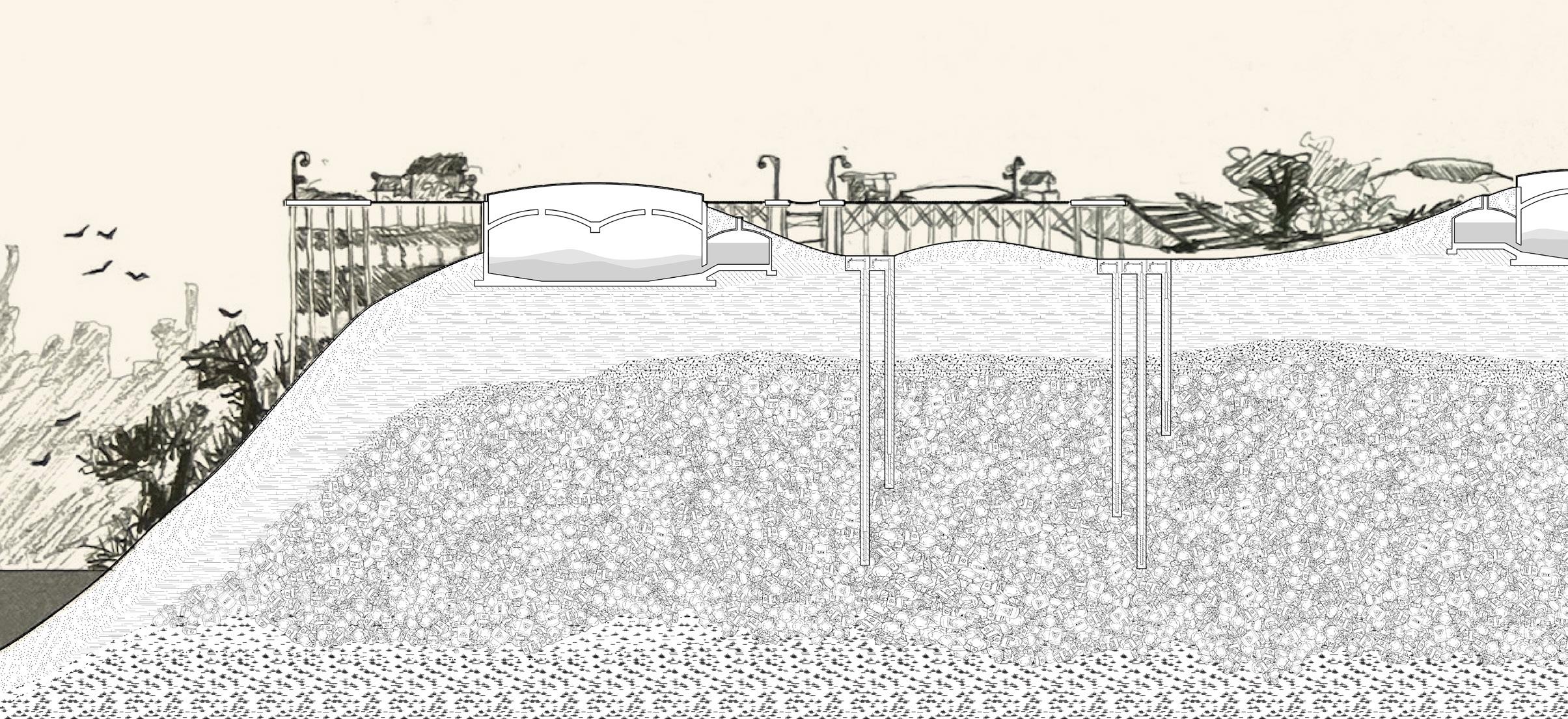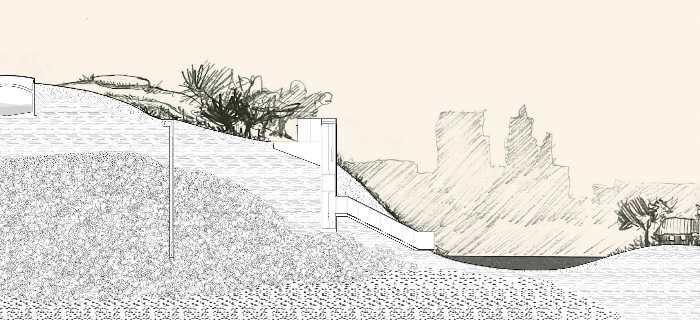 Site Section (top) and close-ups (bottom) Rhino, Adobe Illustrator, Hand Drawings