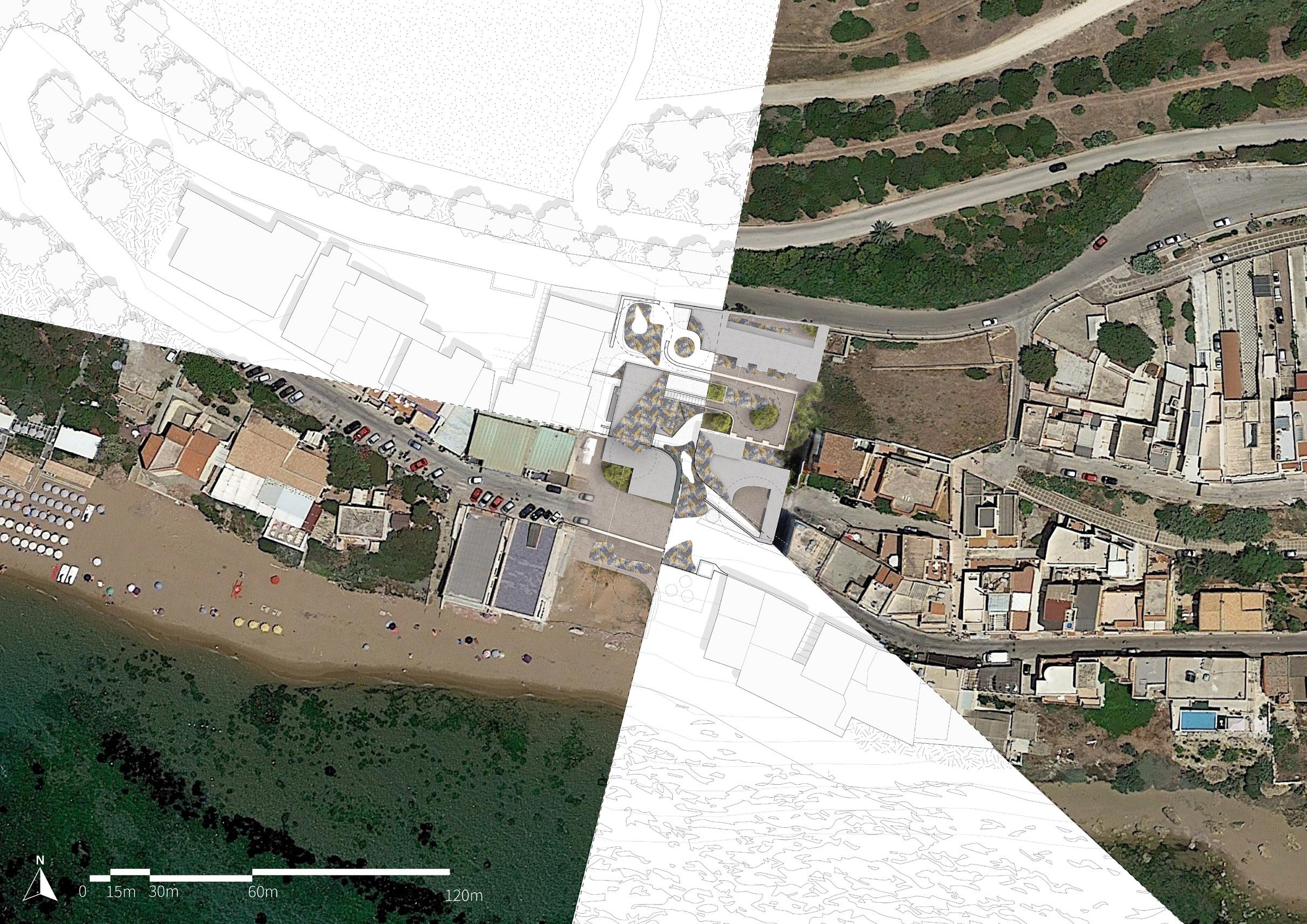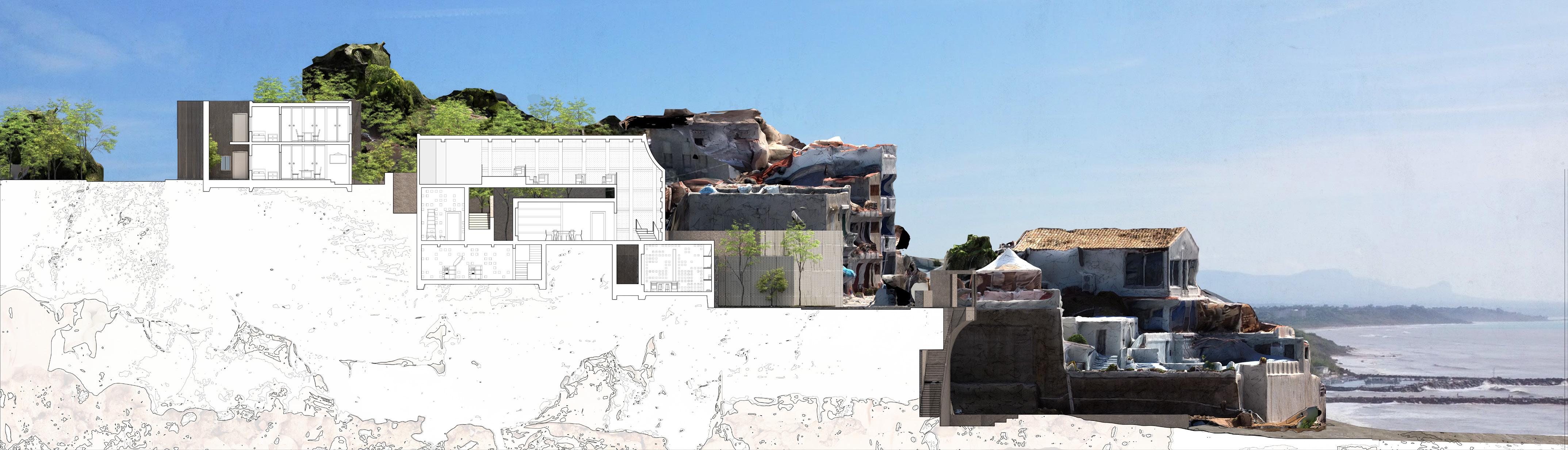Site Plan (top left), Plan (top right), Site Section (bottom) Rhino, V-Ray, Adobe Photoshop, Adobe Illustrator, Photogrammetry