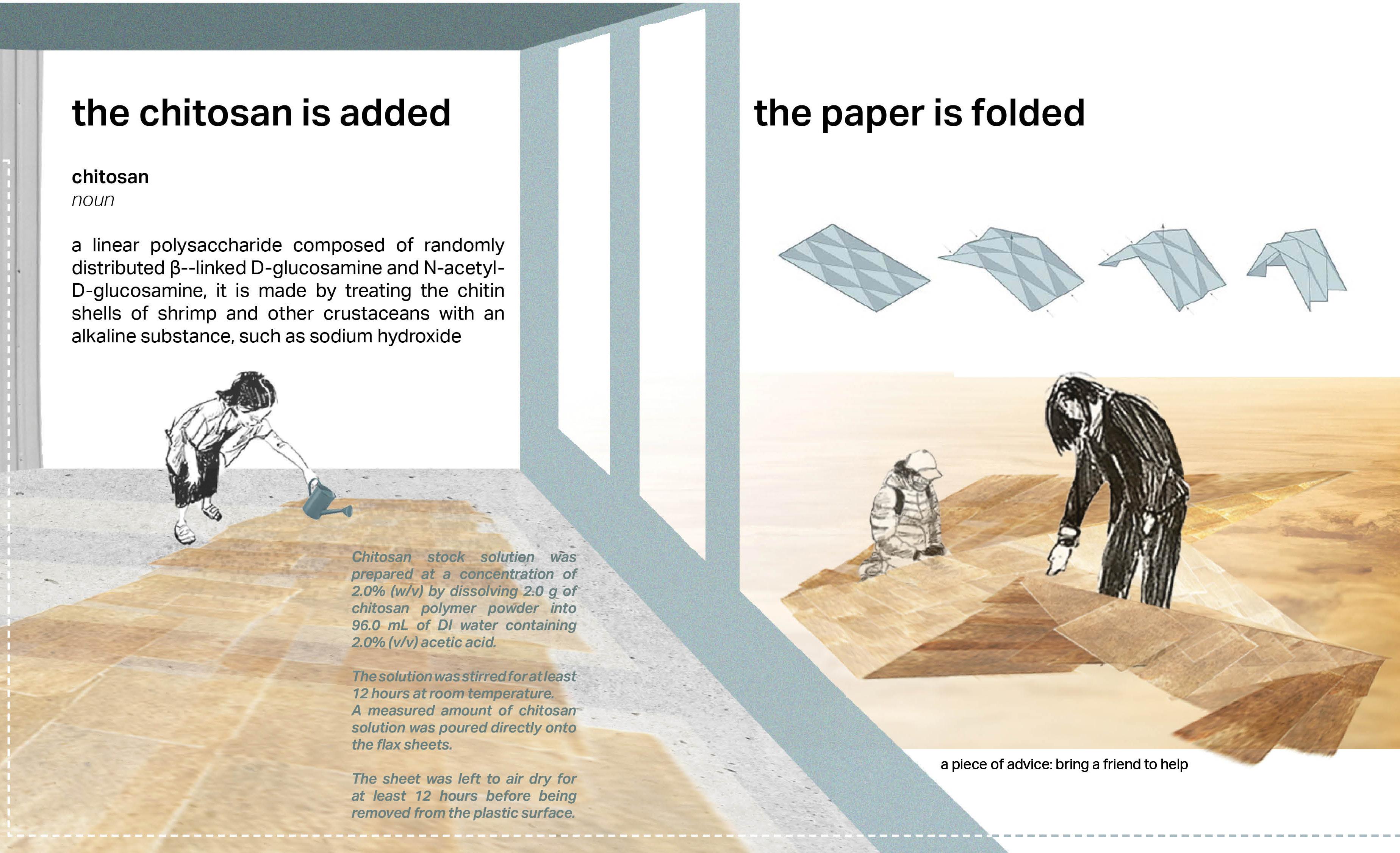 Usingchitosan,achemicalsubstancederivedfromtheshellsofshellfish,achitosansolution wasmadebydissolvingchitosanpowderinalow-concentrationacidicsolution.Thissolution waspouredontothepaperanddried.Asthesolutionevaporated,thechitosanwasleftbehind andcreatedatransparentplastic-likefilmoverthefibers,strengtheningthesheetofpaper.