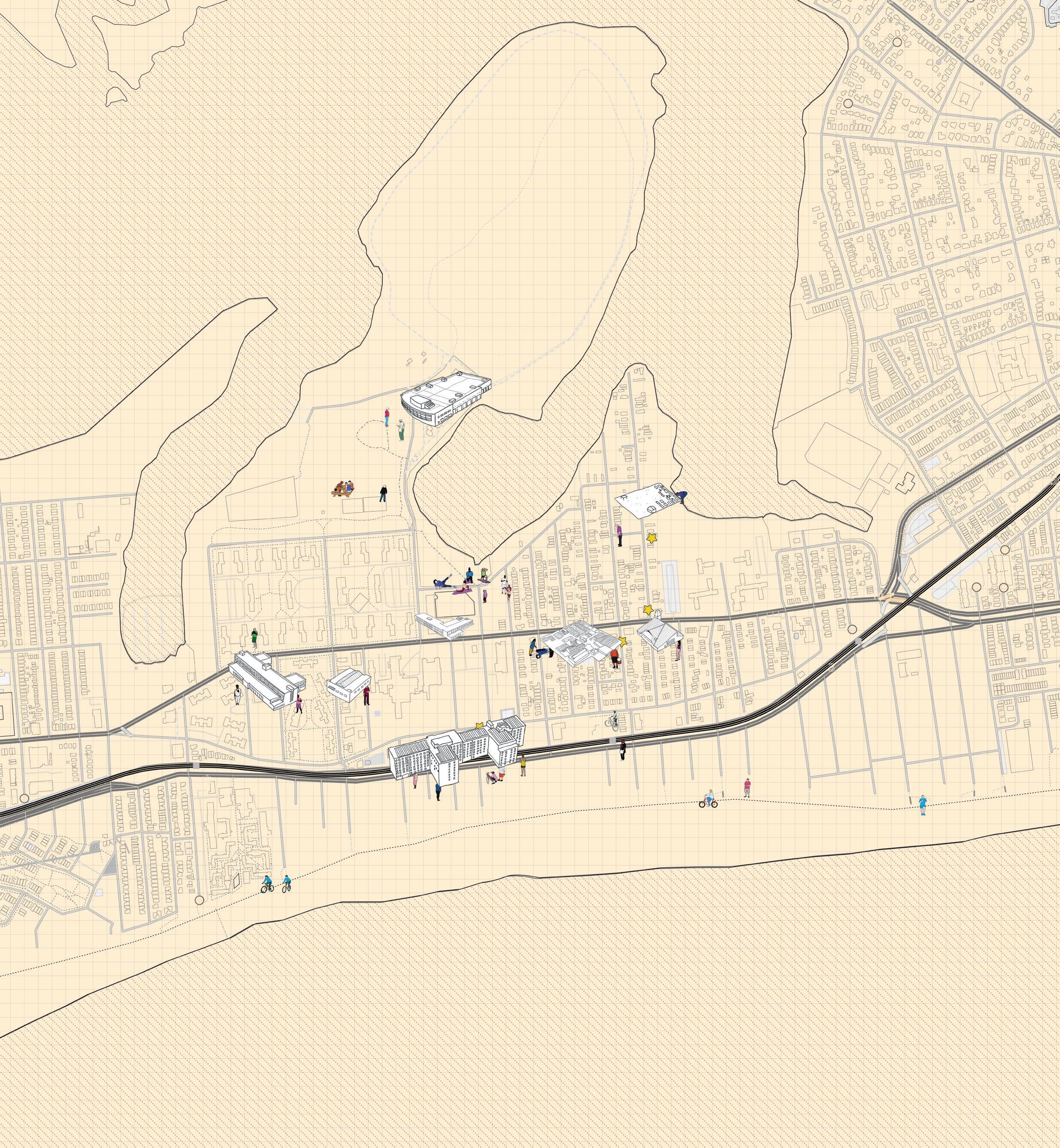 This location offers the opportunity to design for the local population and to utilize renewable energy. Gas retraction systems can create energy in the present from the methane buildup already within the landfill, and biogas digestors will give future waste the opportunity to be made into energy as well. Reconstructing Roots is an urban design project that redesigns the empty landfill to include a renewable energy plant, a public park with viewing platforms, and a memorial to the lost community.
