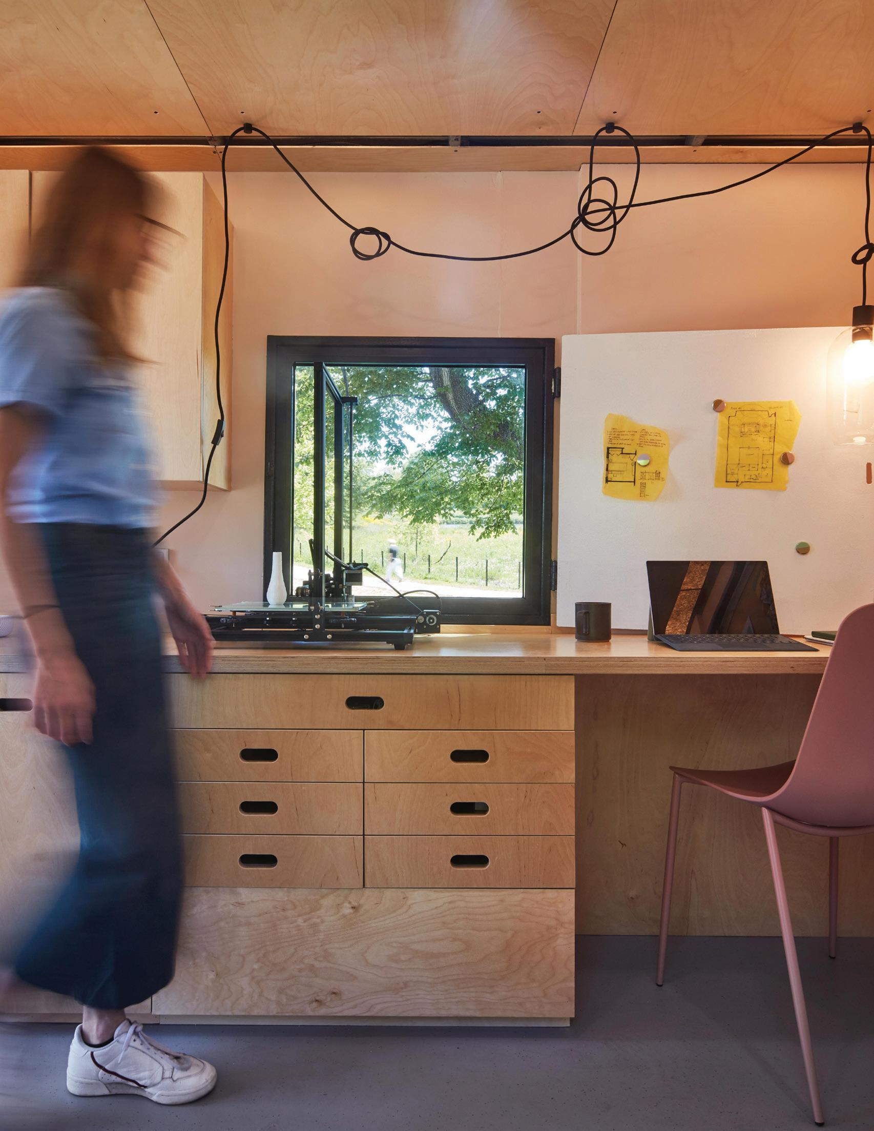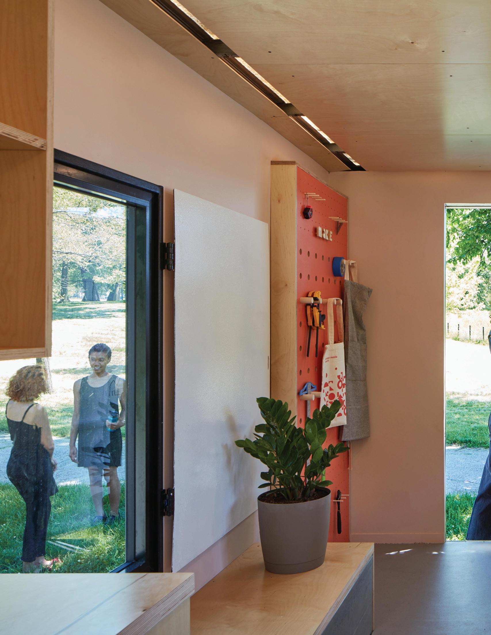 The Chicago Mobile Makerspace is a retired United States Postal Service delivery van that has been converted into a classroom, tool shop, design studio, gallery, and community gathering space. It provides storage for power tools, hand tools, drawing and modeling materials, laptops, and larger machinery like a laser cutter and 3D printer. The Mobile Makerspace is able to power any tool needed through its boosted electrical system, which includes four solar panels on the roof. Although the Mobile Makerspace is small, the space feels roomy and comfortable. The interior features birch plywood custom cabinetry, a custom pegboard and message board, magnetic whiteboards, soft seating, large windows, and a desk. The color scheme is warm and inviting while complementing the main brand color.