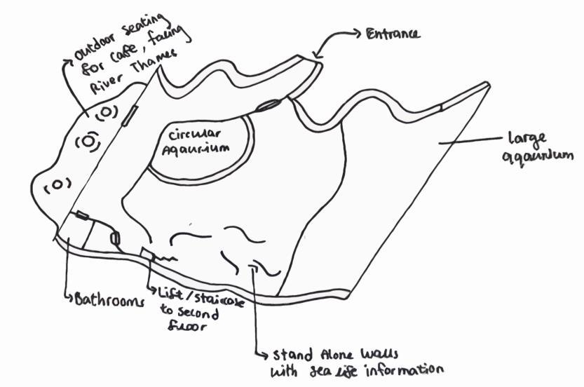 Another way in which my final model was able to match my brief was that it was a requirement that my aquarium was shorter in length in comparison to the surrounding skyscrapers of Canary Wharf. However, to successfully do so without making it seem out of place I had to research into a few aquariums of different sizes to visually observe what an architecturally successful aquarium looks like. My secondary research has informed my final decision to create a mixture of both short and taller aquariums by creating different levels that are distinguishable from the exterior, providing a contrast to the surrounding buildings with the shorter department while also creating a blend with the tallest point of the aquarium.