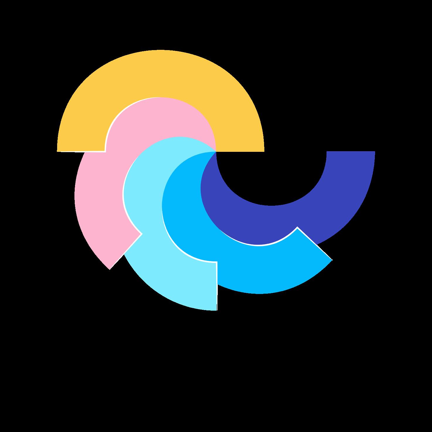 The background of the badge is a geometric pattern made of overlapping semi-circles in the brand colours at 80% transparency against black, as well as elements of the logo. The fonts used are Gilroy Heavy and Gilroy ExtraBold.