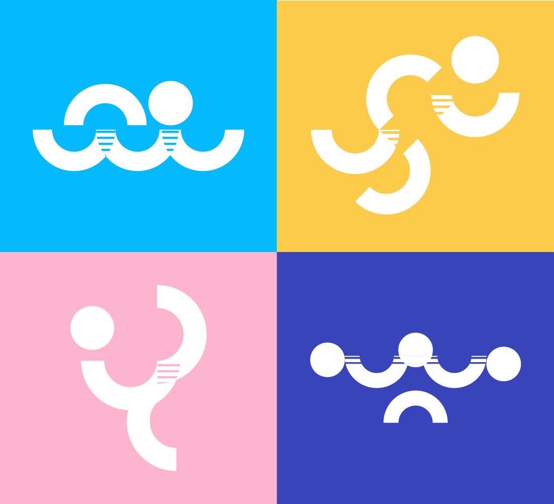 The pictograms use exclusively the same shapes as the logo, hence only circles and semi-circles. This poses a challenge when trying to represent certain sports poses but also aims to contribute to a cohesive visual language.