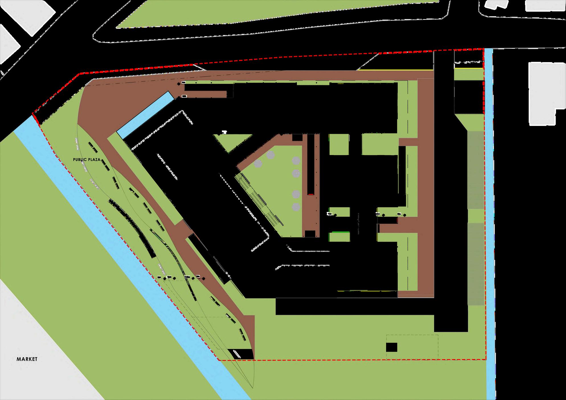 dragline plaza responding to possible flooding and enhancing space heat island reduction through cross ventilation and evaporative cooling techniques