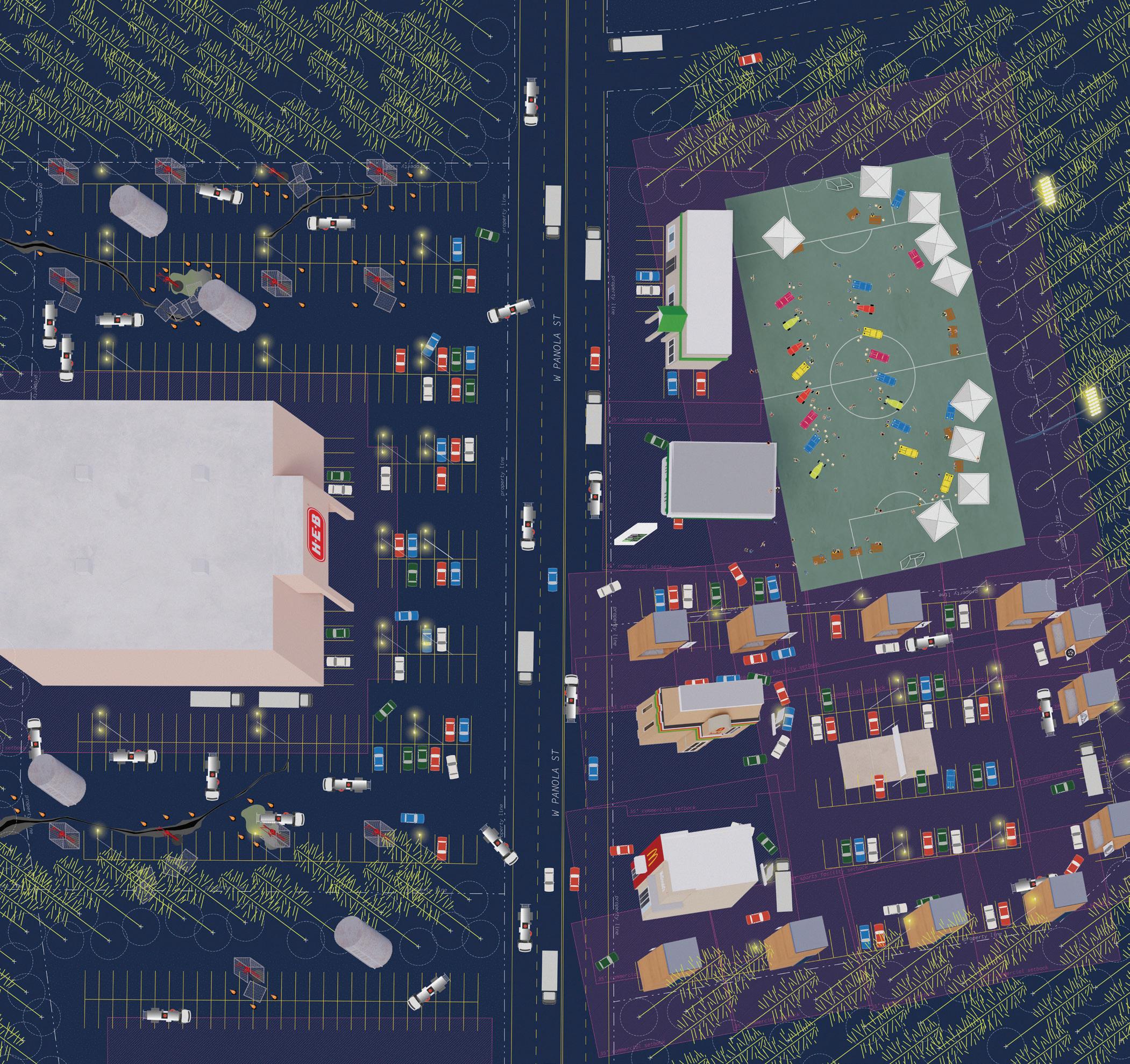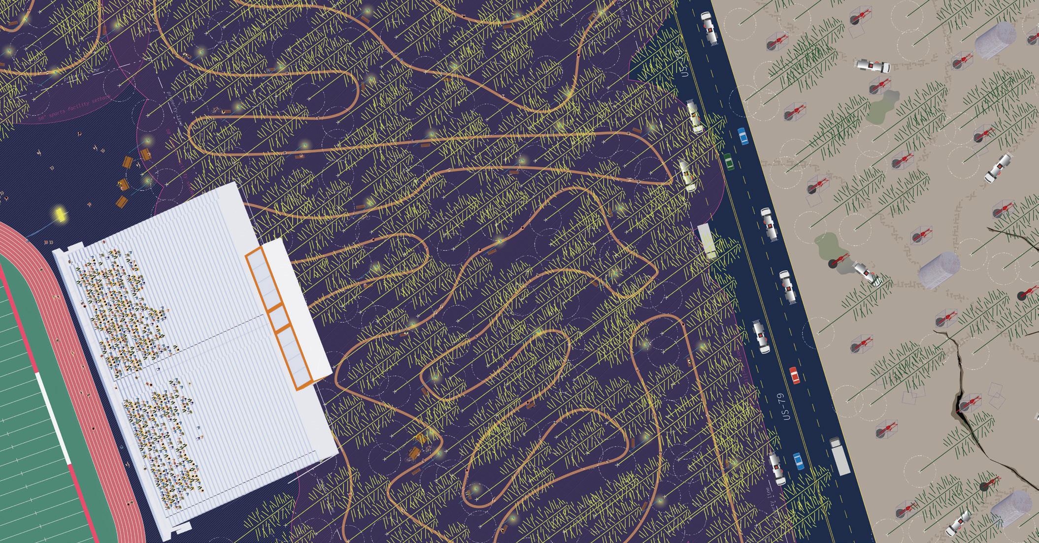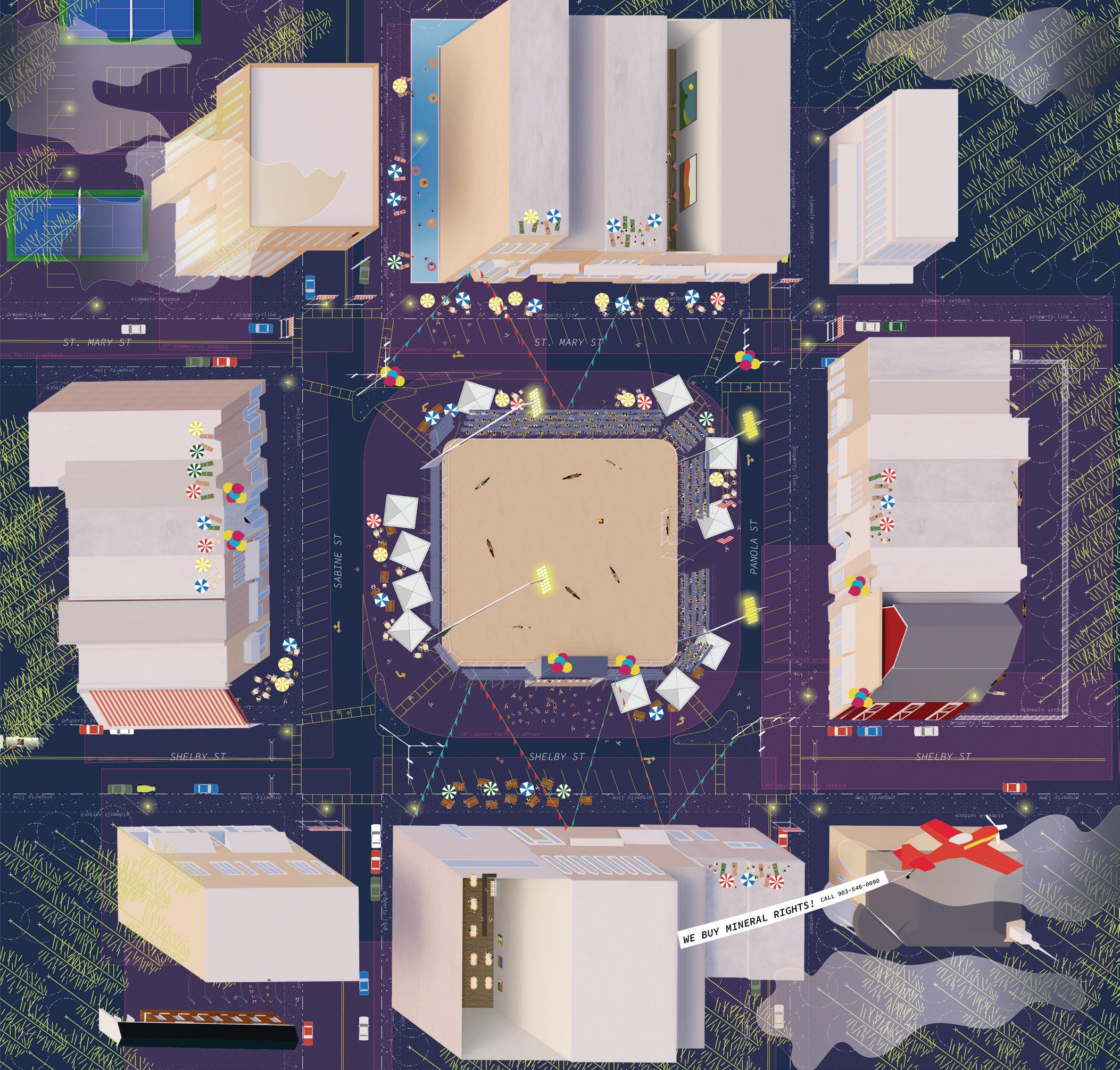 In the imagined future, fracking booms in the United States again. A new advent of fracking requires more injection wells for wastewater from fracking processes.With climate change and drought looming, many states under pressure to recycle wastewater tighten regulations on drilling new injection wells. In order to accommodate the volume of fracking wastewater produced in-state and imported from out-ofstate, Texas permits more injection sites without restraint. Several years later, the ground of Texas becomes more unstable from increased fluids and increased fluid pressure of high-density injections, creating seismic activity. In Carthage, a small town in East Texas, many residents use zoning loopholes to block injection wells in their own backyards; since many homeowners have sold their mineral rights, their only recourse is to densify the town with accessory structures and leave no space for injection wells. Neighbors form community land trusts to prevent injection wells in the town’s green spaces. Strategic accessory guesthouses and sporting facilities quickly fill the town, sometimes turning private backyards into semi-public spaces and commercial strips into informal drive-through markets.